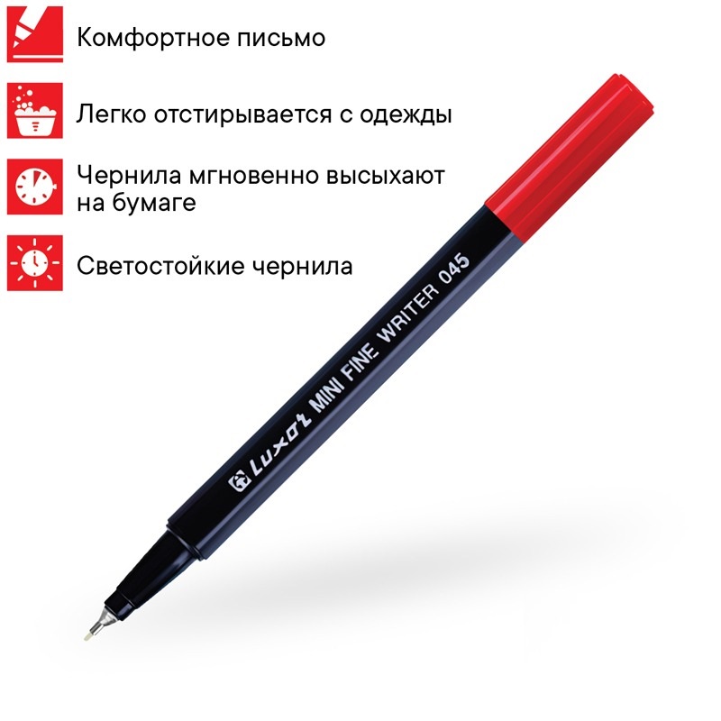 Особенность капиллярных ручек Luxor – это умение подстраиваться под силу нажима, из-за чего напряжение на руку при письме не ощущается. Изделия пишут тонкой равномерной линией, оставляя контрастный след. Наконечник изготавливается из твёрдого пластика, благодаря чему обеспечивается одинаковая толщина линий при разных наклонах ручки.