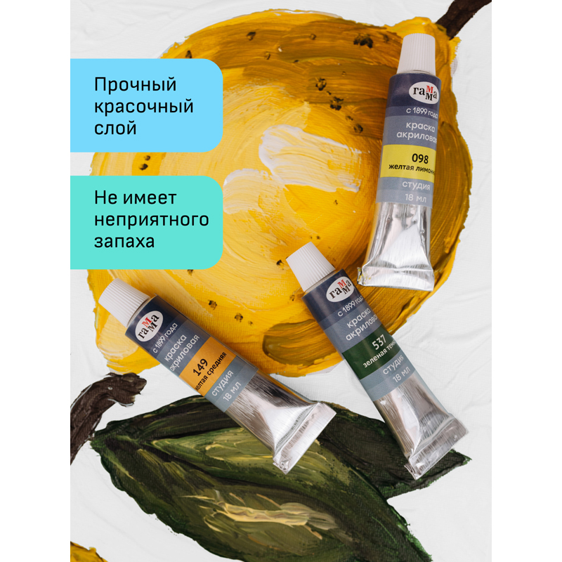 Набор акриловых красок ГАММА серии «Студия» состоит из 12 шт в тубах, объёмом 18 мл. Краски предназначены для художественно-живописных и декоративно-прикладных работ.
