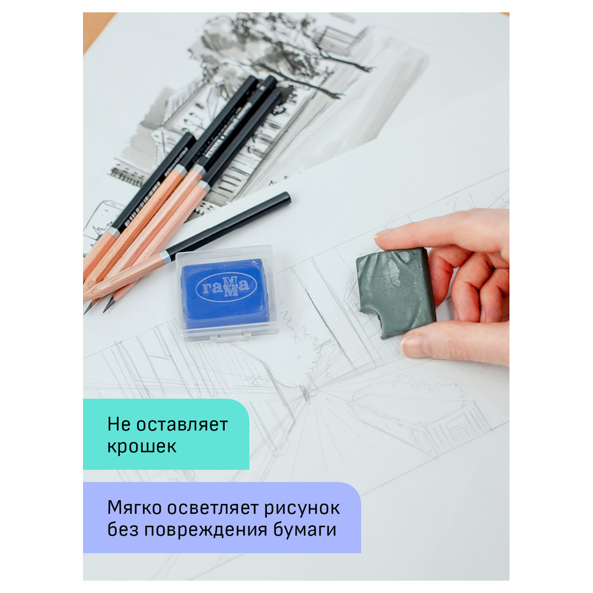 Ластик мягко снимает графит и уголь, осветляет рисунок без повреждения бумаги, не оставляя крошек. Он очень пластичный и легко разминается. Упакован в пластиковый футляр для комфортного хранения и транспортировки. Перед применением необходимо размять.