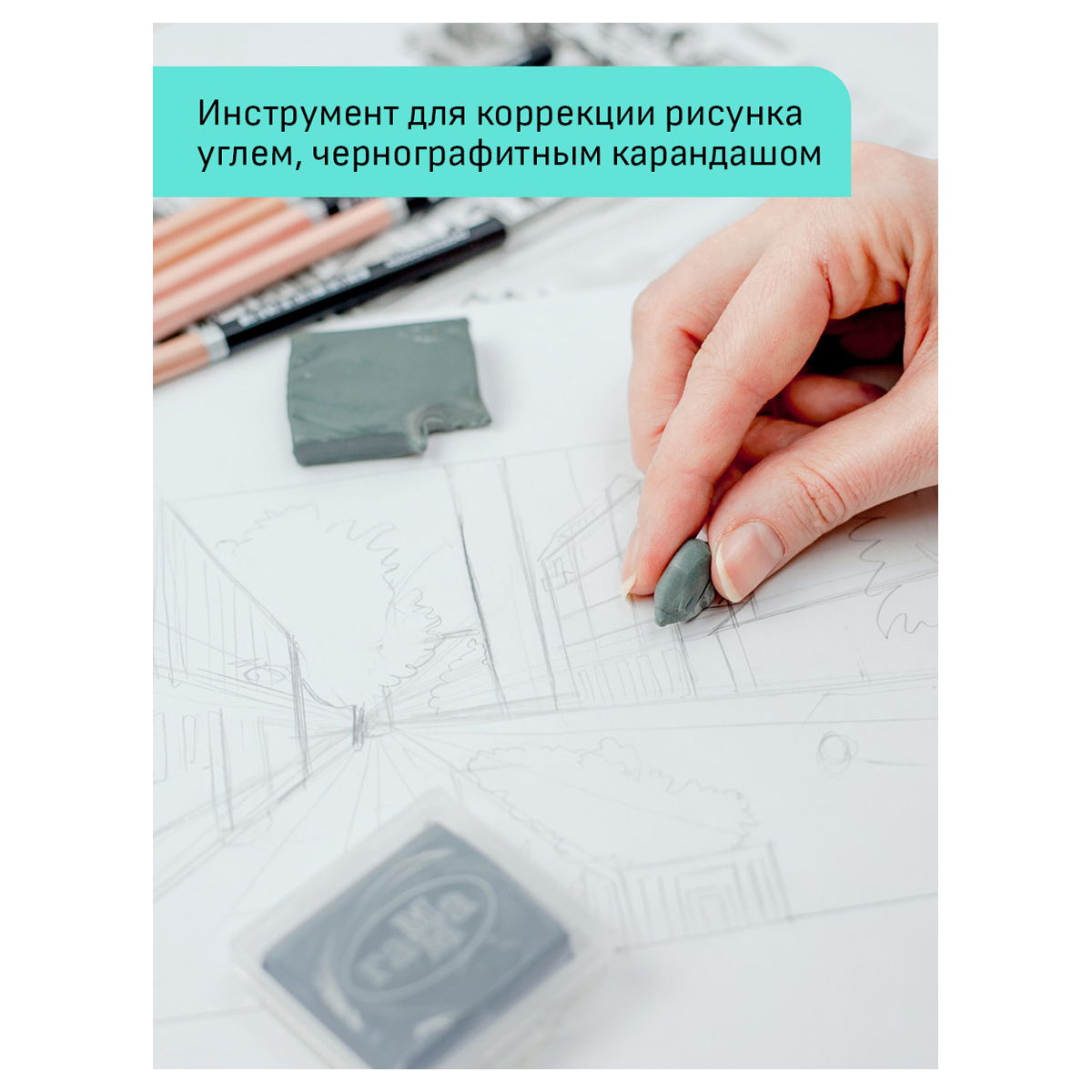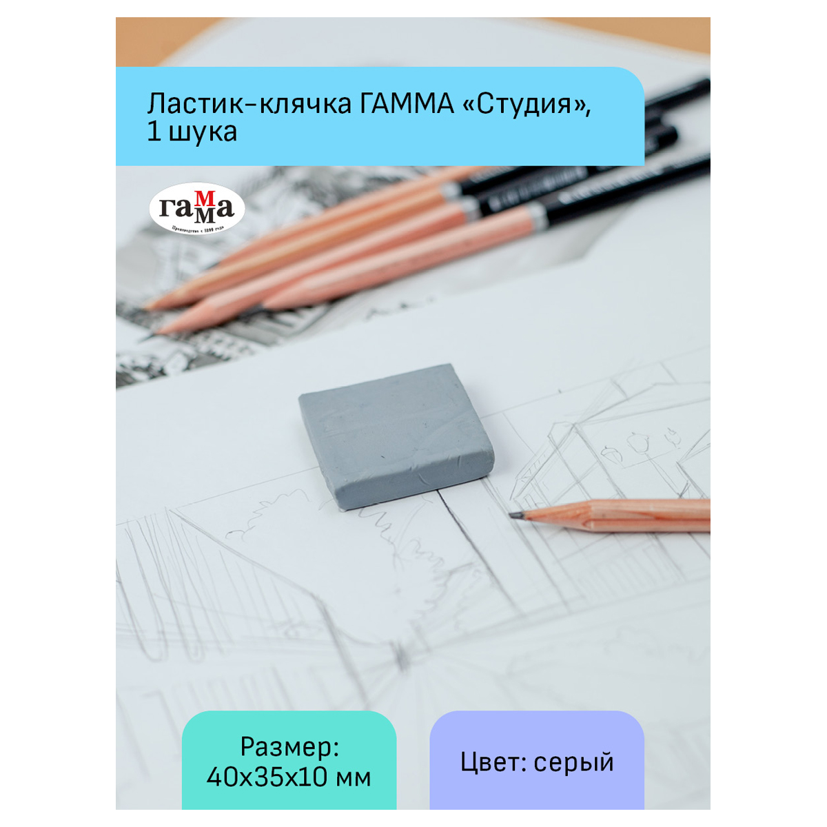 Ластик-клячка «Студия» – инструмент для коррекции рисунка углем, чернографитным карандашом. Размер одного ластика прямоугольной формы – 40*35*10 мм. Ластик серого цвета изготовлен из каучука.