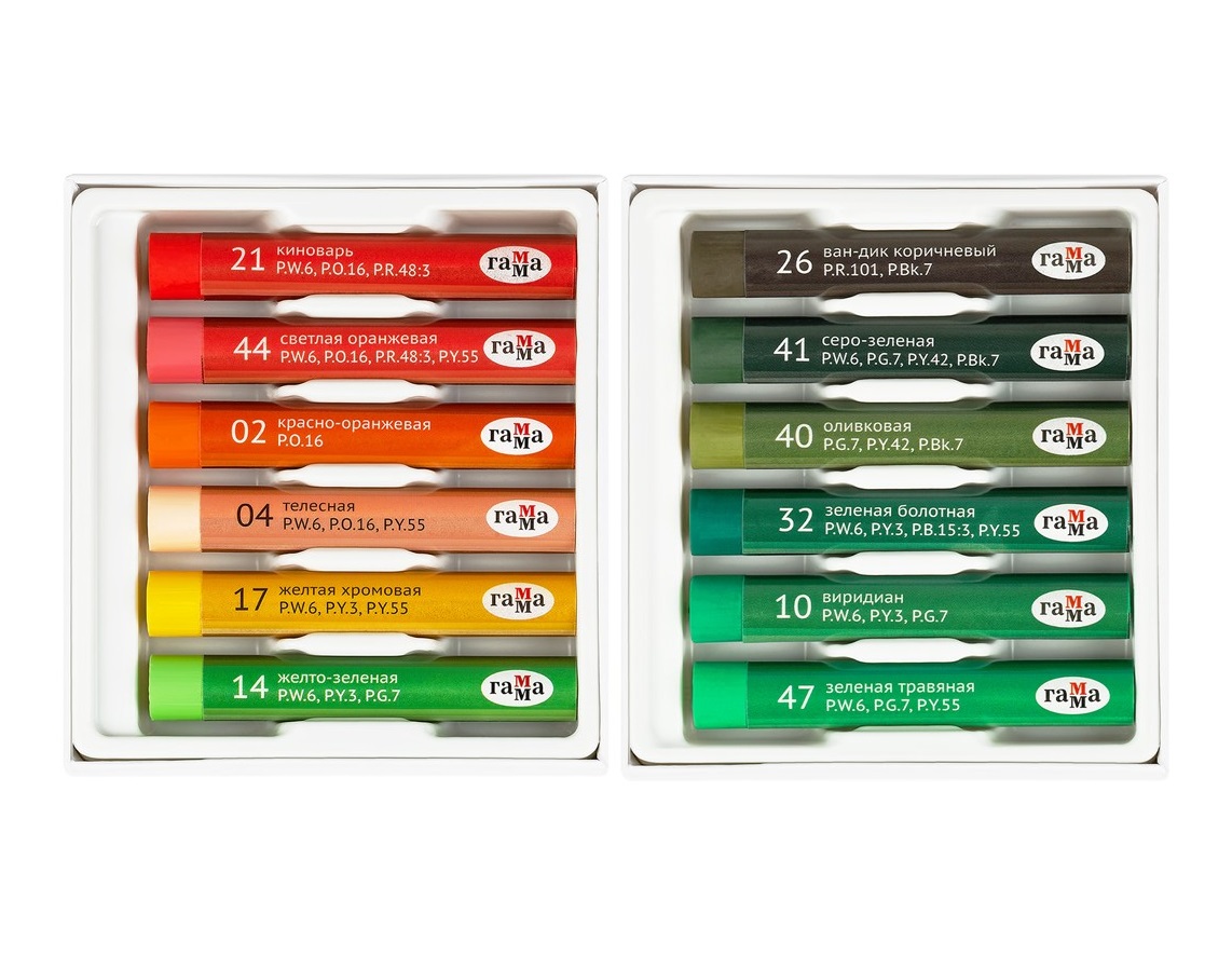 Масляная пастель «Студия» изготовлена на основе тонкотертых пигментов и минерального масла. Оставляет мягкий штрих, легко растушевывается. Яркие насыщенные цвета легко смешиваются, не светлеют и не темнеют со временем. Масляная пастель рисует на поверхностях разных фактур, не осыпается и не требует использования закрепителя краски. В наборе двенадцать мелков увеличенного диаметра.