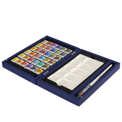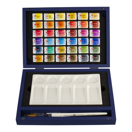 Набор акварели "Белые Ночи", 36шт х 2,5 мл., кисти, фарфоровая палитра, синее дерево