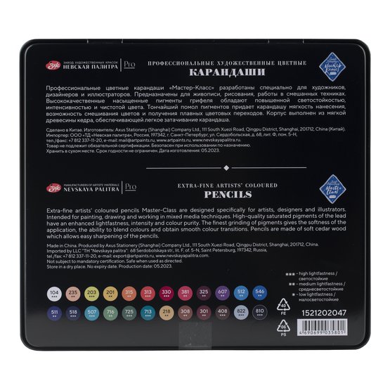 Цветные карандаши «Мастер-Класс» разработаны специально для художников, дизайнеров и иллюстраторов. Предназначены для живописи, рисования, работы в смешанных техниках. Высококачественные насыщенные пигменты грифеля обладают повышенной светостойкостью, интенсивностью и чистотой цвета. Тончайший помол пигментов придает карандашу мягкость нанесения, возможность смешивания цветов и получения плавных цветовых переходов. Корпус выполнен из мягкой древесины кедра, обеспечивающей легкое затачивание карандаша.
