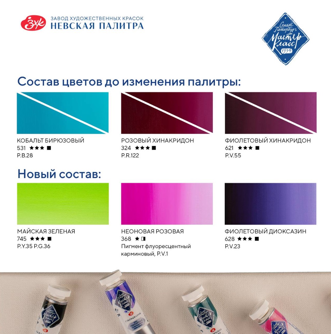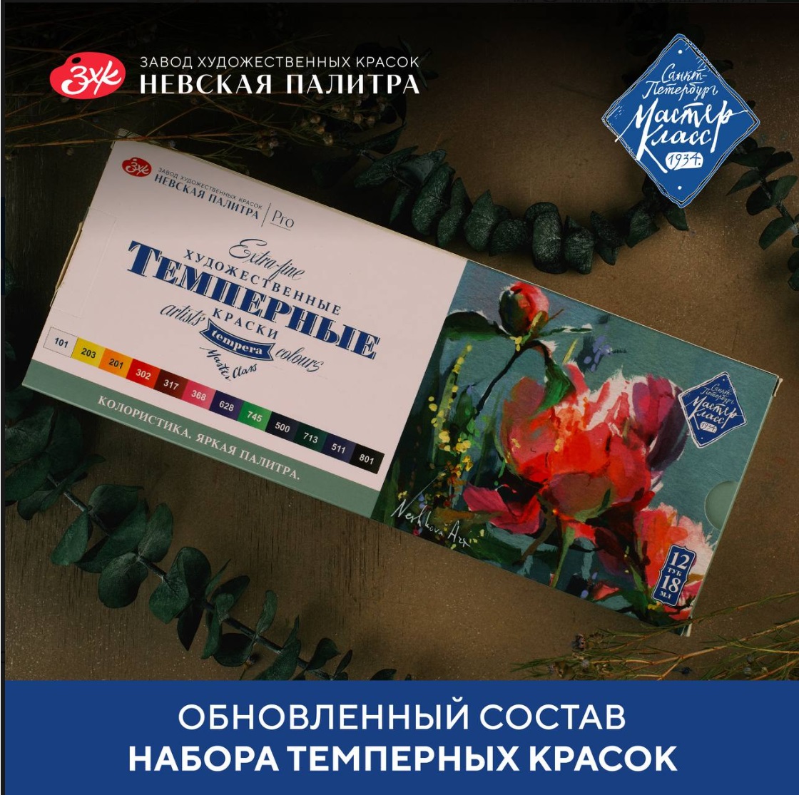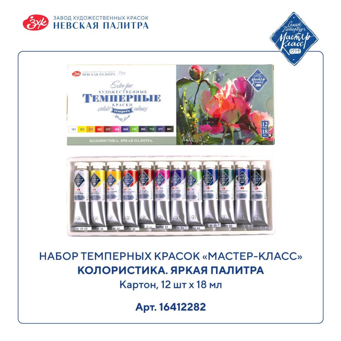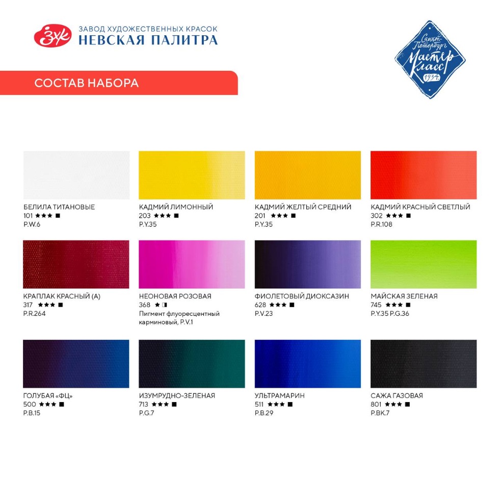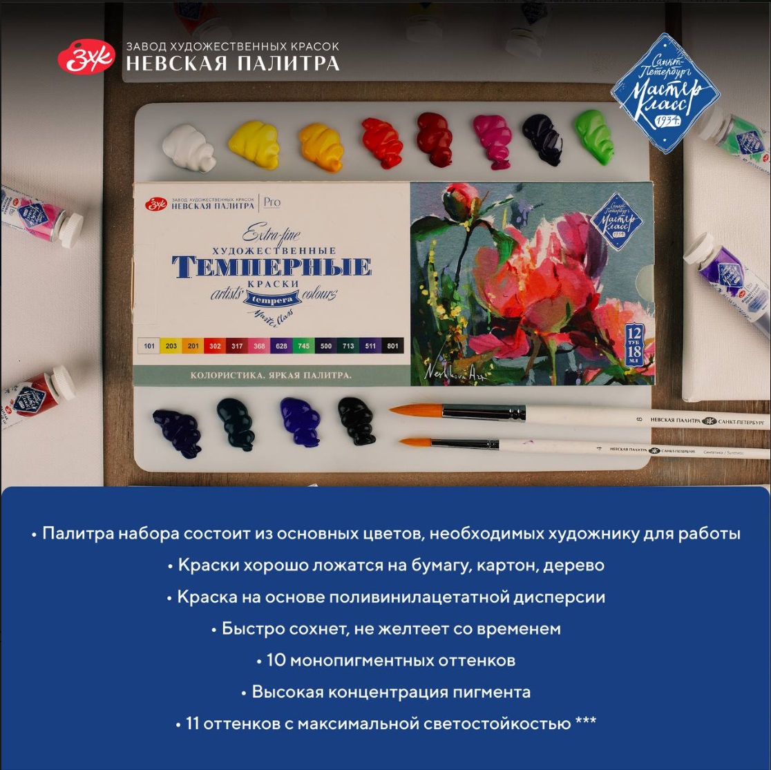 Художественные темперные поливинилацетатные краски «Мастер-Класс» изготавливаются на основе органических и неорганических пигментов и поливинилацетатной дисперсии и являются традиционным материалом для живописи.