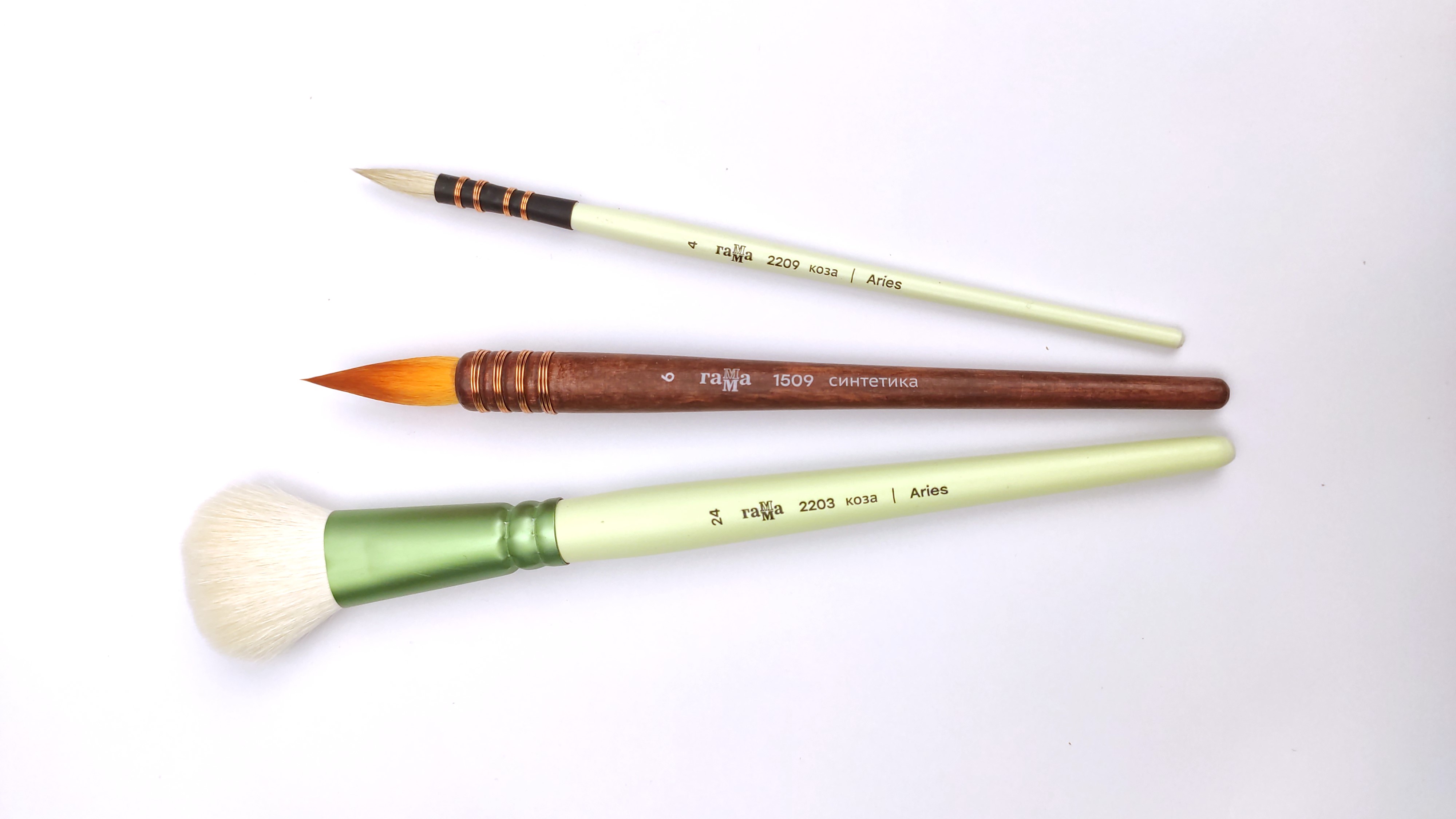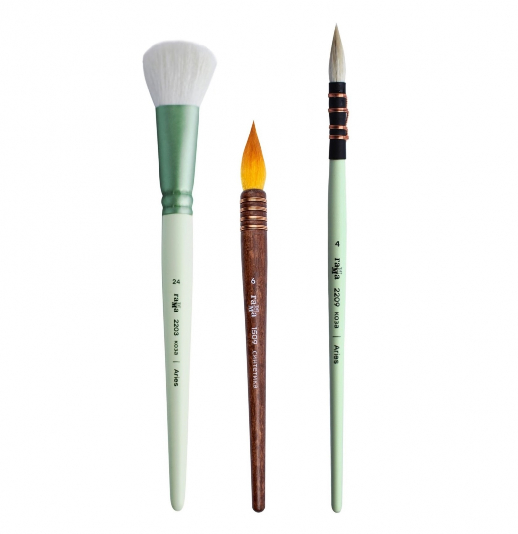 художественную кисть для каллиграфии и акварельной живописи с французским креплением № 6, круглую кисть из белой козы с французским креплением № 4 и овальную кисть той же серии со стандартным креплением № 24.