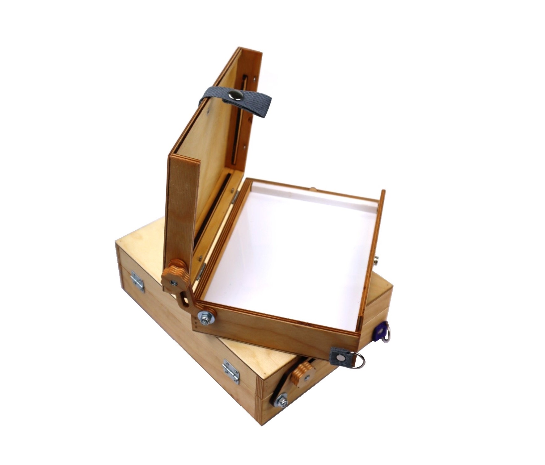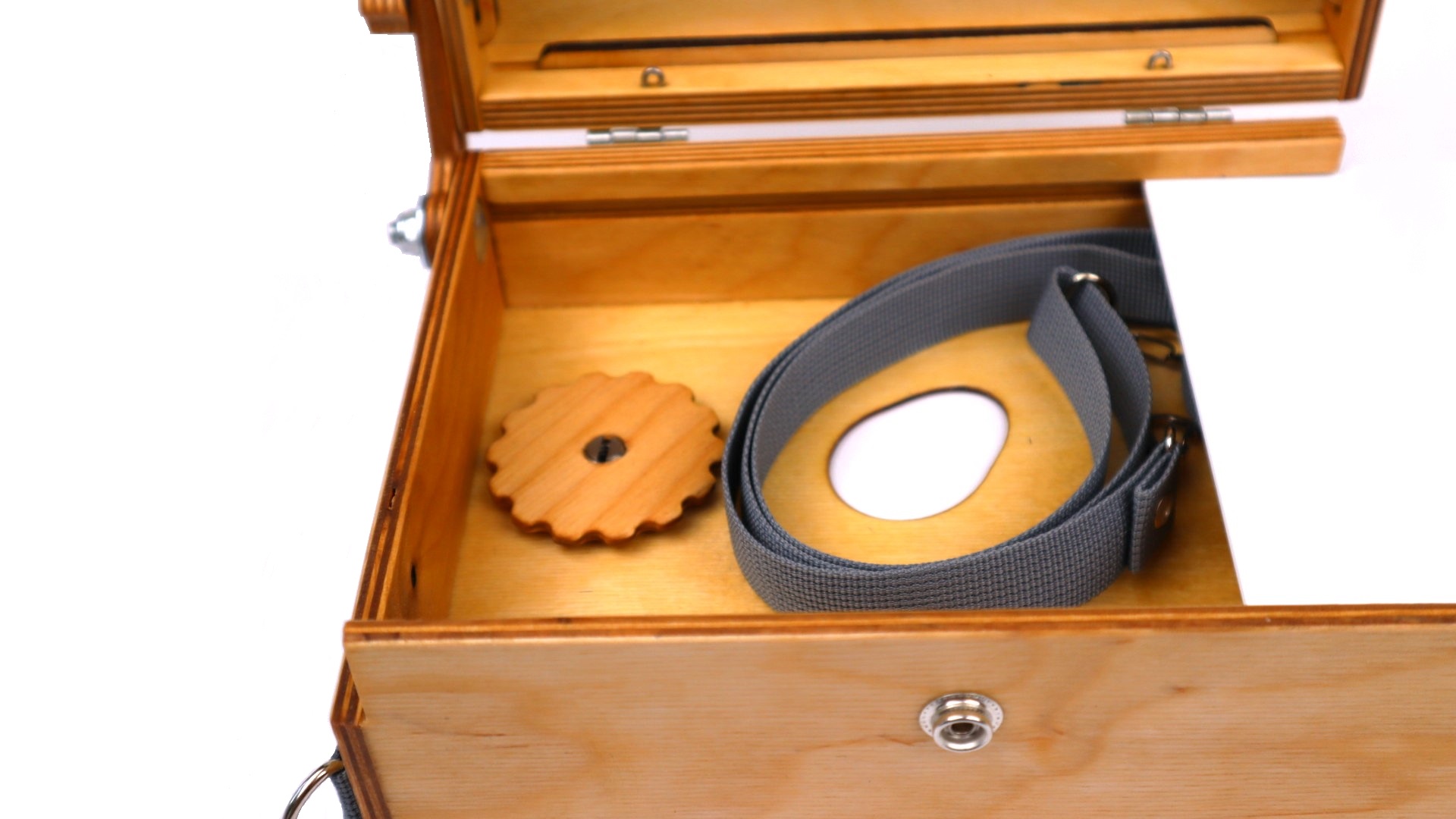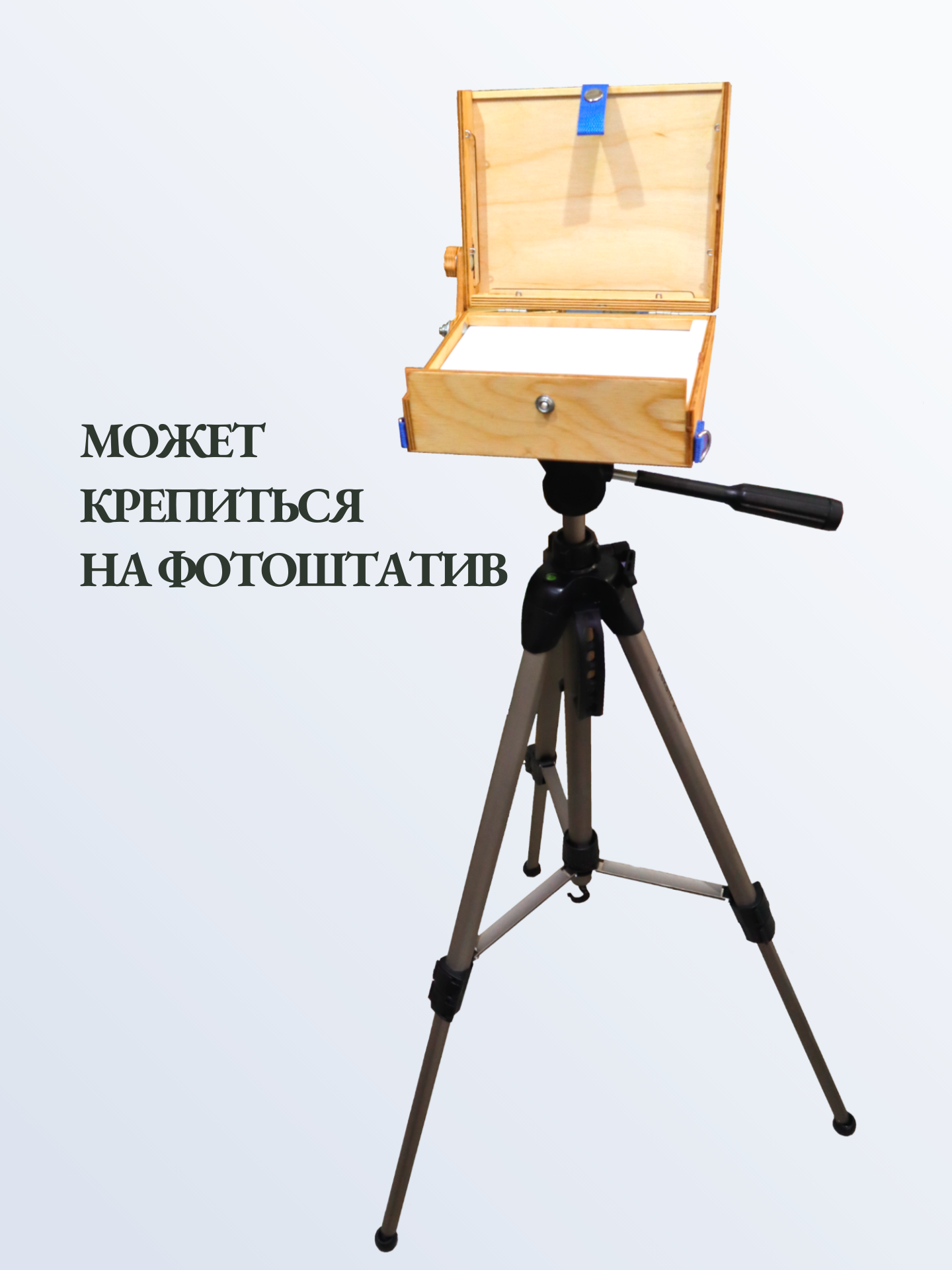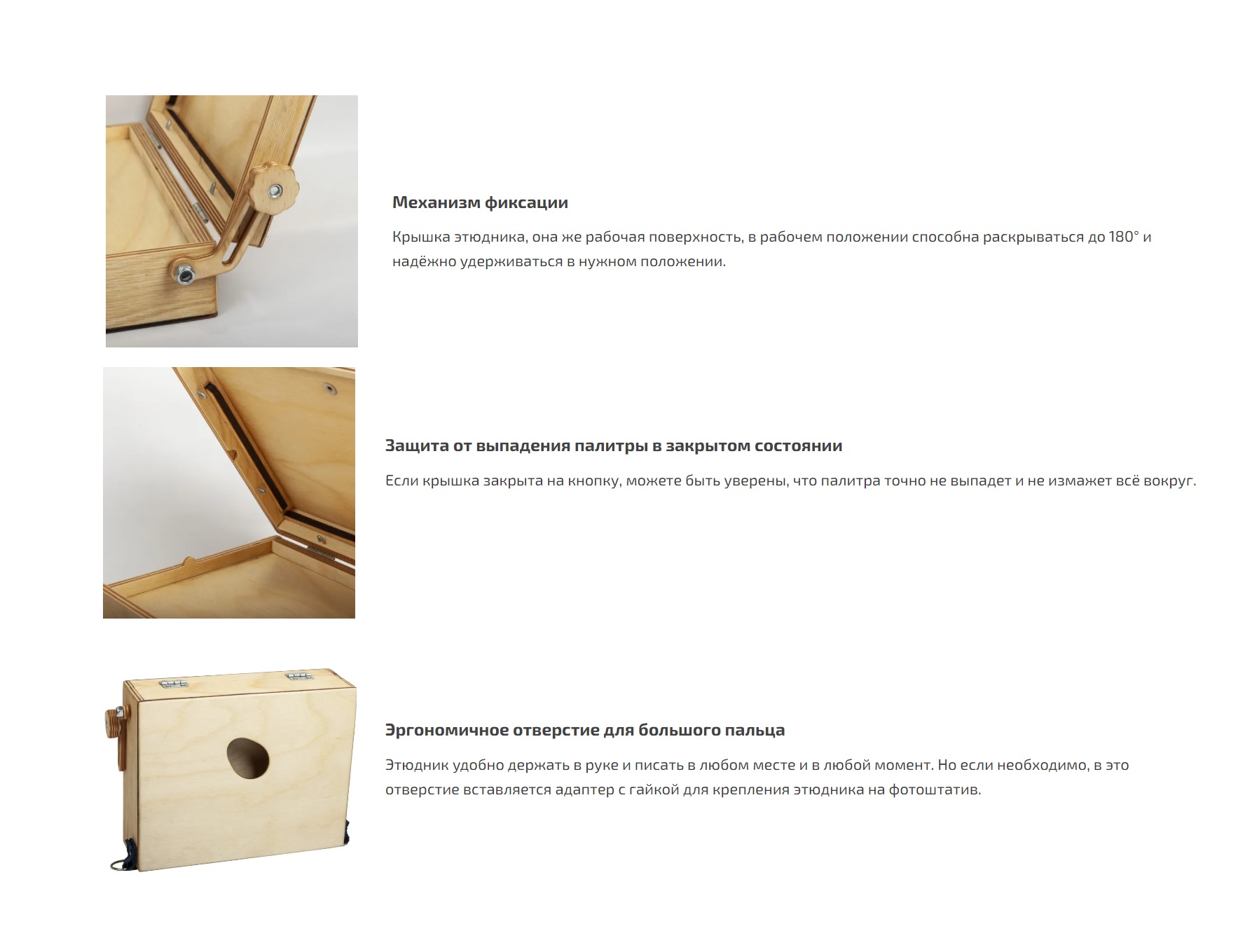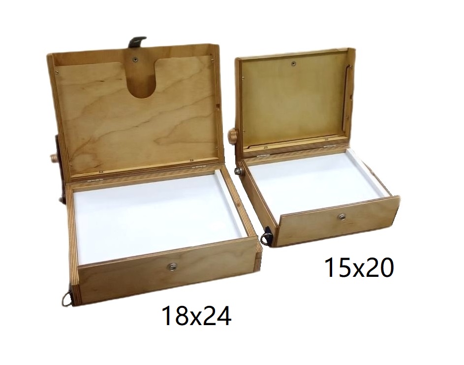 В комплекте также имеется специальная заглушка с гайкой для крепления на штатив. В крышке этюдника предусмотрены пазы для двух сырых работ. Крышка может открываться до 180° и фиксируется гайкой с удобной рукояткой.