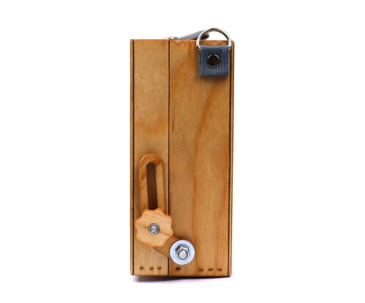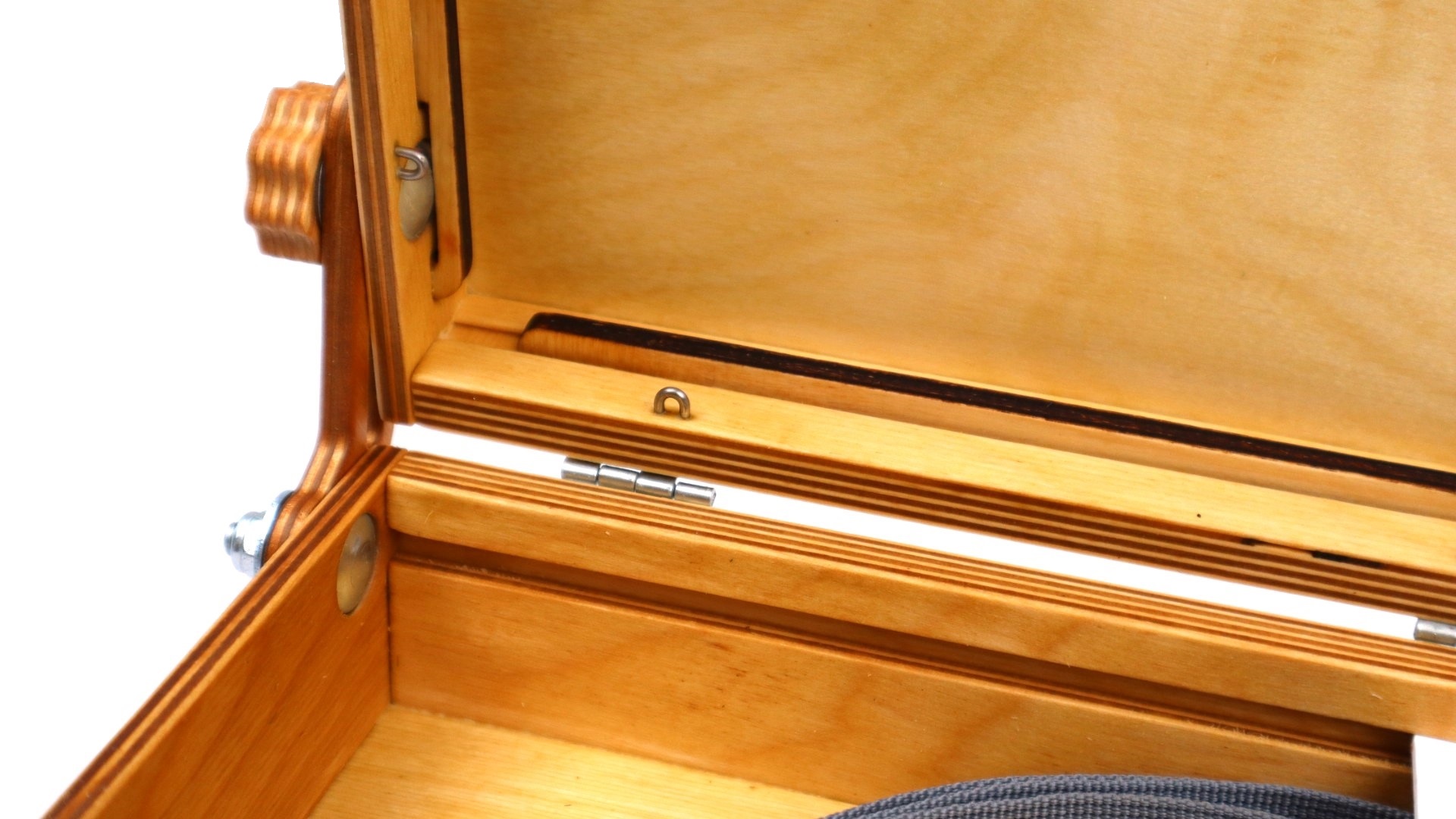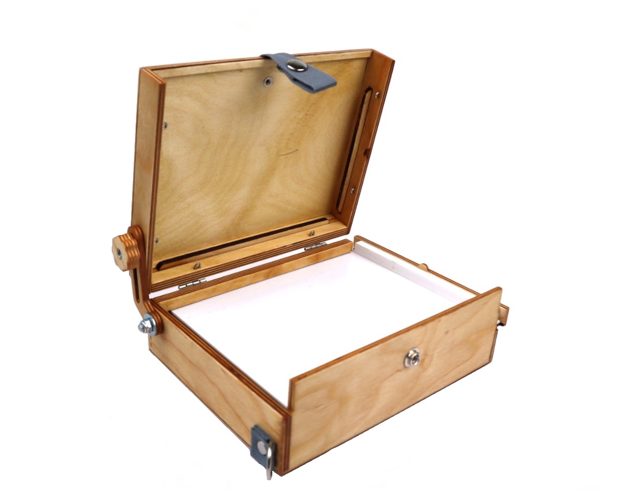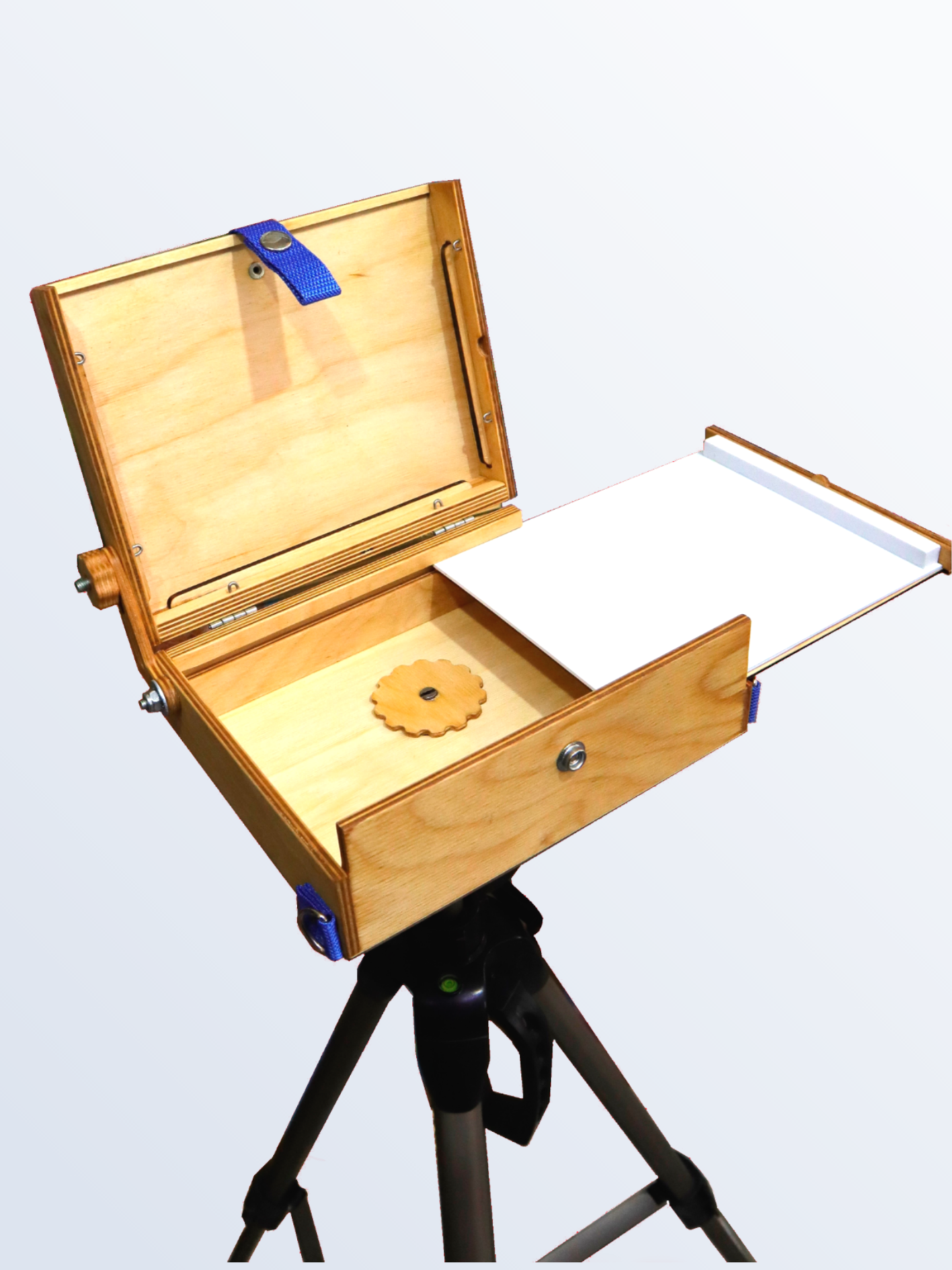 В комплекте также имеется специальная заглушка с гайкой для крепления на штатив. В крышке этюдника предусмотрены пазы для двух сырых работ. Крышка может открываться до 180° и фиксируется гайкой с удобной рукояткой.