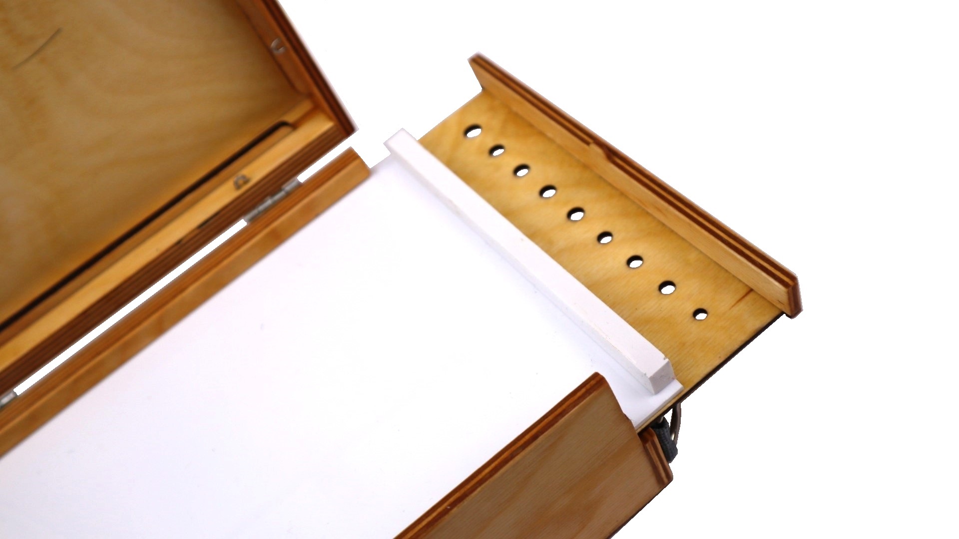 В этой версии этюдника добавлена белая пластиковая палитра, поверх деревянной. Это позволит быстро и комфортно очищать палитру от красок в конце работы.