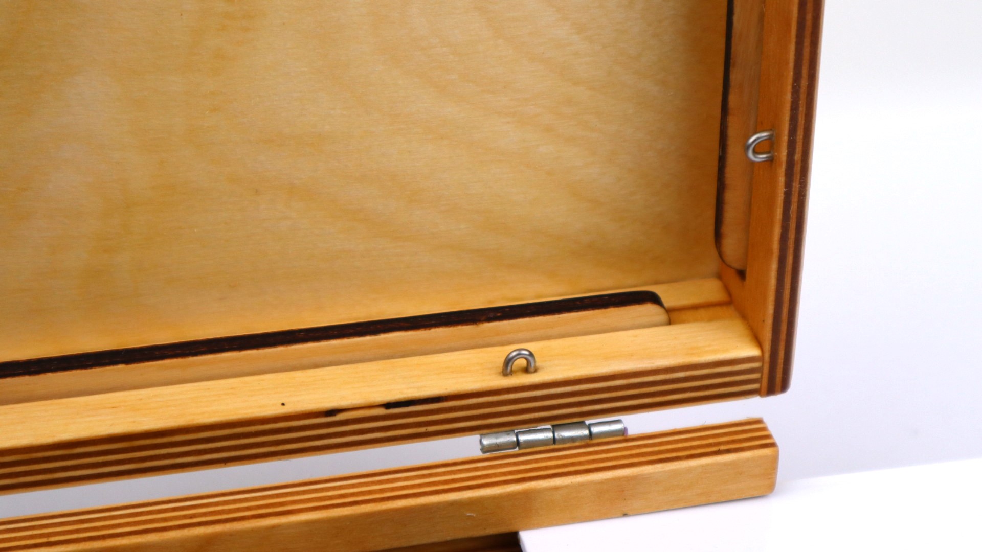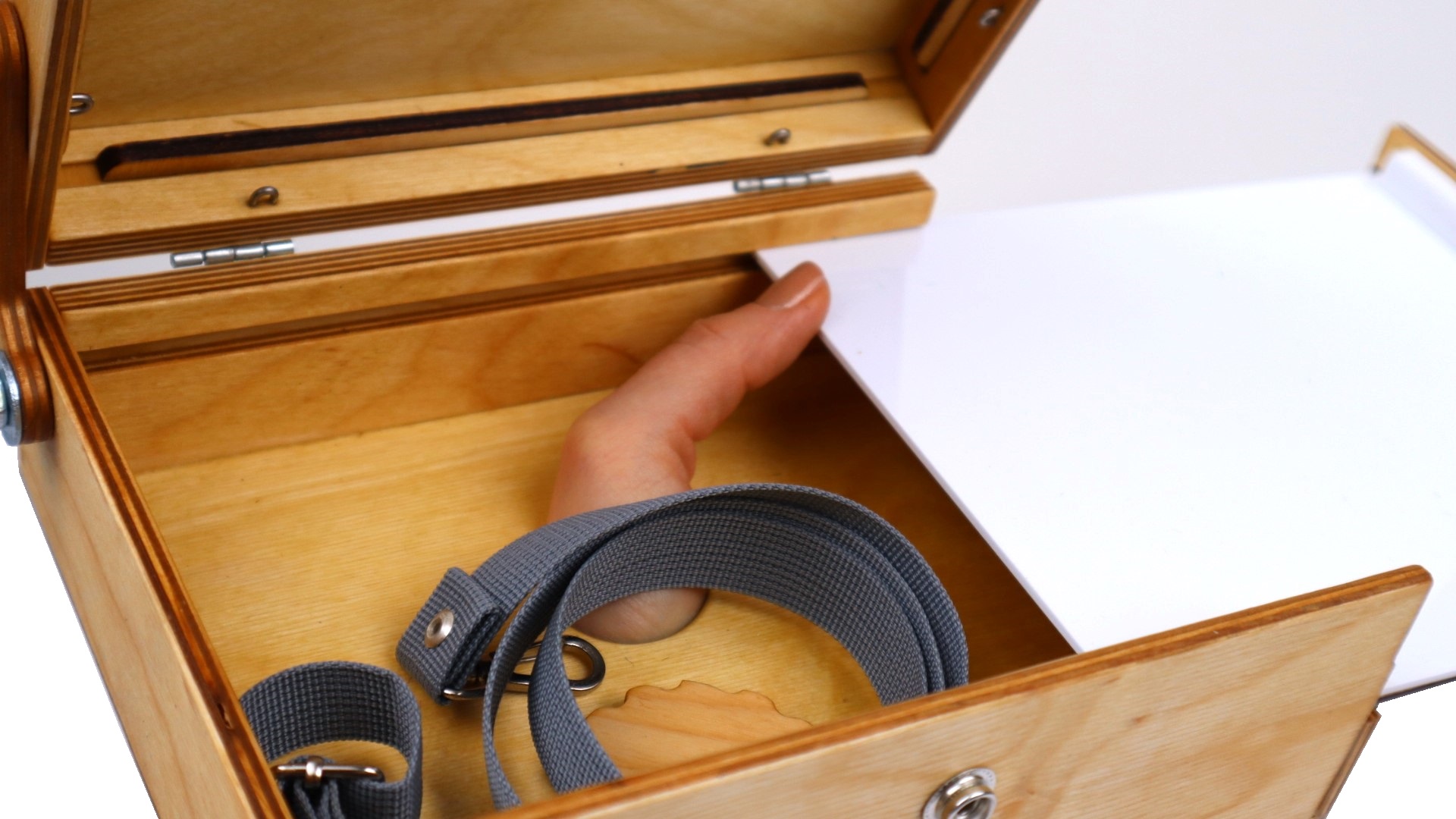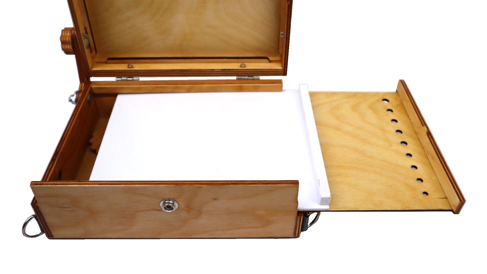 В дне этюдника имеется эргономичное отверстие для большого пальца левой руки для написания этюдов с рук.