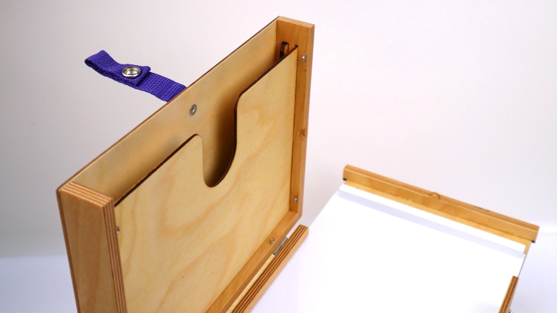 В этой версии этюдника добавлена белая пластиковая палитра, поверх деревянной. Это позволит быстро и комфортно очищать палитру от красок в конце работы.
