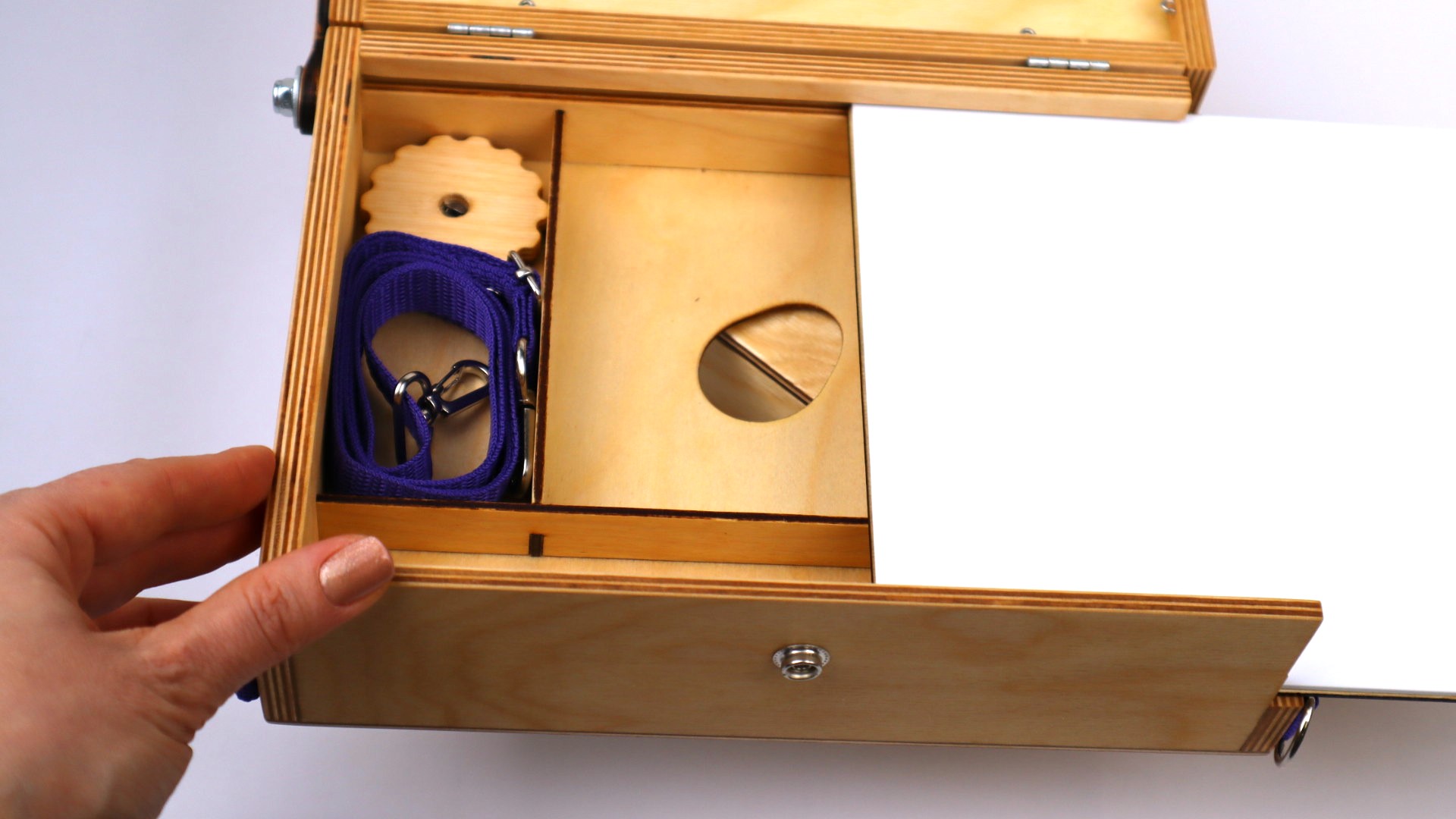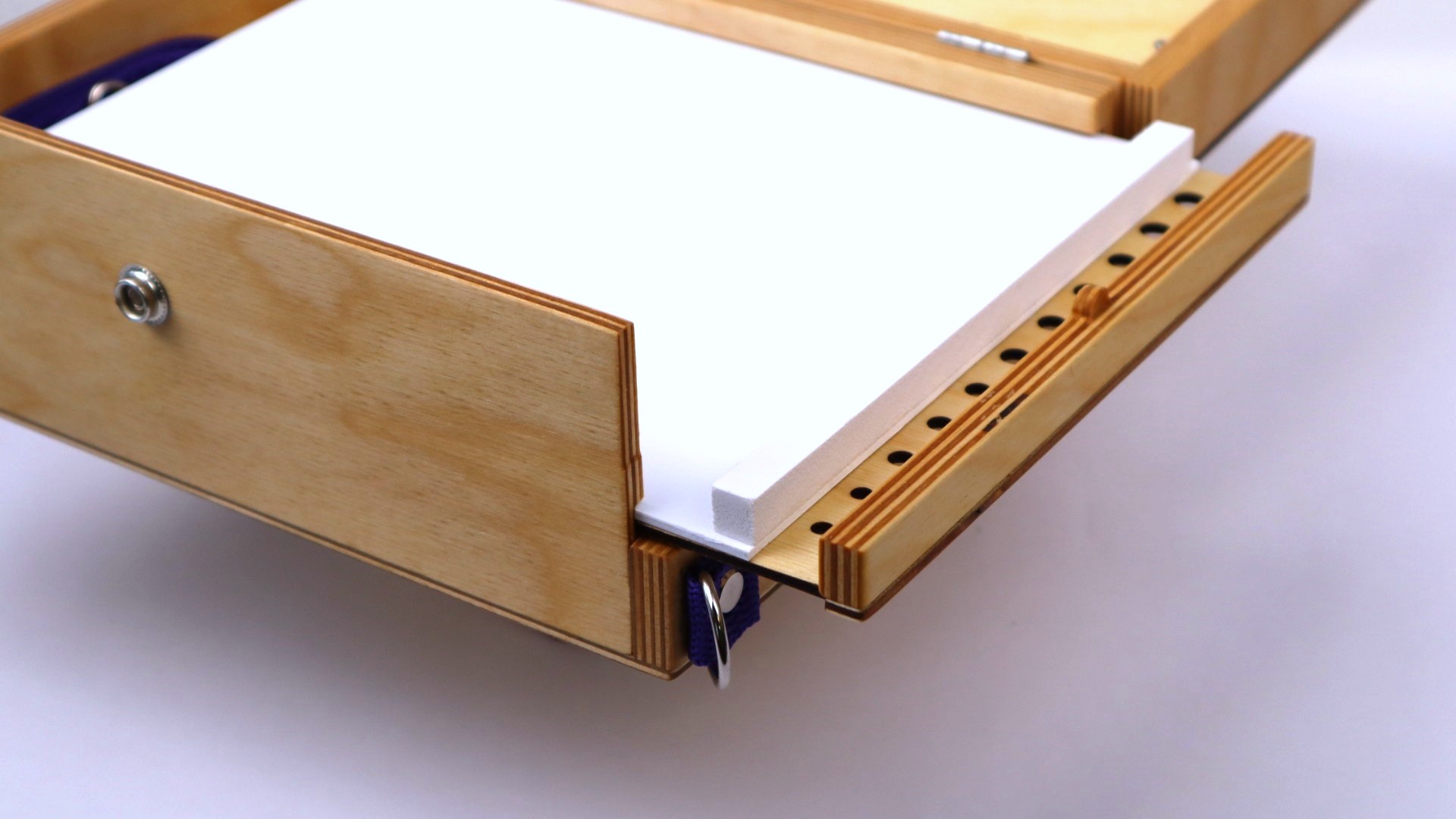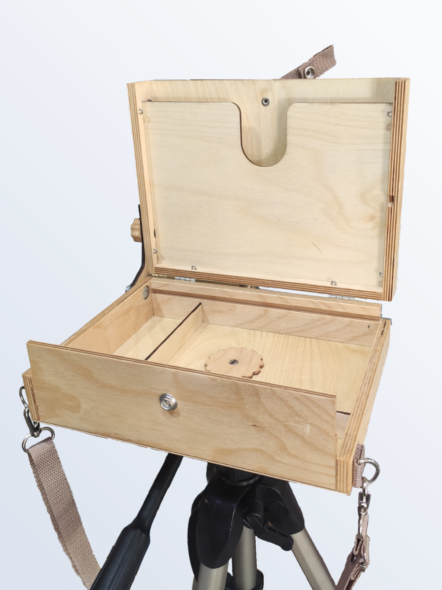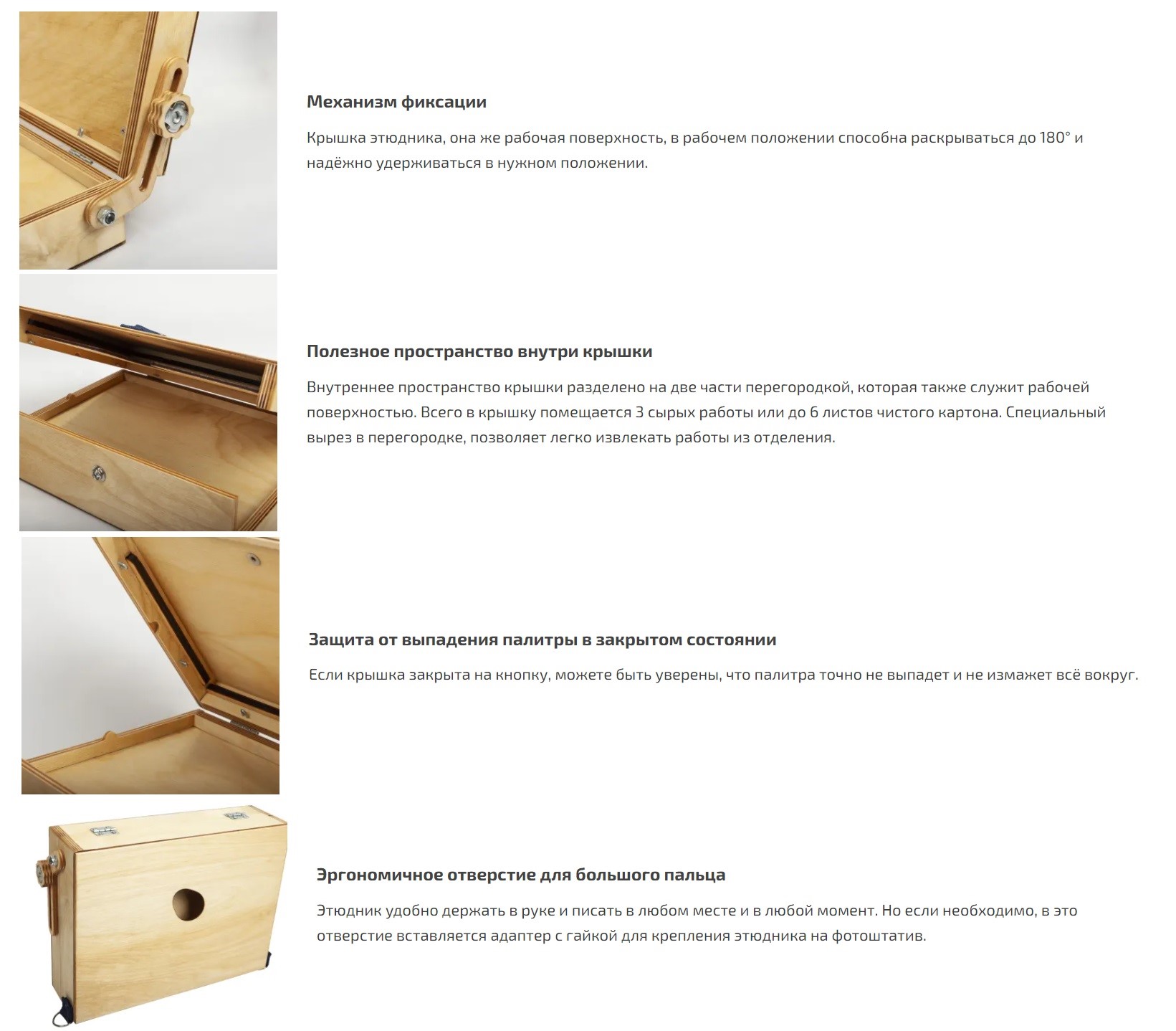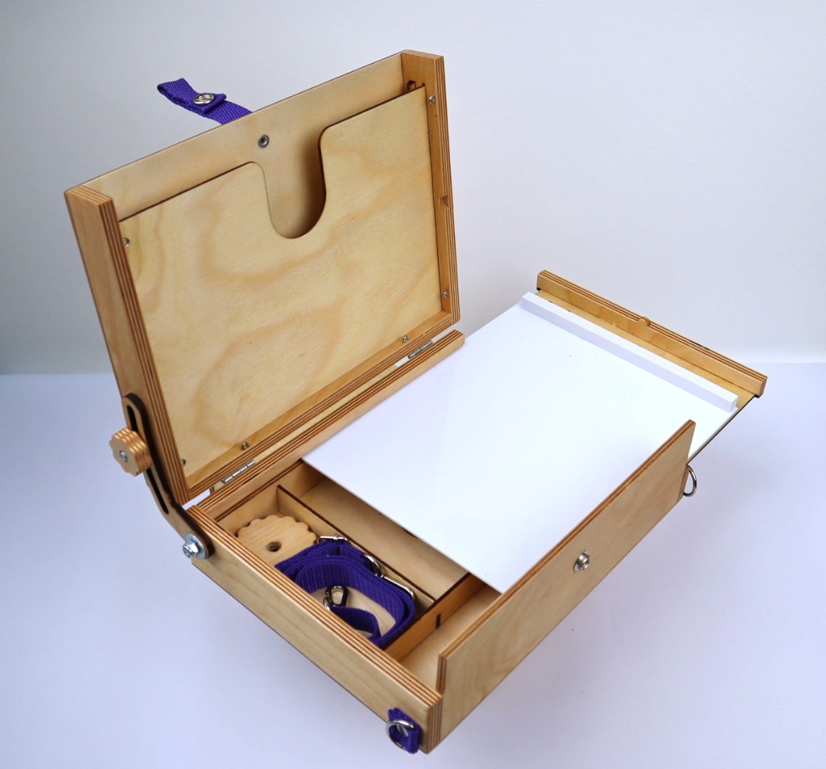 В дне этюдника имеется эргономичное отверстие для большого пальца левой руки для написания этюдов с рук. Этюдник также можно крепить на любой стандартный фото штатив, в комплекте имеется специальная заглушка с гайкой под 1/4″.