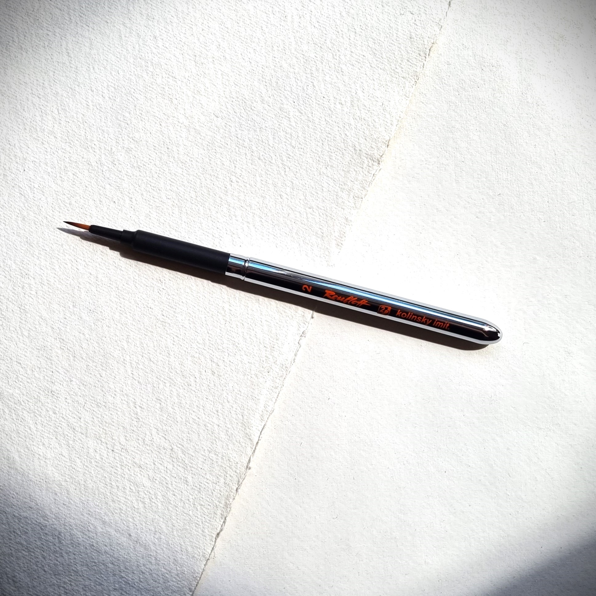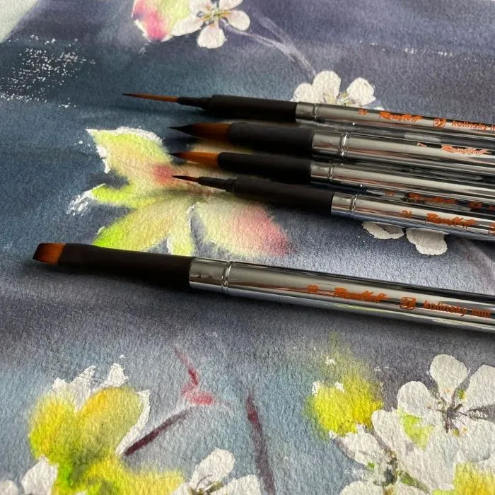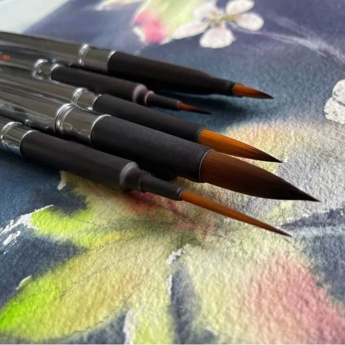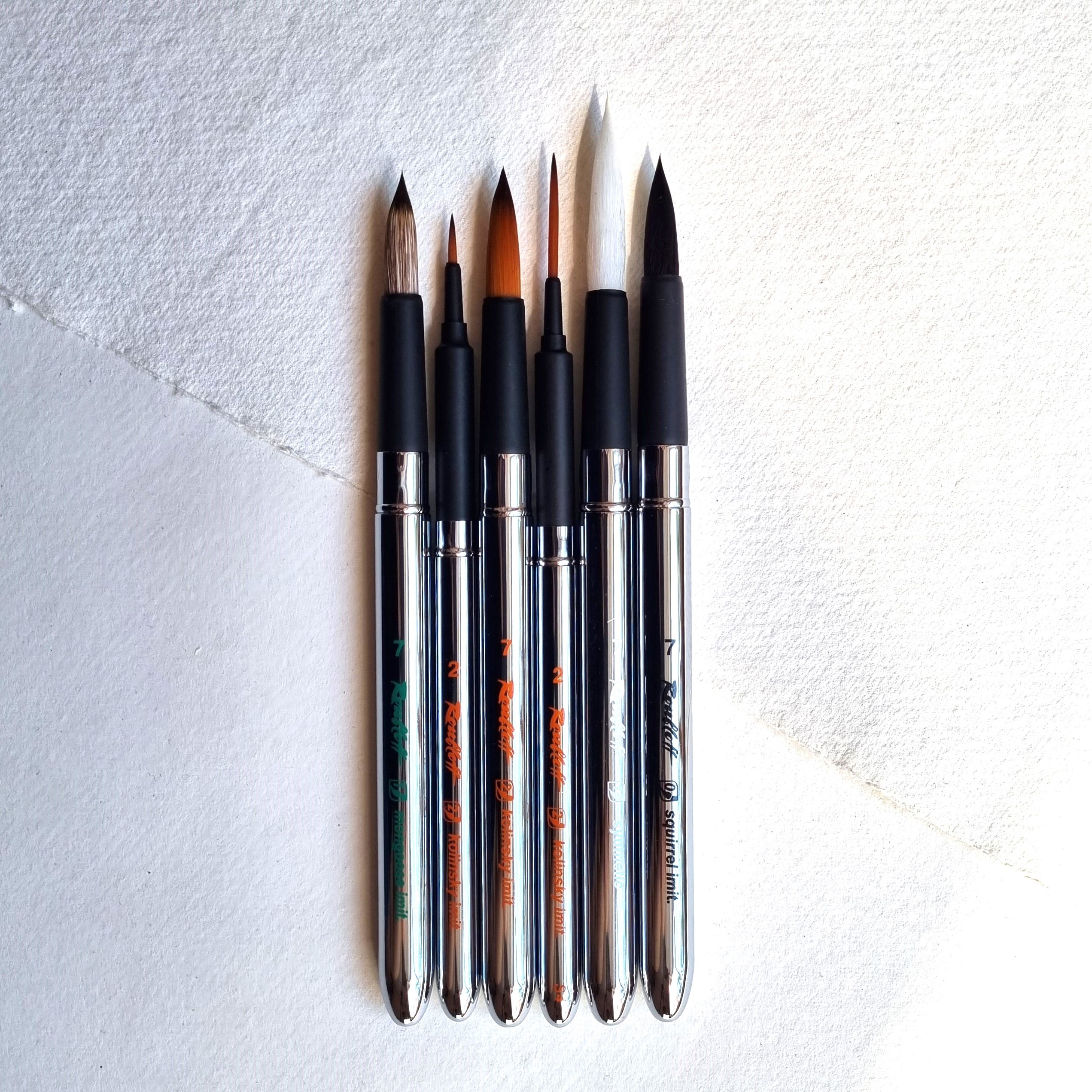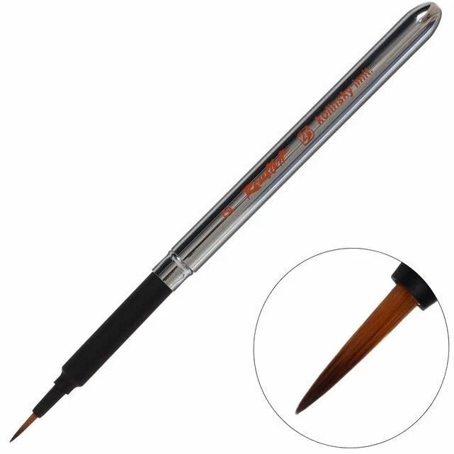 Кисть средней жёсткости с острой вершинкой, подходит для реалистичной живописи, проработки деталей, густых мазков, сухих штрихов акварелью, гуашью, акрилом.