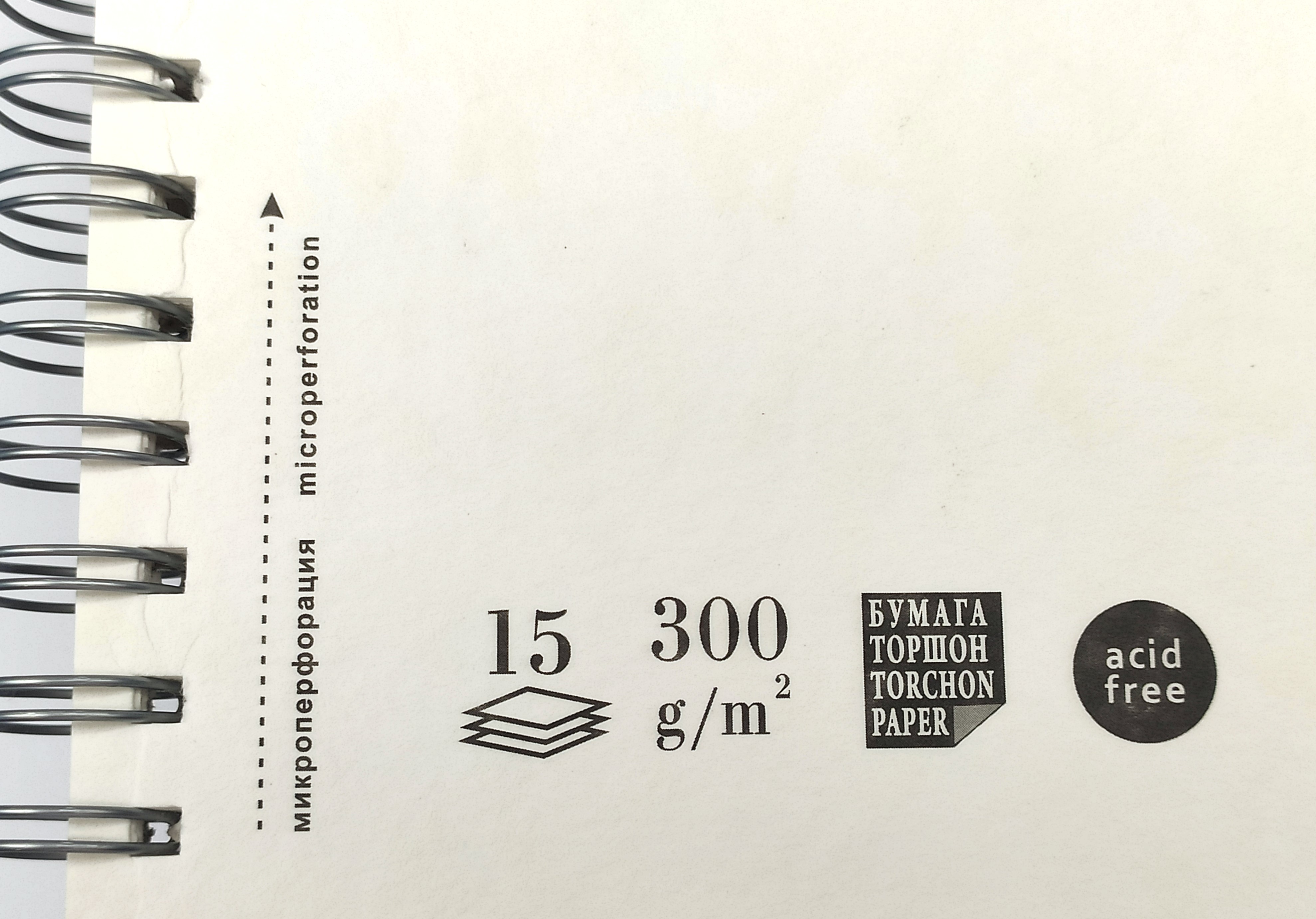 Бумага в альбоме имеет фактуру "Торшон" и плотность 300 гр/м2, предназначена для работы акварелью.