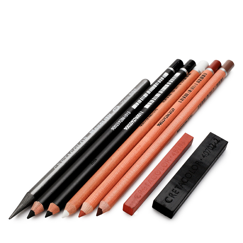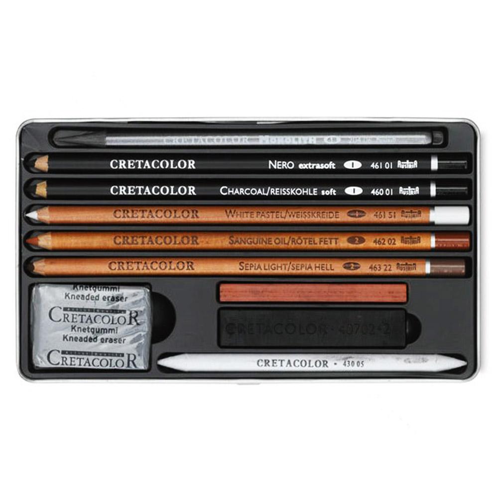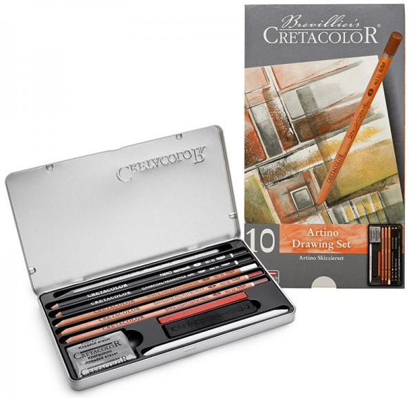 Художественный набор для эскизов "Artino" в металлической коробке, состав: графитовый караднаш „Monolith“, карандаш „Nero“, угольный карандаш мягкий, натуральный уголь, карандаш белый мел, масляная сангина, светлая сепия, палочка обожженной сангины, уголь для эскизов,растушёвка, ластик-клячка
