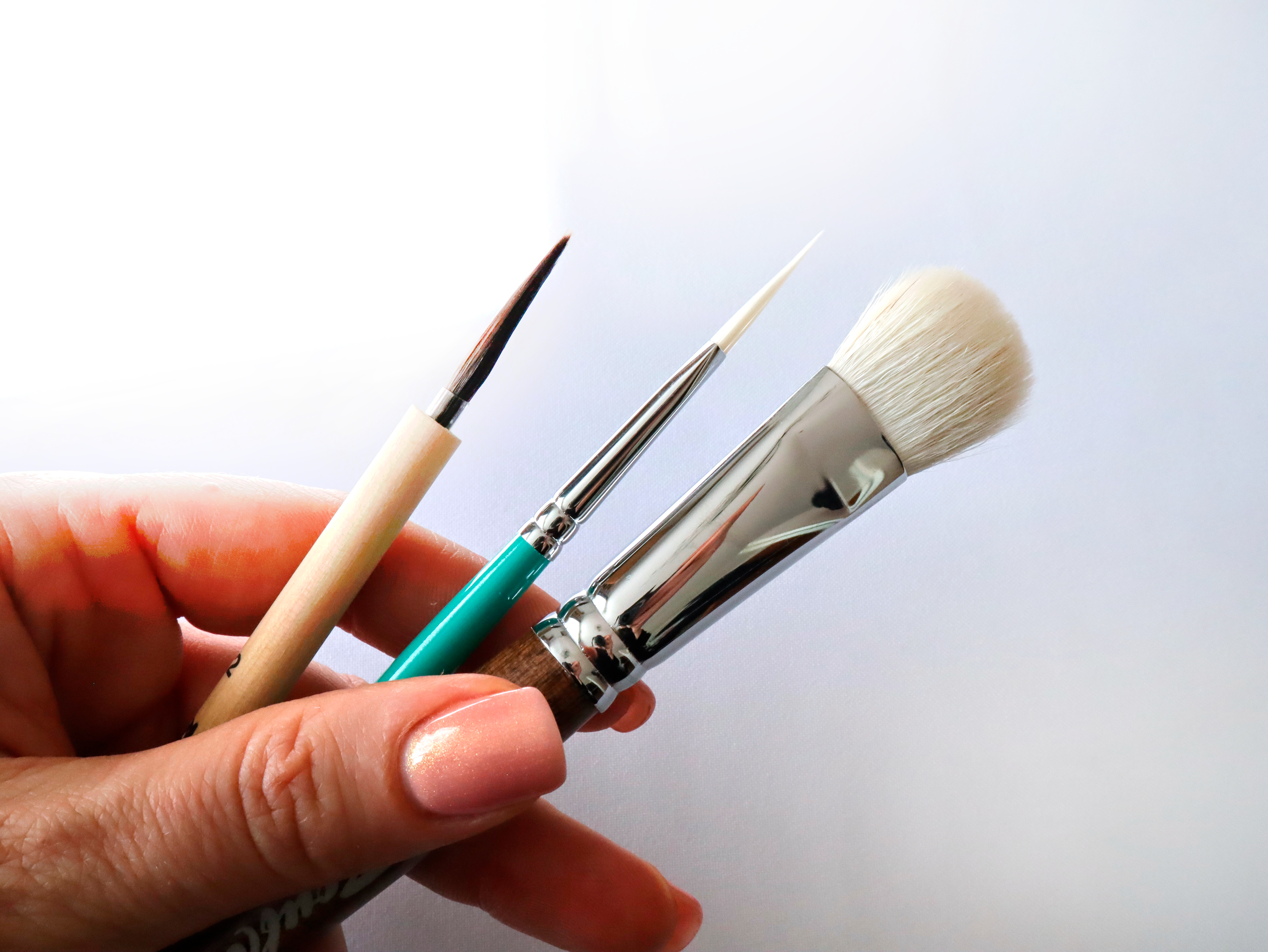 Используется для смягчения контуров, выравнивания погрешностей в заливке. Светлый ворс позволяет идентифицировать наличие или отсутствие краски на кисти.