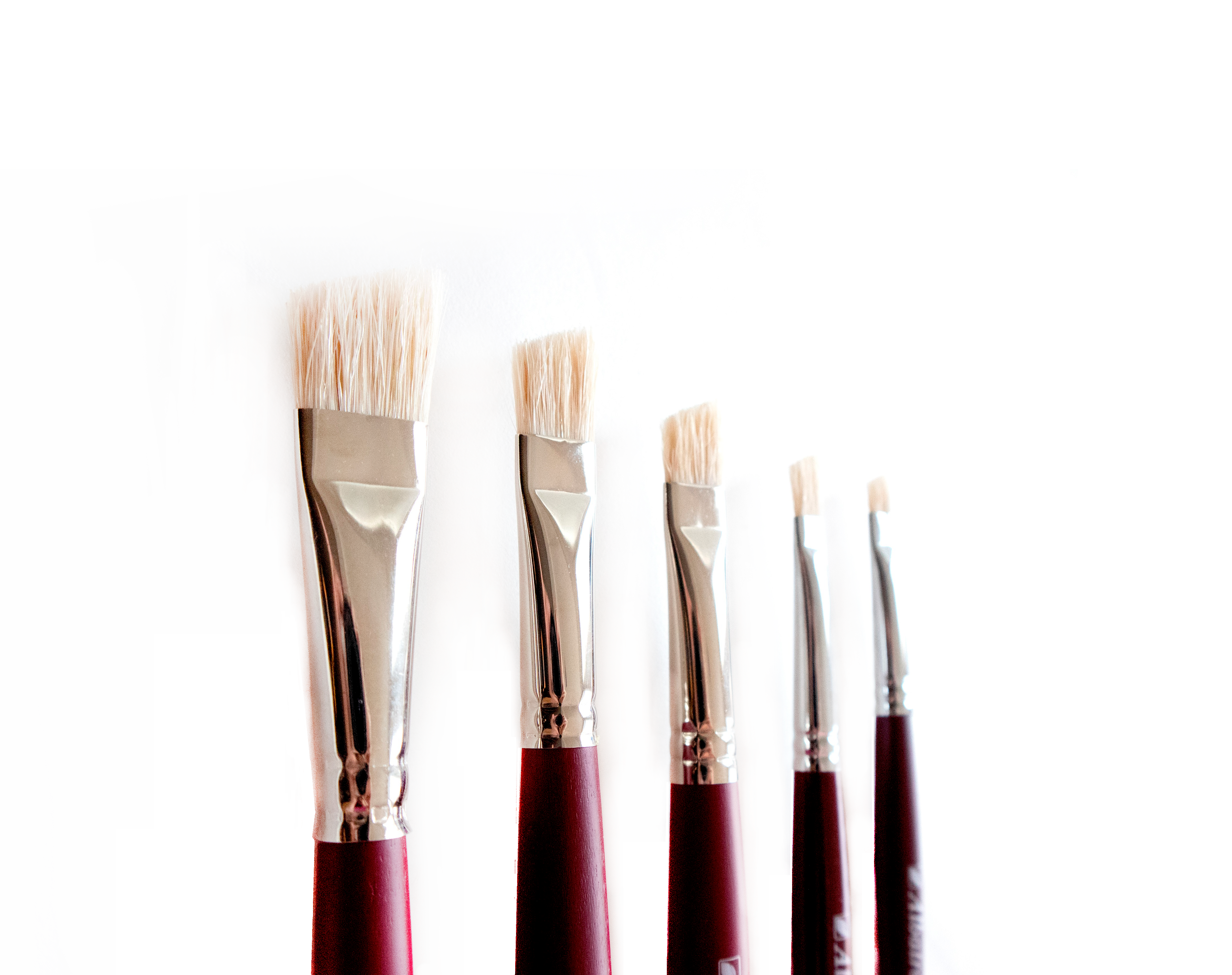 Кисти имеют плоскую со скосом форму. Такая форма делает их многофункциональными: ими удобно работать как плоской кистью, так и только краем мазка, что позволяет прорисовывать острые углы и детали.