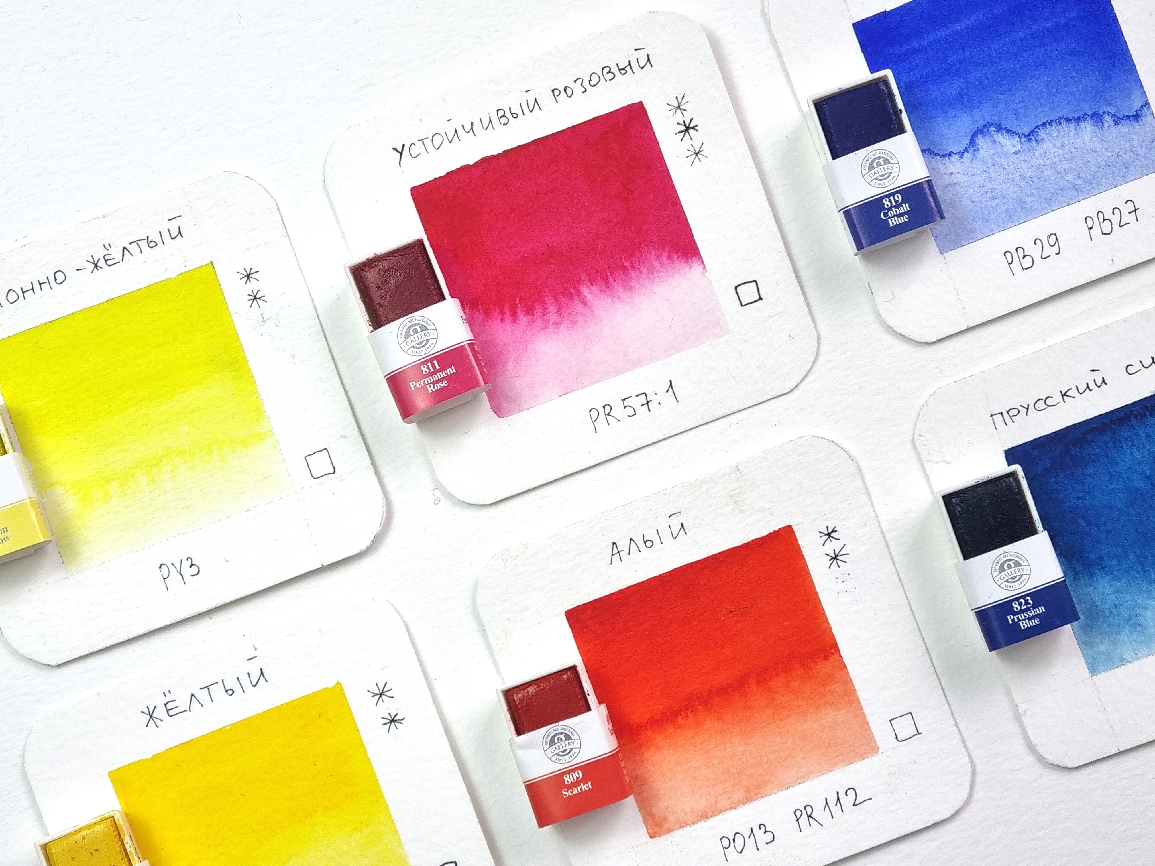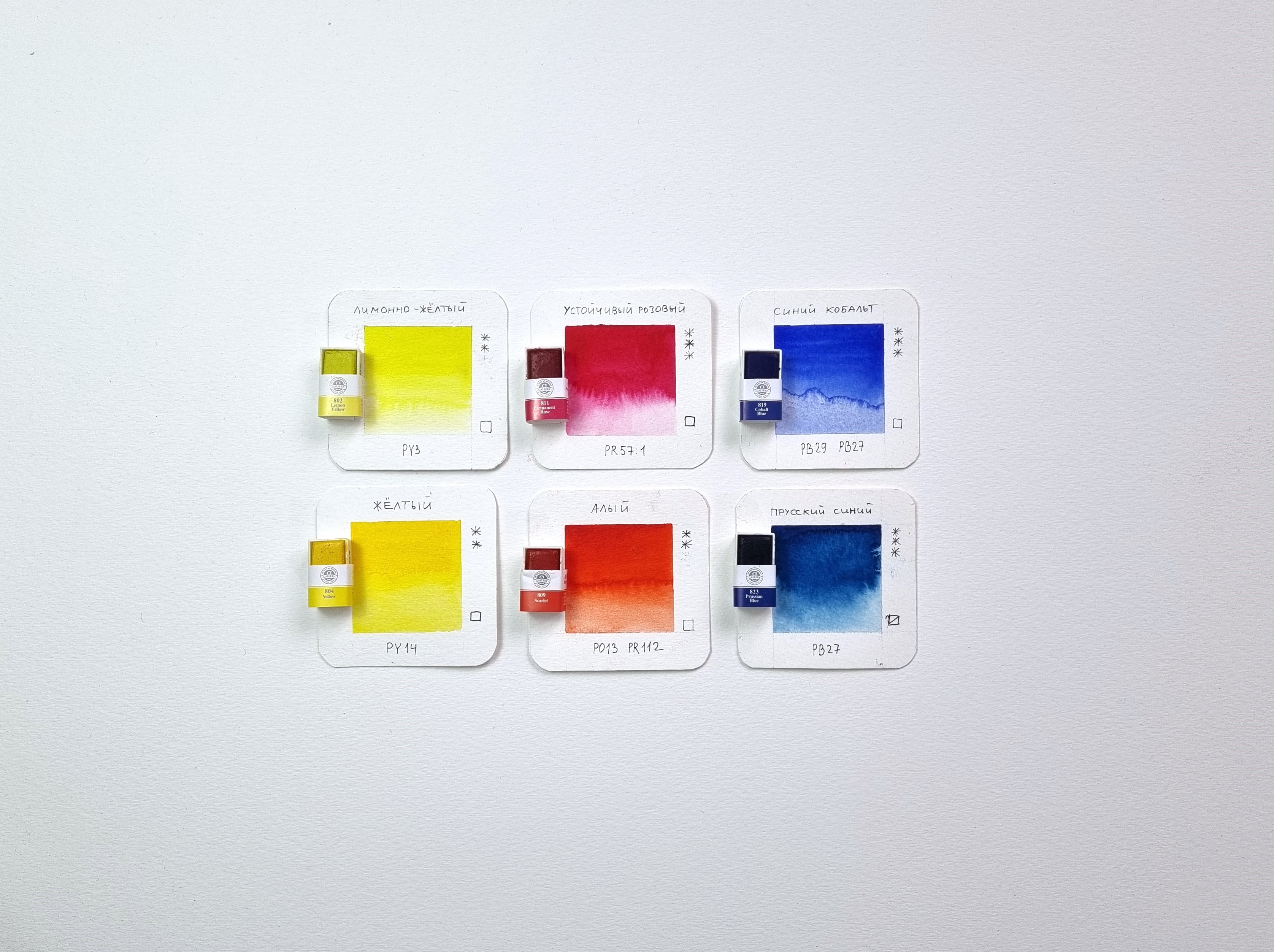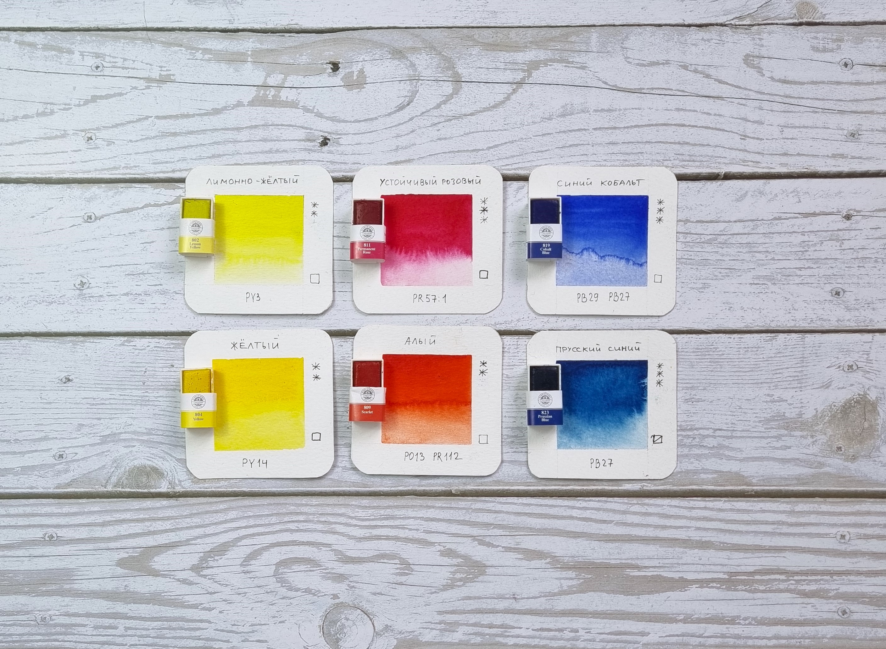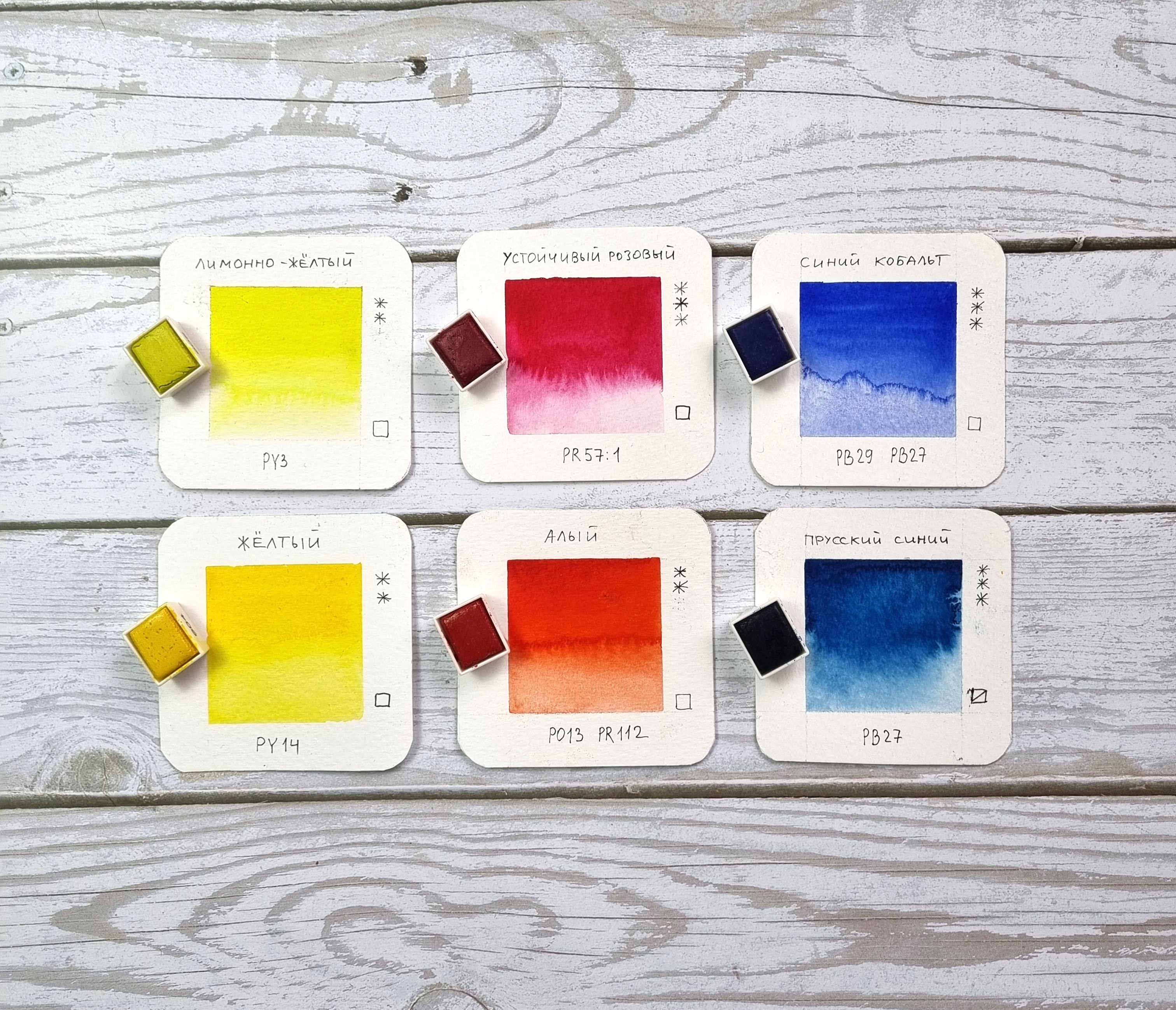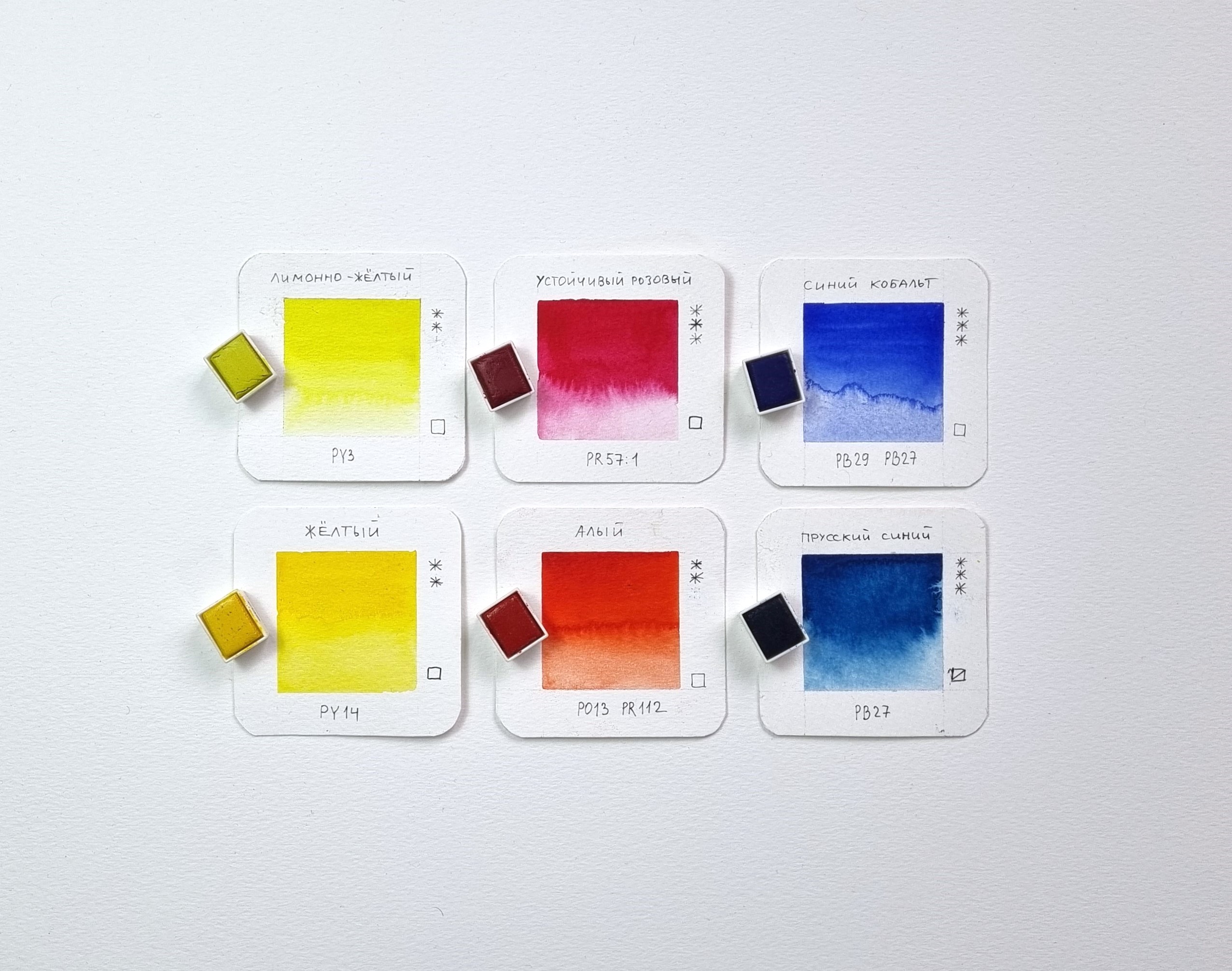 Краски представлены в твердом варианте в полу-кюветах (малых кюветах). Каждая кювета запаена в индивидуальную картонную упаковку с пластиковой защитой. На упаковке представлена полная информация о пигментном составе, светостойкости и прозрачности краски.