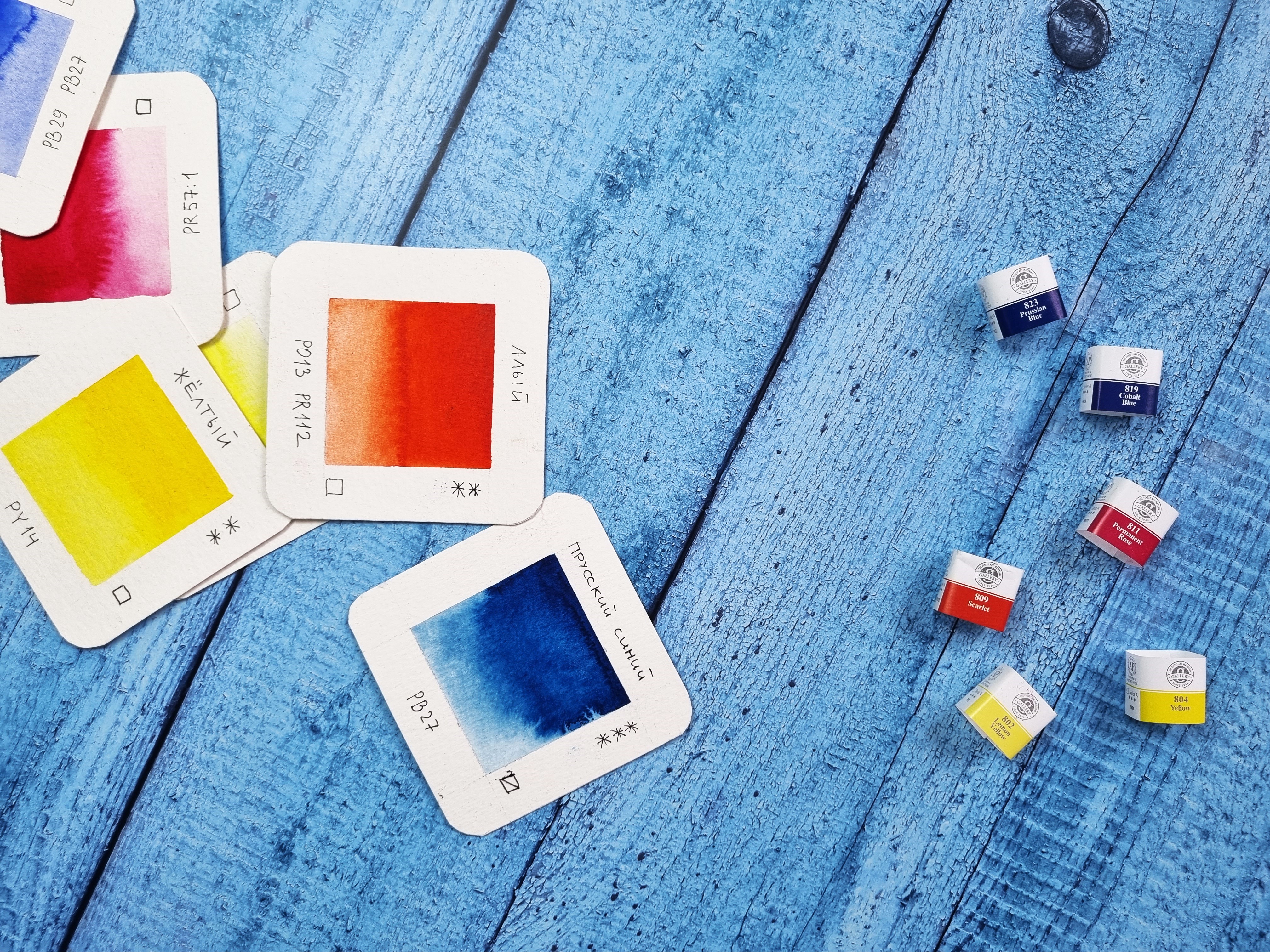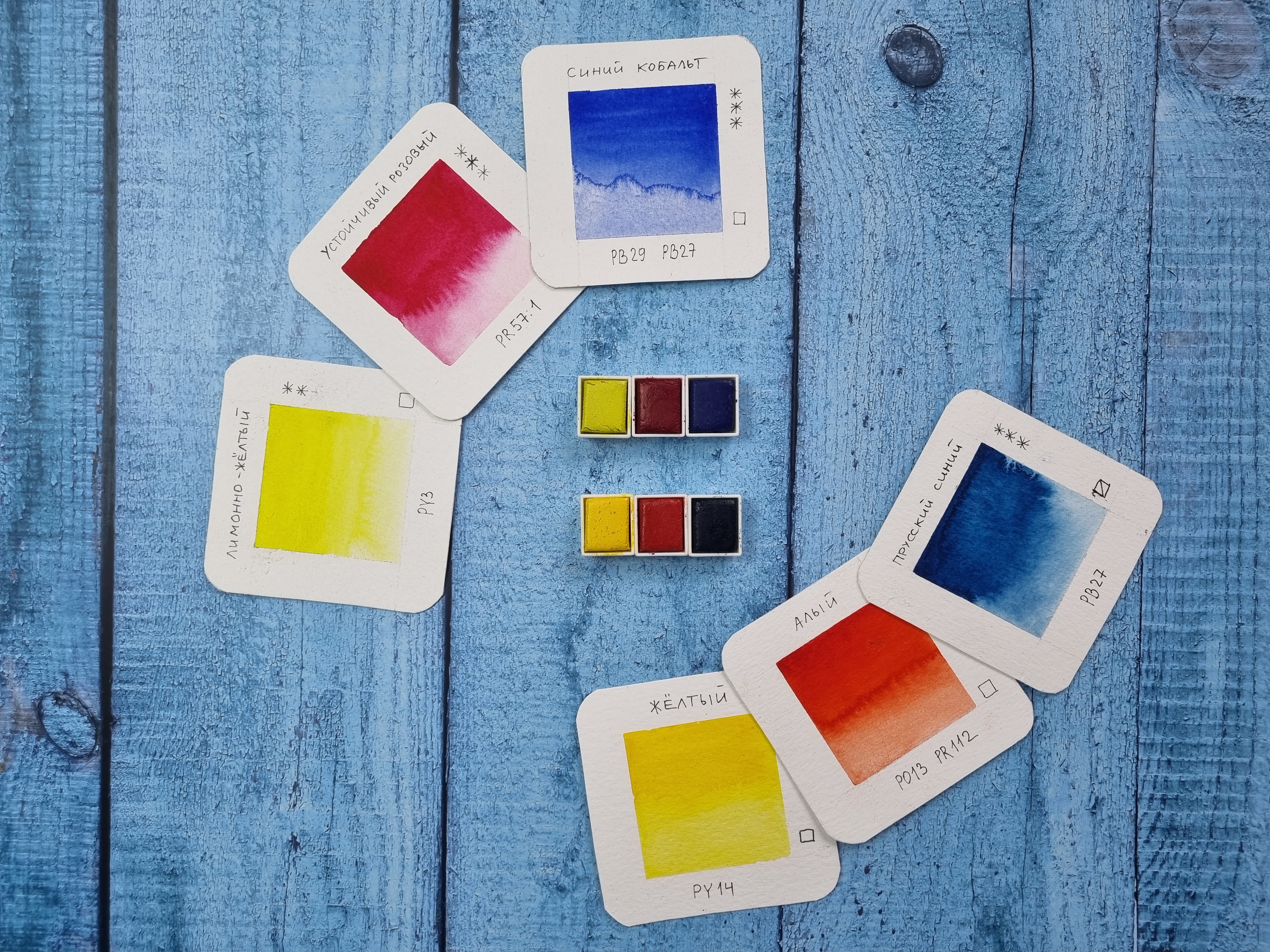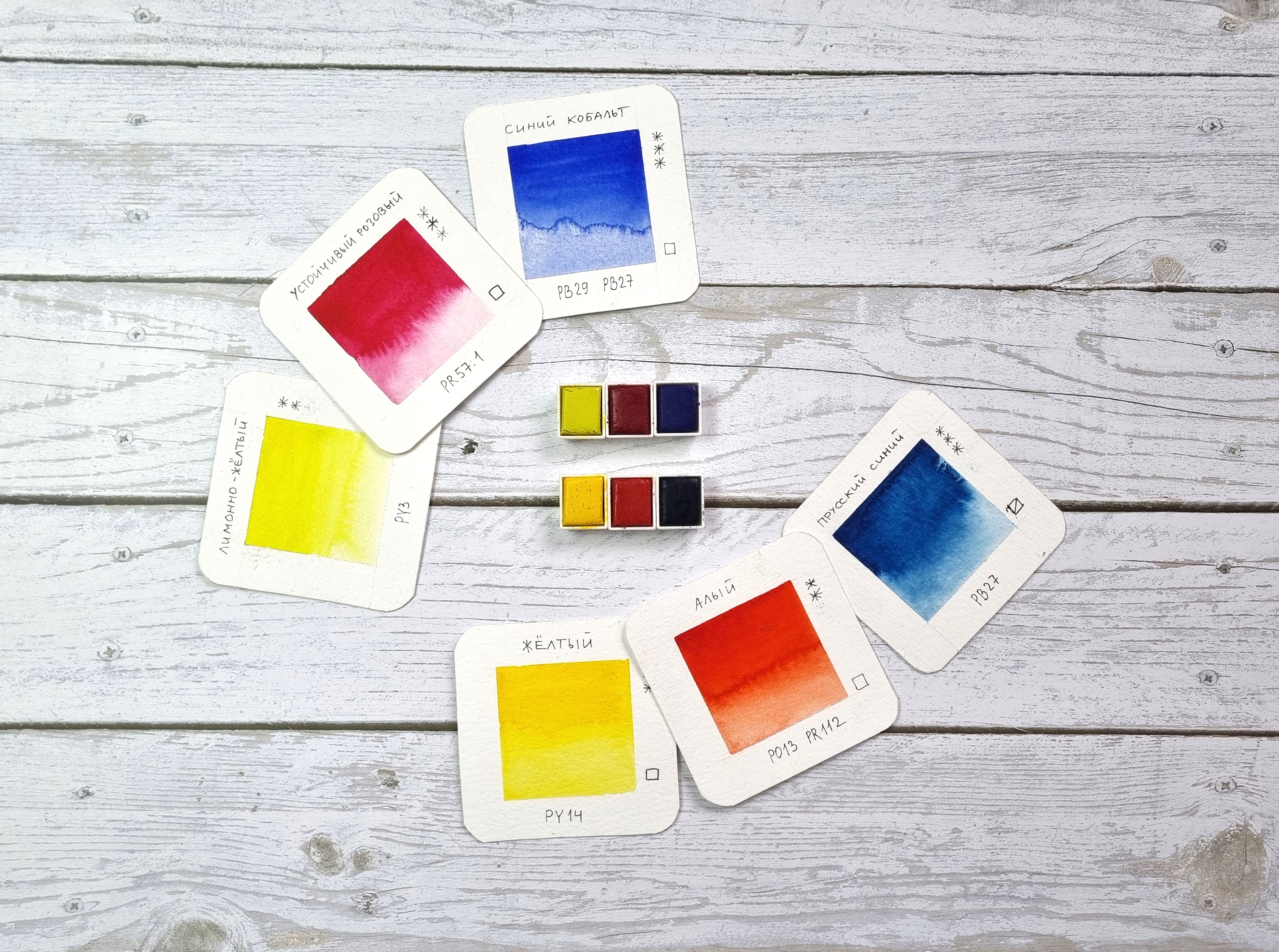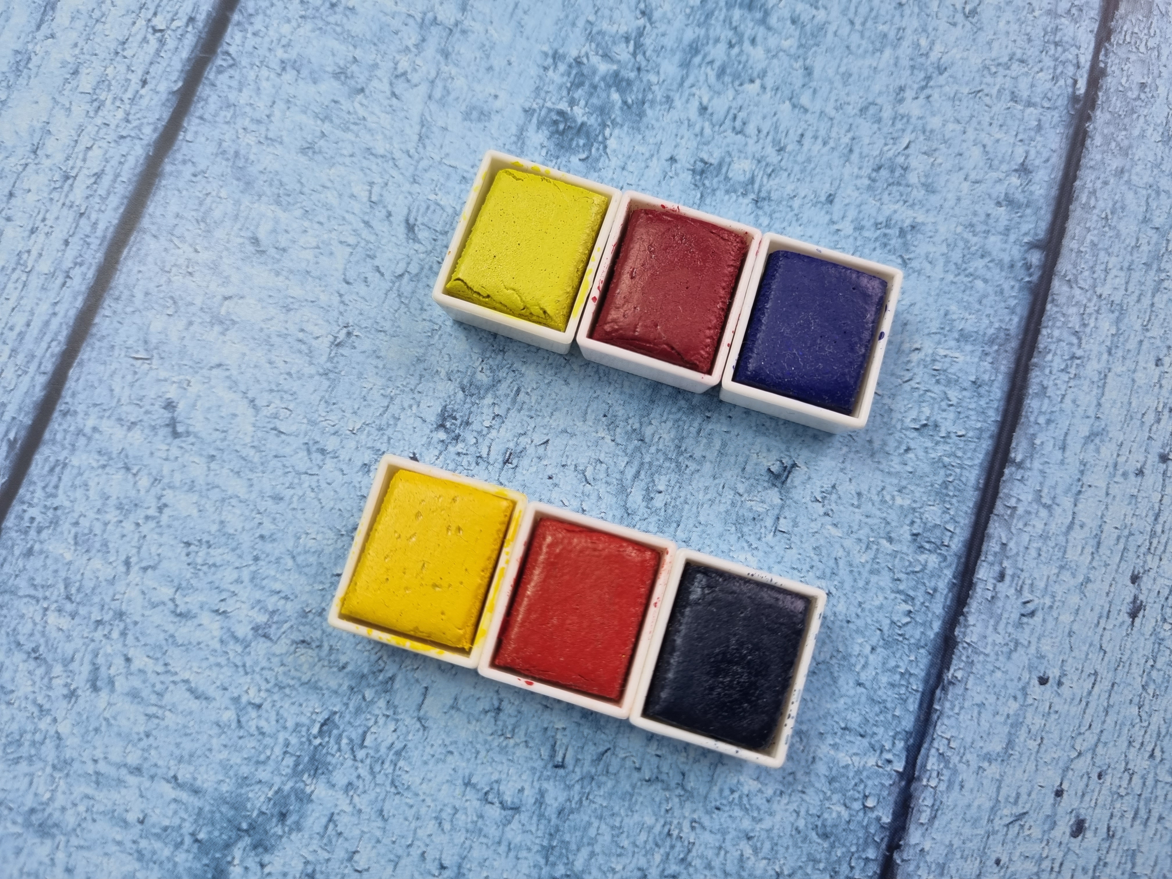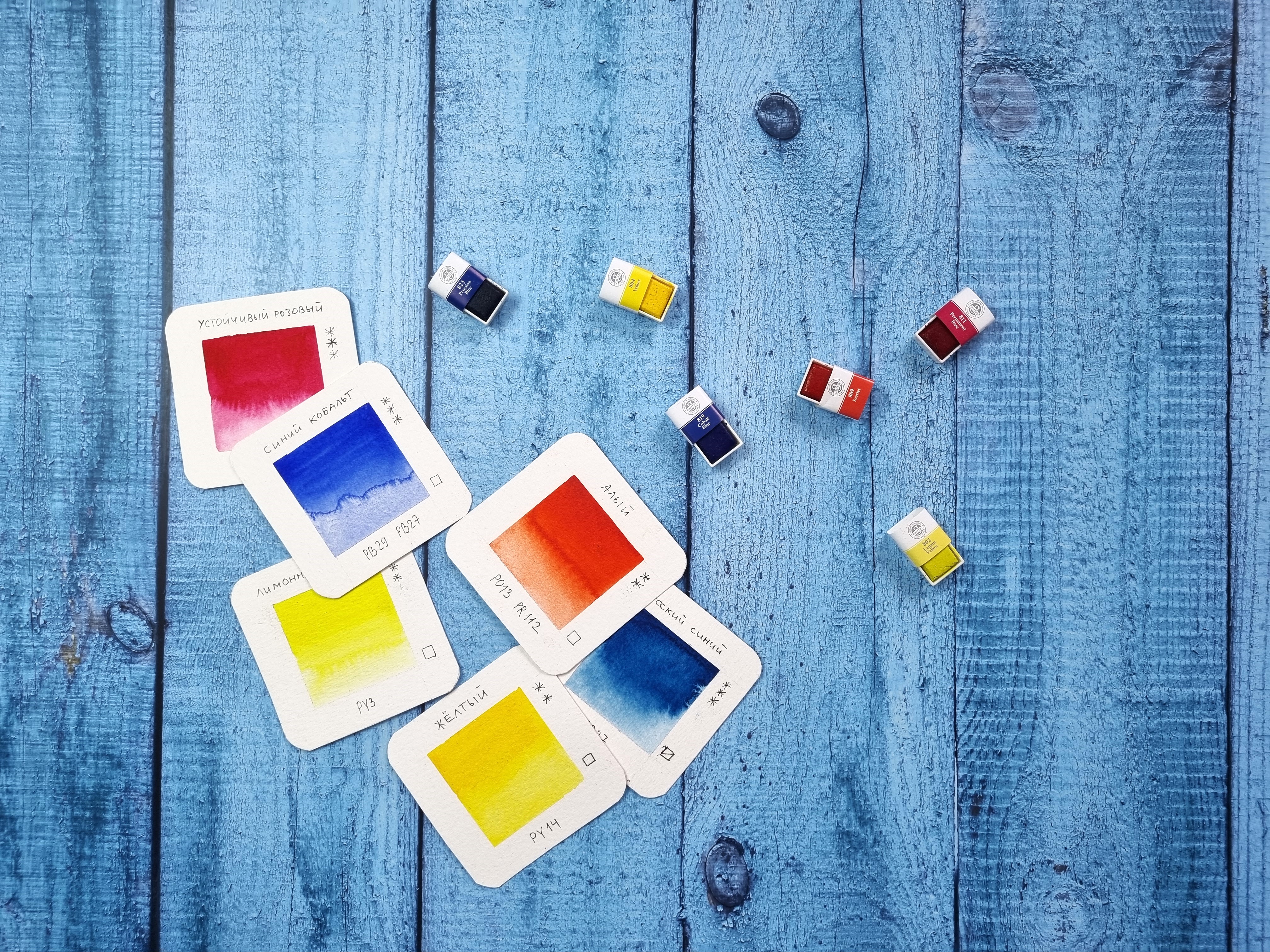Краски представлены в твердом варианте в полу-кюветах (малых кюветах). Каждая кювета запаена в индивидуальную картонную упаковку с пластиковой защитой. На упаковке представлена полная информация о пигментном составе, светостойкости и прозрачности краски.