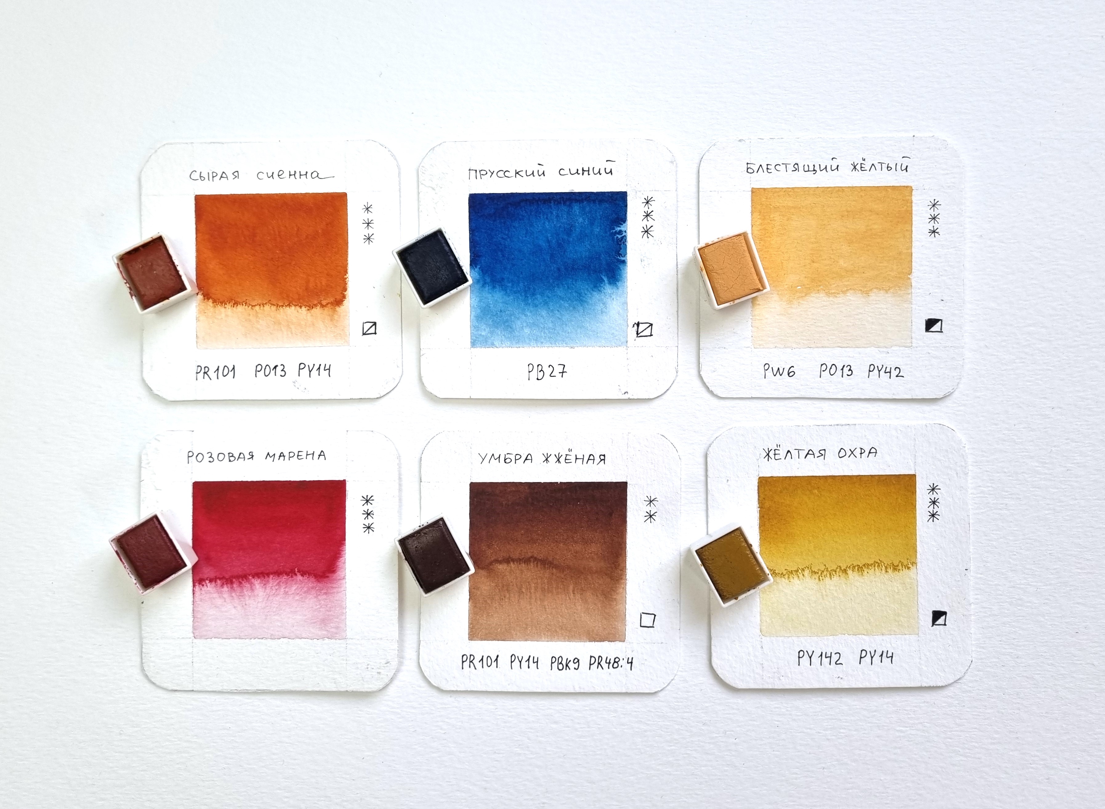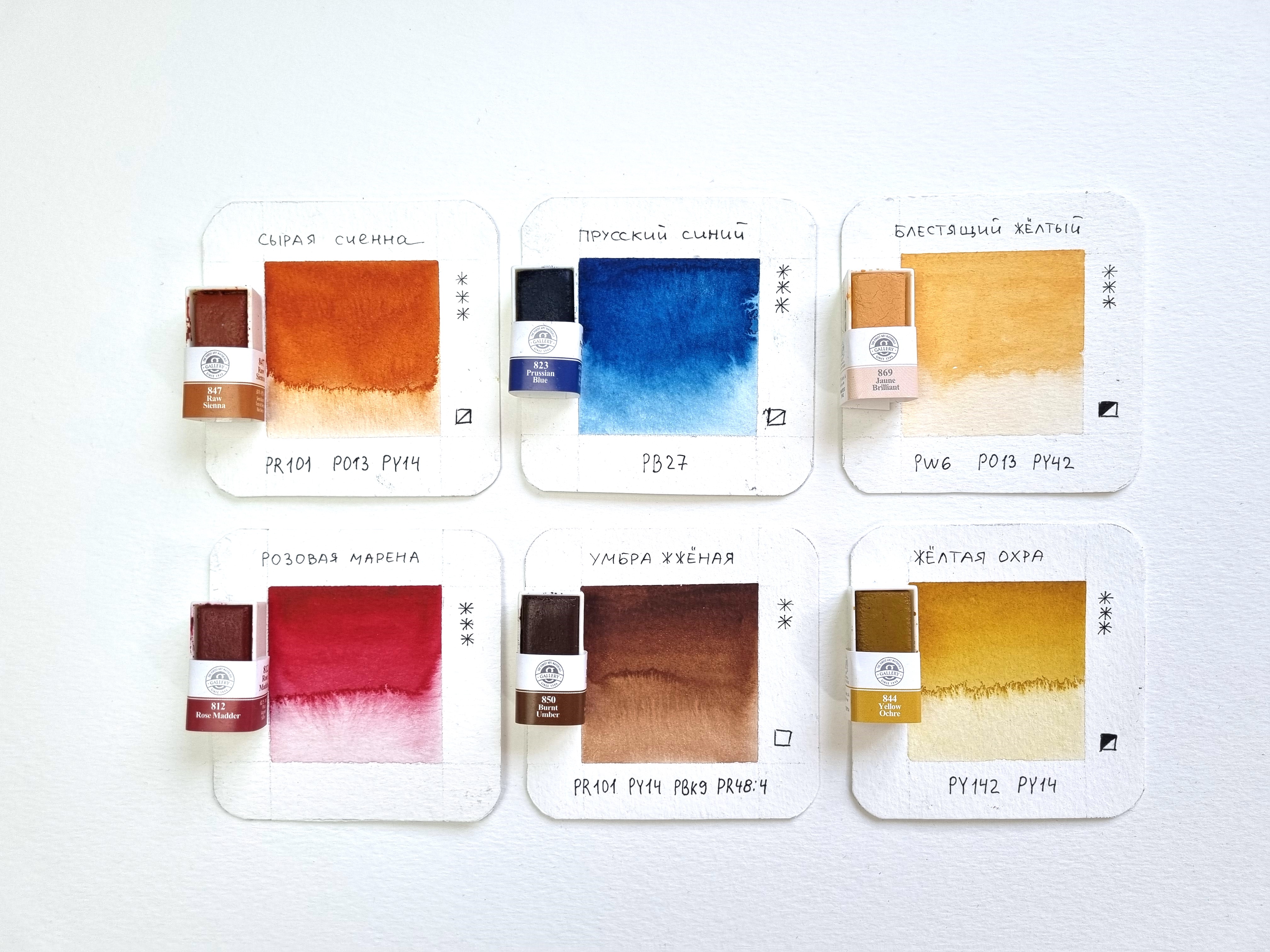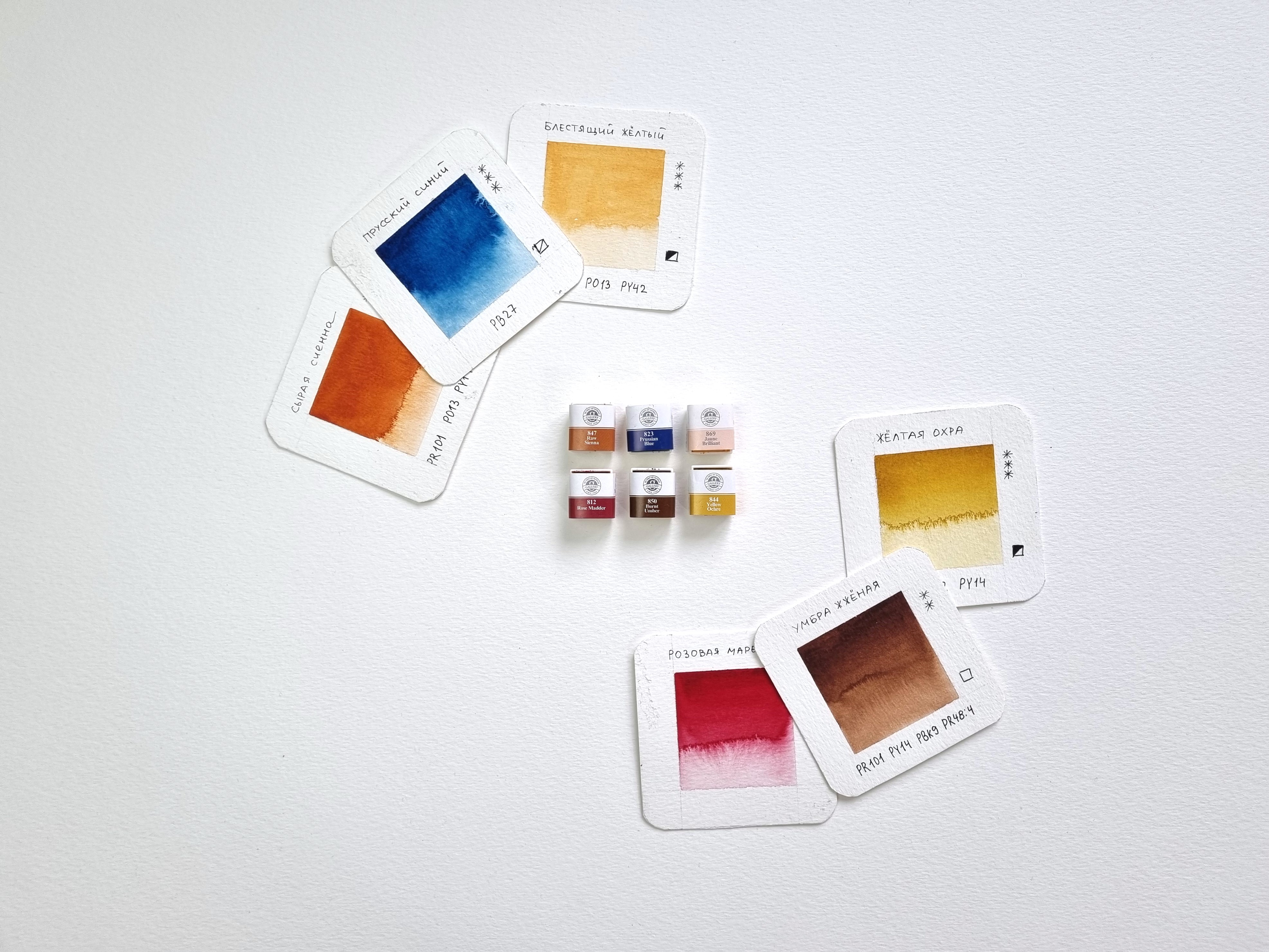 Краски представлены в твердом варианте в полу-кюветах (малых кюветах). Каждая кювета запаена в индивидуальную картонную упаковку с пластиковой защитой. На упаковке представлена полная информация о пигментном составе, светостойкости и прозрачности краски.