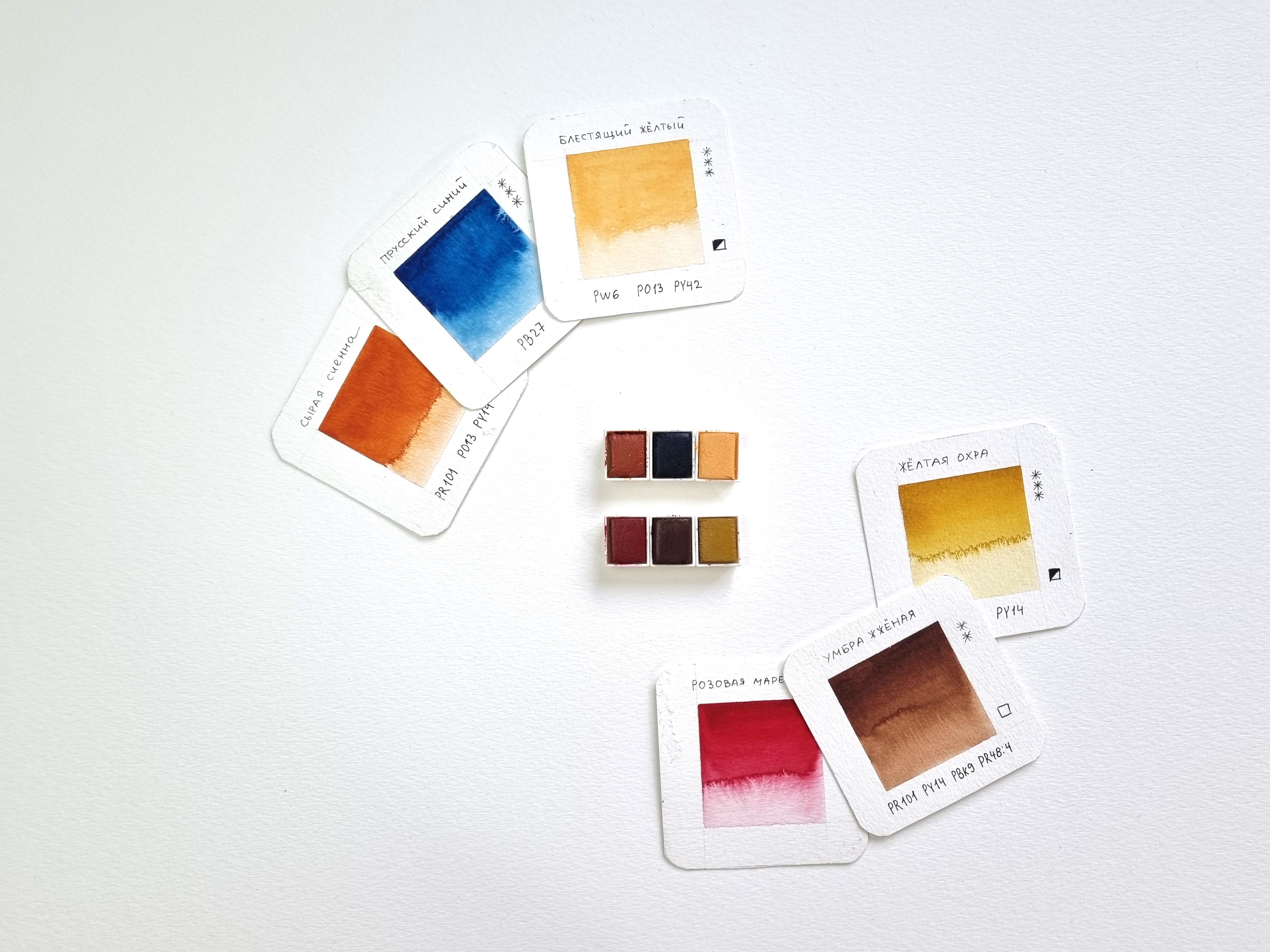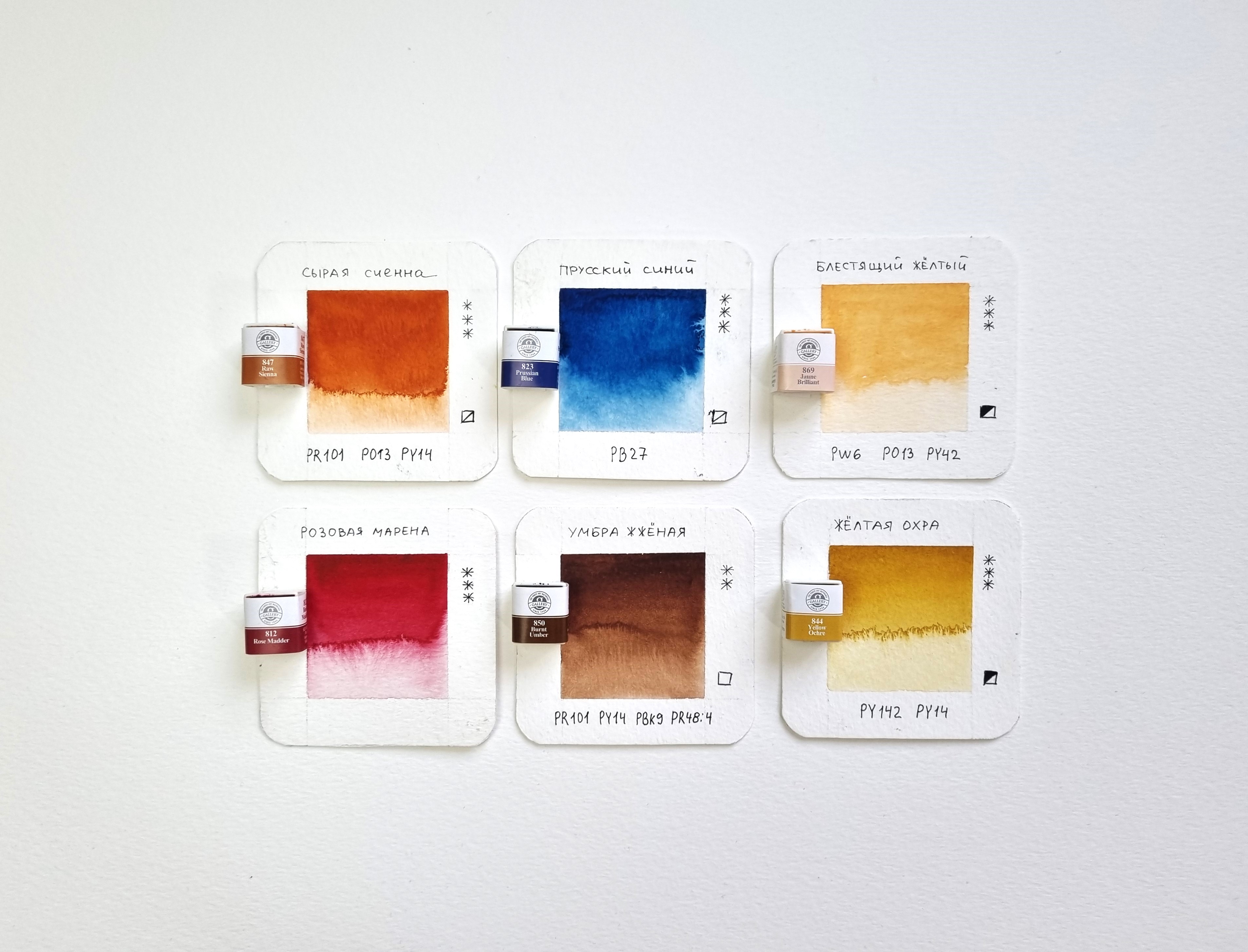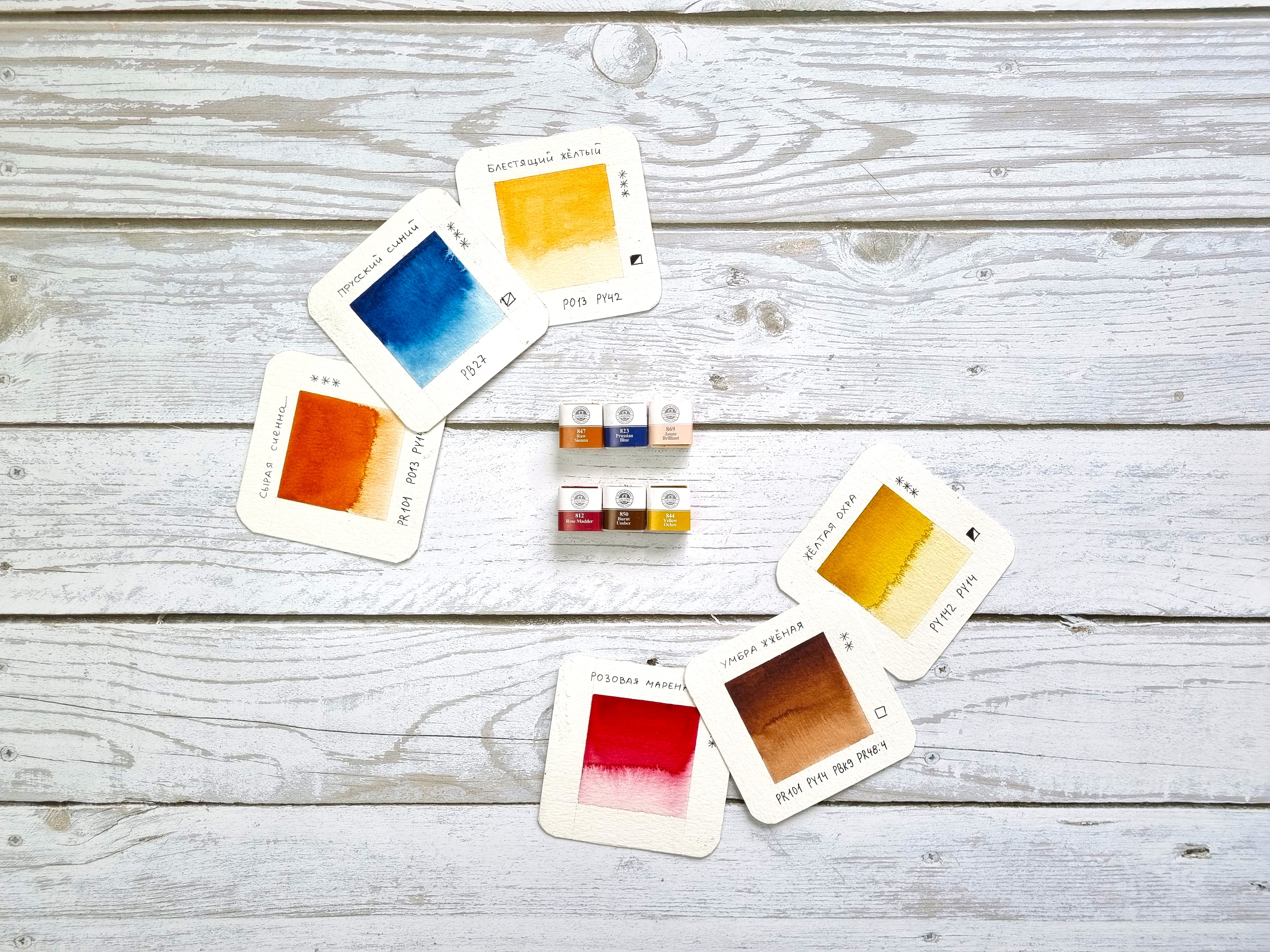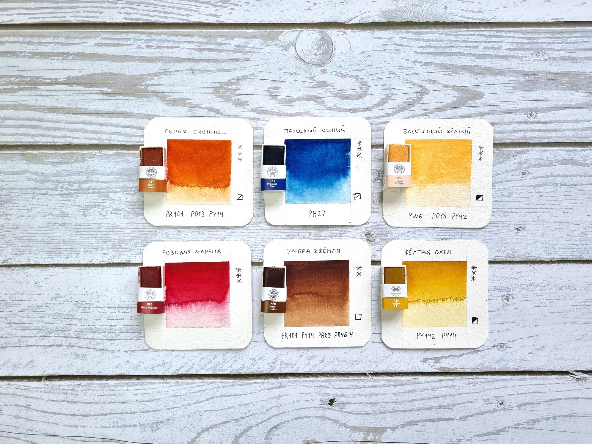 Краски представлены в твердом варианте в полу-кюветах (малых кюветах). Каждая кювета запаена в индивидуальную картонную упаковку с пластиковой защитой. На упаковке представлена полная информация о пигментном составе, светостойкости и прозрачности краски.
