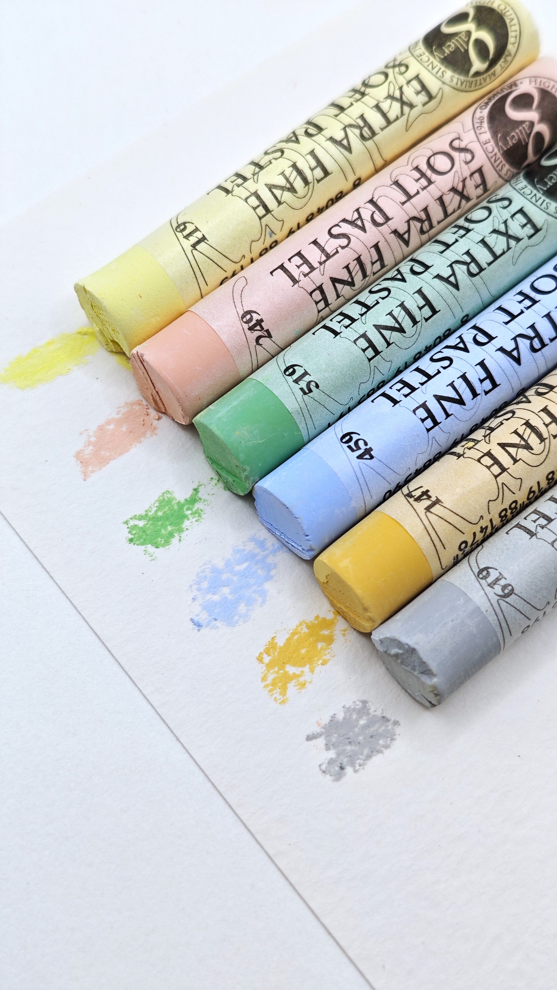 Высококачественные сухие пастельные мелки, круглые, в бумажных манжетах. Изготовлены из проверенного безопасного, очень качественного сырья, экстра-тонкого помола.