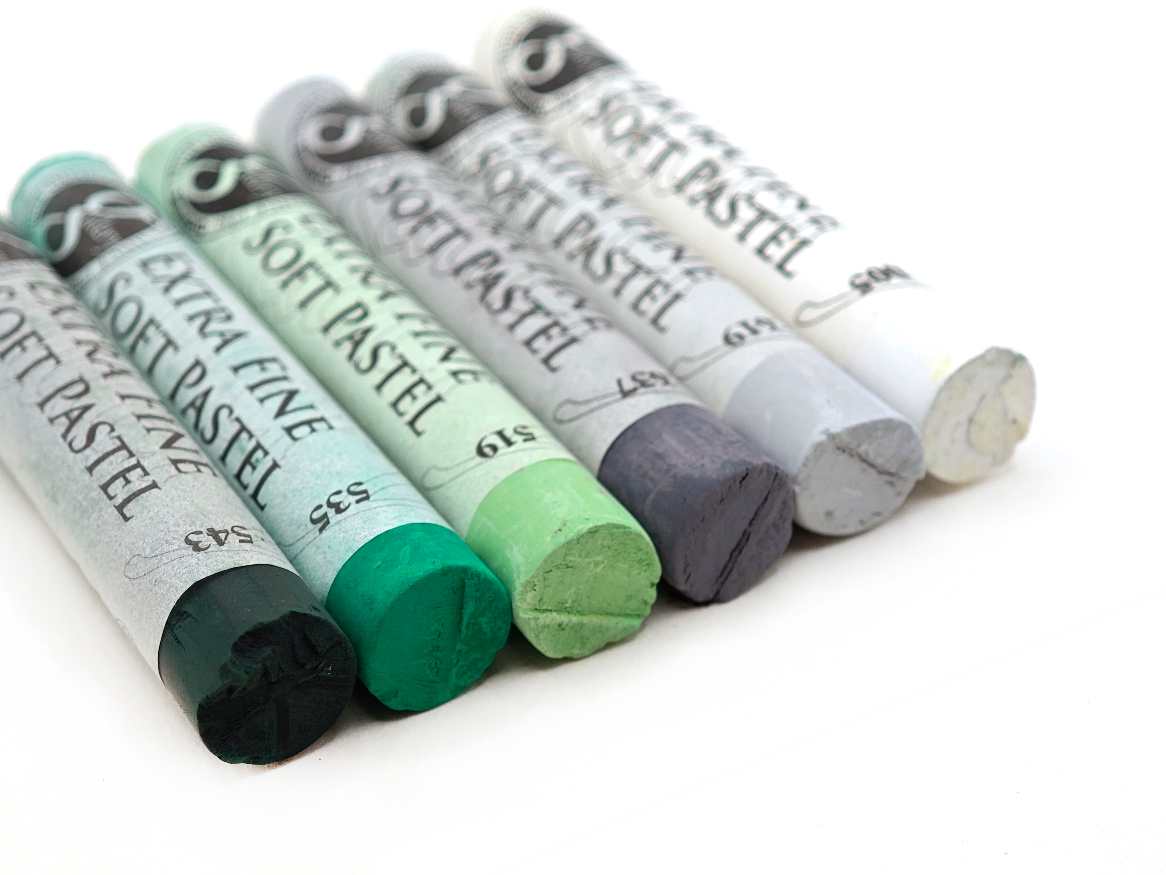 Высококачественные сухие пастельные мелки, круглые, в бумажных манжетах. Изготовлены из проверенного безопасного, очень качественного сырья, экстра-тонкого помола.