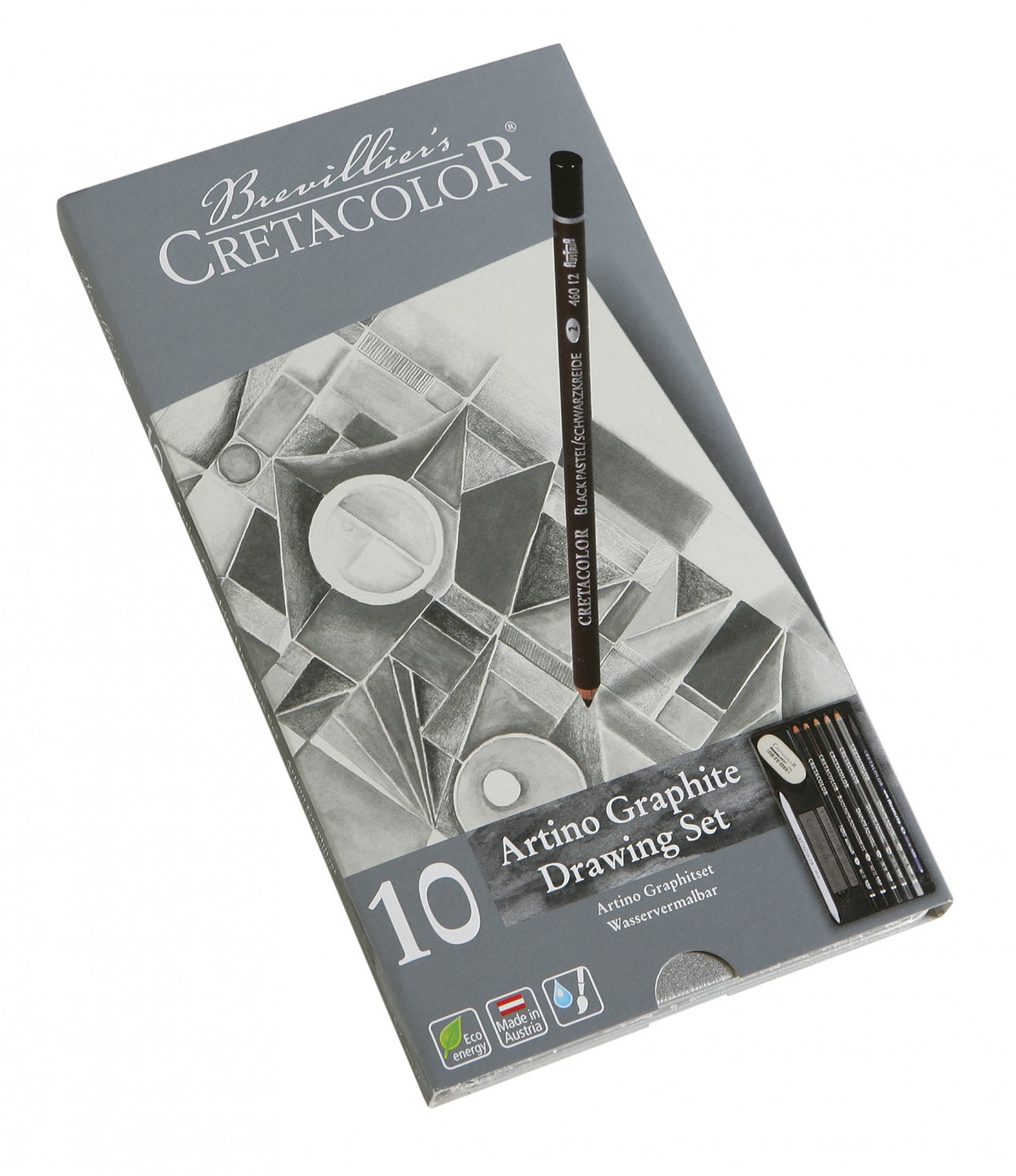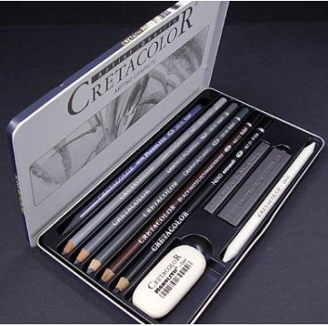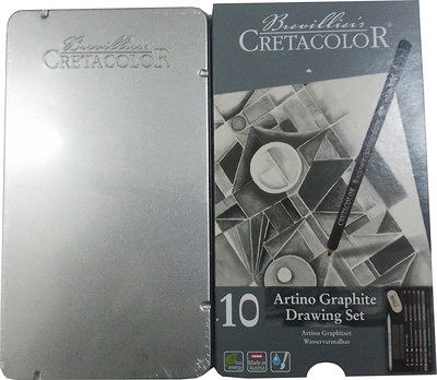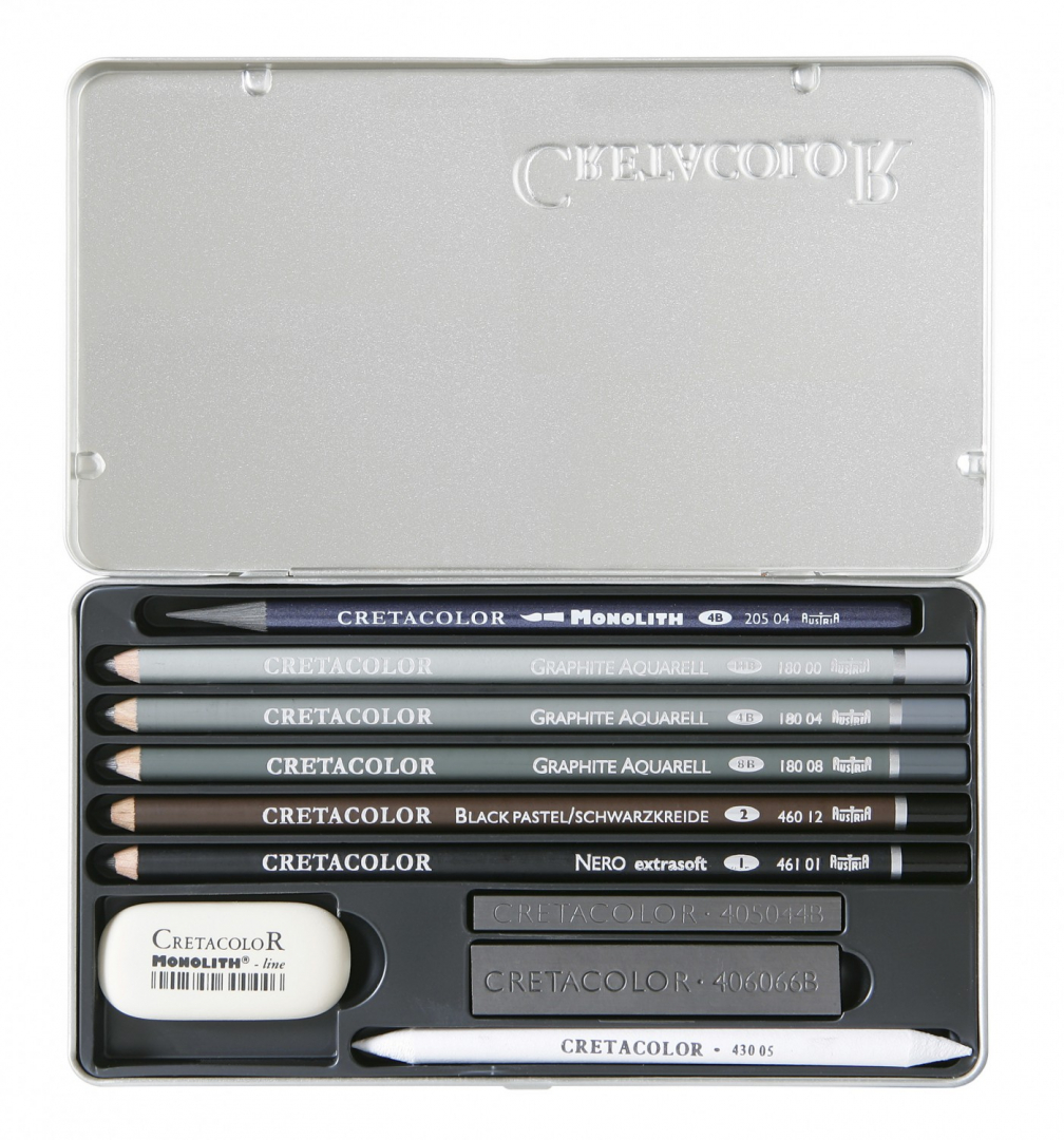 Базовый набор для рисования "ARTINO GRAPHITE" в металлической коробке, водорастворимый чернографитовый карандаш „Monolith“ 4B, водорастворимые чернографитовые карандаши HB, 4B, 8B, карандаш чёрный мел, карандаш „Nero“, графитовая палочка 4B, толстая графитовая палочка 6B, растушёвка и ластик-клячка
