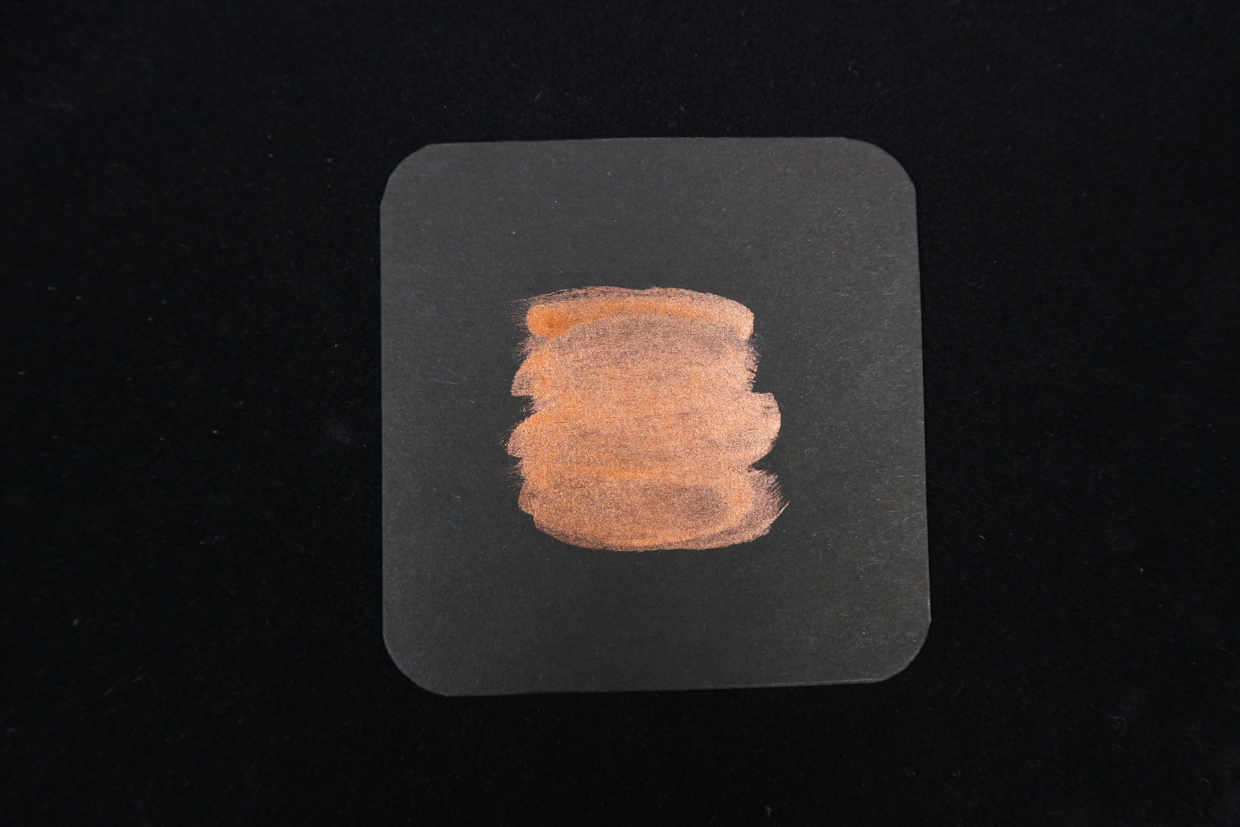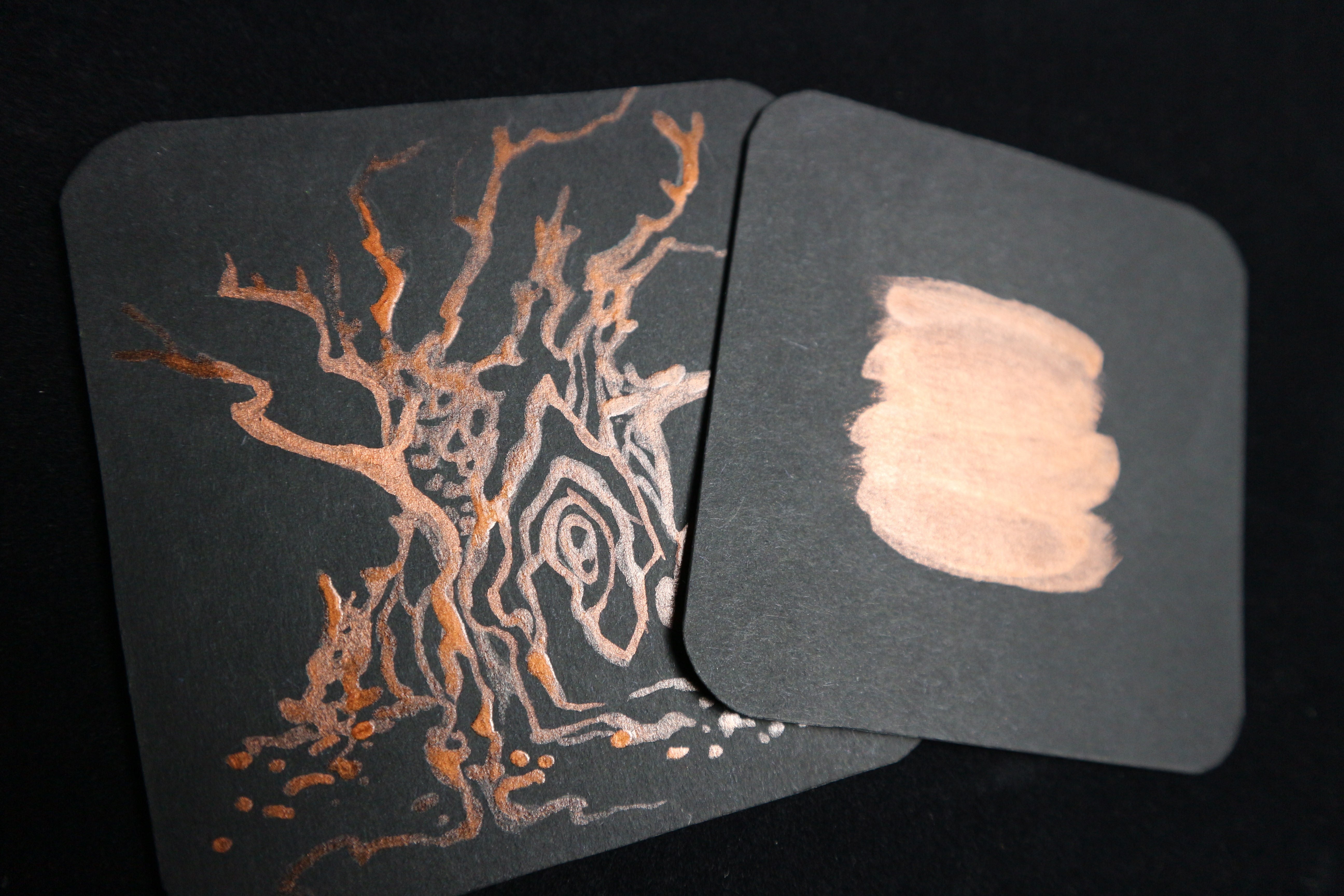 Если затрагивать консистенцию, то в меди сверху в банке отделившиеся связующее, которое следует перемешать перед применением, как в случае с любыми металлами с большим количеством металлической взвеси (как например в туши). Если наклонить баночку, видно, как потоки взвеси текут по связующему, как их много и как они сияют. В российской гуаши, такого эффекта не наблюдается, она достаточно однородная и немного густая масса с блёстками по массе.