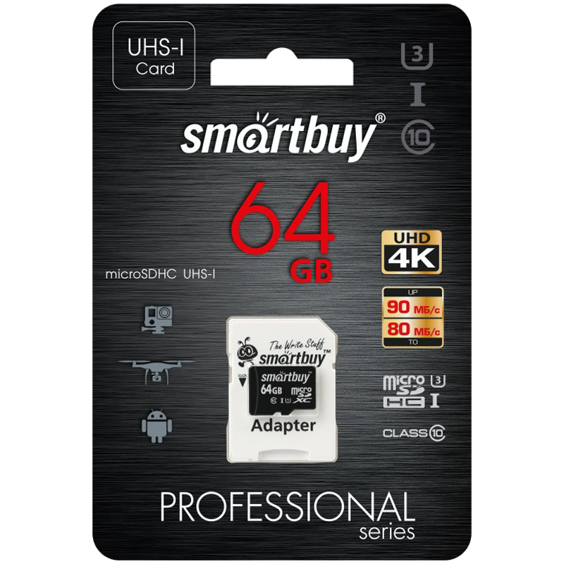 Карта памяти MicroSDXC 64GB PRO UHS-I, Class 10, скорость чтения 90Мб/сек (с адаптером SD)