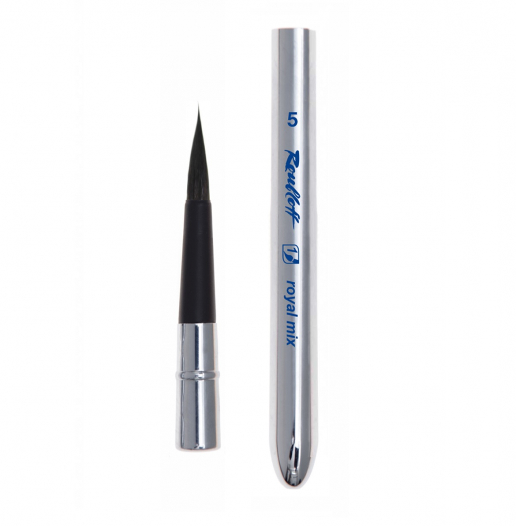 Roubloff royal mix - уникальная смесь из 3-х видов ворса разработанная на собственном экспериментальном участке Roubloff. Смесь содержит премиальный волос натуральной белки с непревзойденными природными свойствами набирать и удерживать воду, беличий волос придает комфортную для работы форму кисти с «брюшком». Смесь так же содержит два вида синтетического волоса, придающие волосяному пучку упругость и управляемость вершинки кисти. Упругий острейший кончик может рисовать тонкие контролируемые линии и мелкие детали, а сама кисть удерживает много воды и краски, подходит для заливок, лессировок и скетчей.
