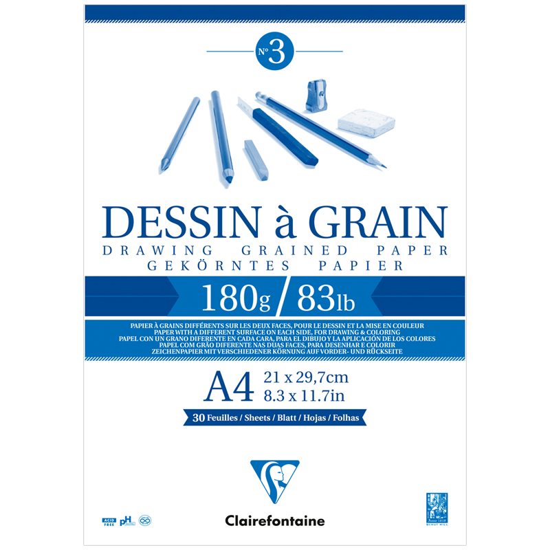 Блокнот Dessin a grain для черчения и рисования, белая зернистая бумага, 21х29,7 см, на спирали, 30 листов, 180 гр. , для работы карандашом, сангиной, углем, тушью, акварелью и гуашью