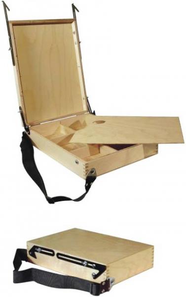 Внутреннее устройство этюдника представляет собой деревянный ящик, поделённый на 1 длинную секцию для хранения кистей и 3 прямоугольные - для красок и прочих вспомогательных художественных средств.