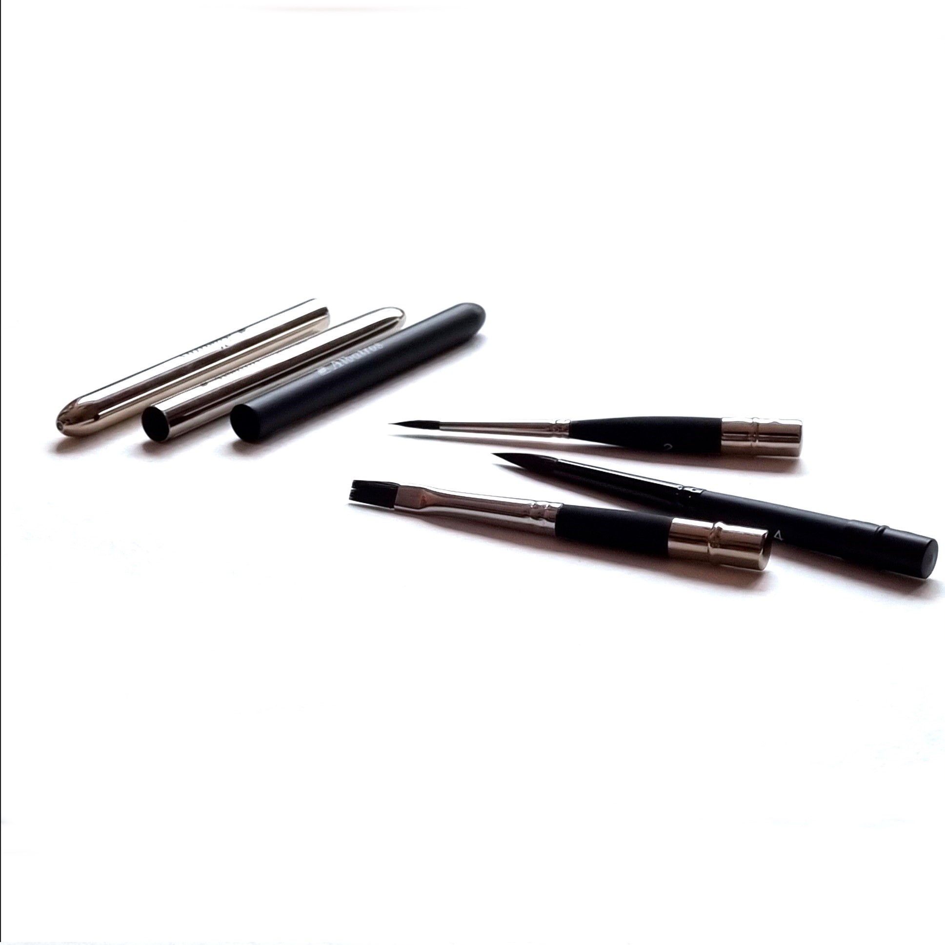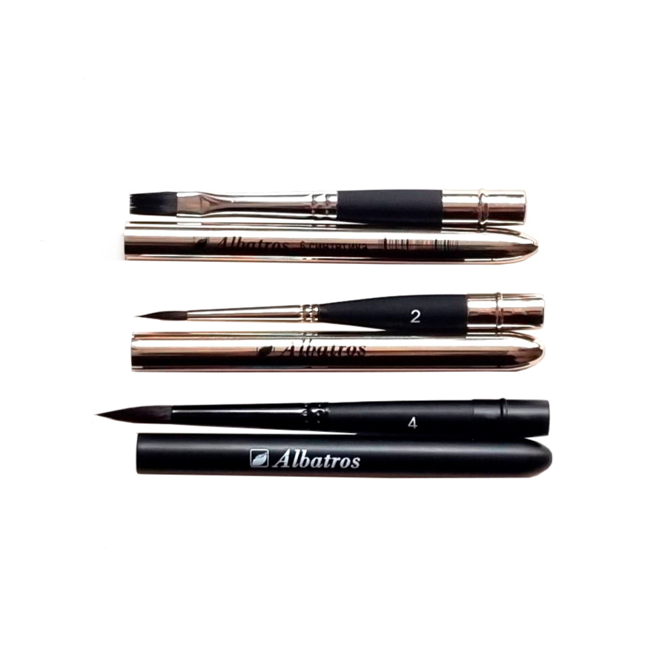 Данная серия кистей имеет особенность - металлический футляр, который во время работы превращается в ручку кисти путём её накручивания. А после завершения работы наконечник кисти выкручивается и помещается в футляр. Это позволит сохранить ворс кисти в отличном состоянии при транспортировке, а также значительно экономит место в пенале или рюкзаке. Отличный вариант для пленэров и путешествий.