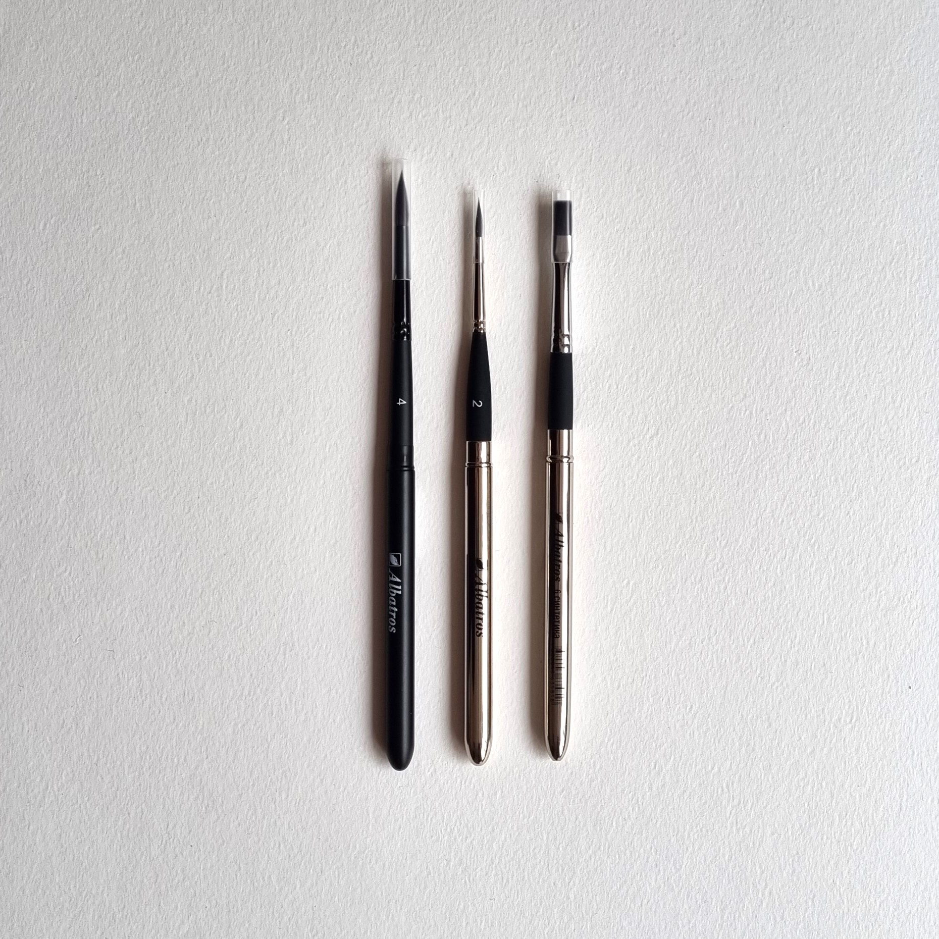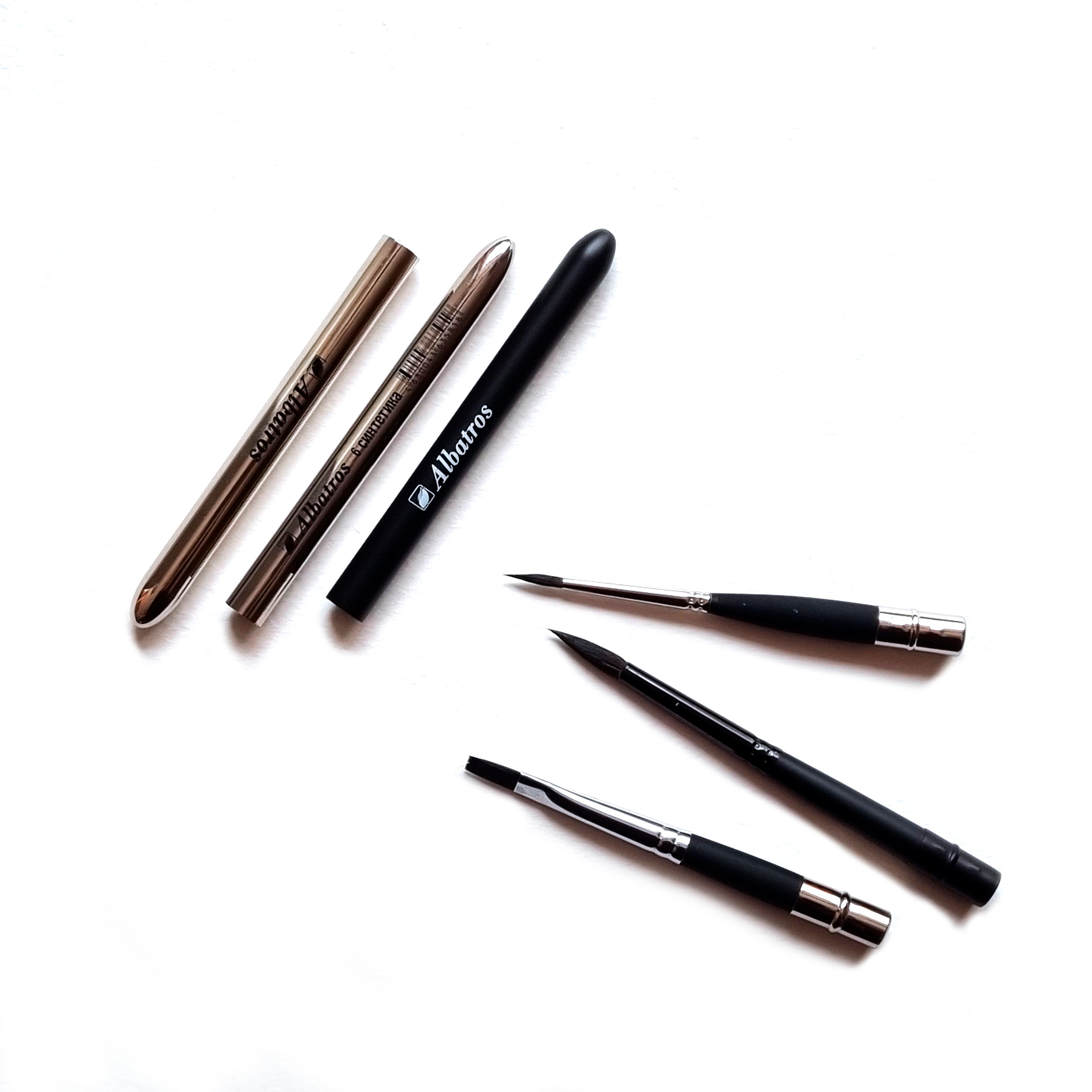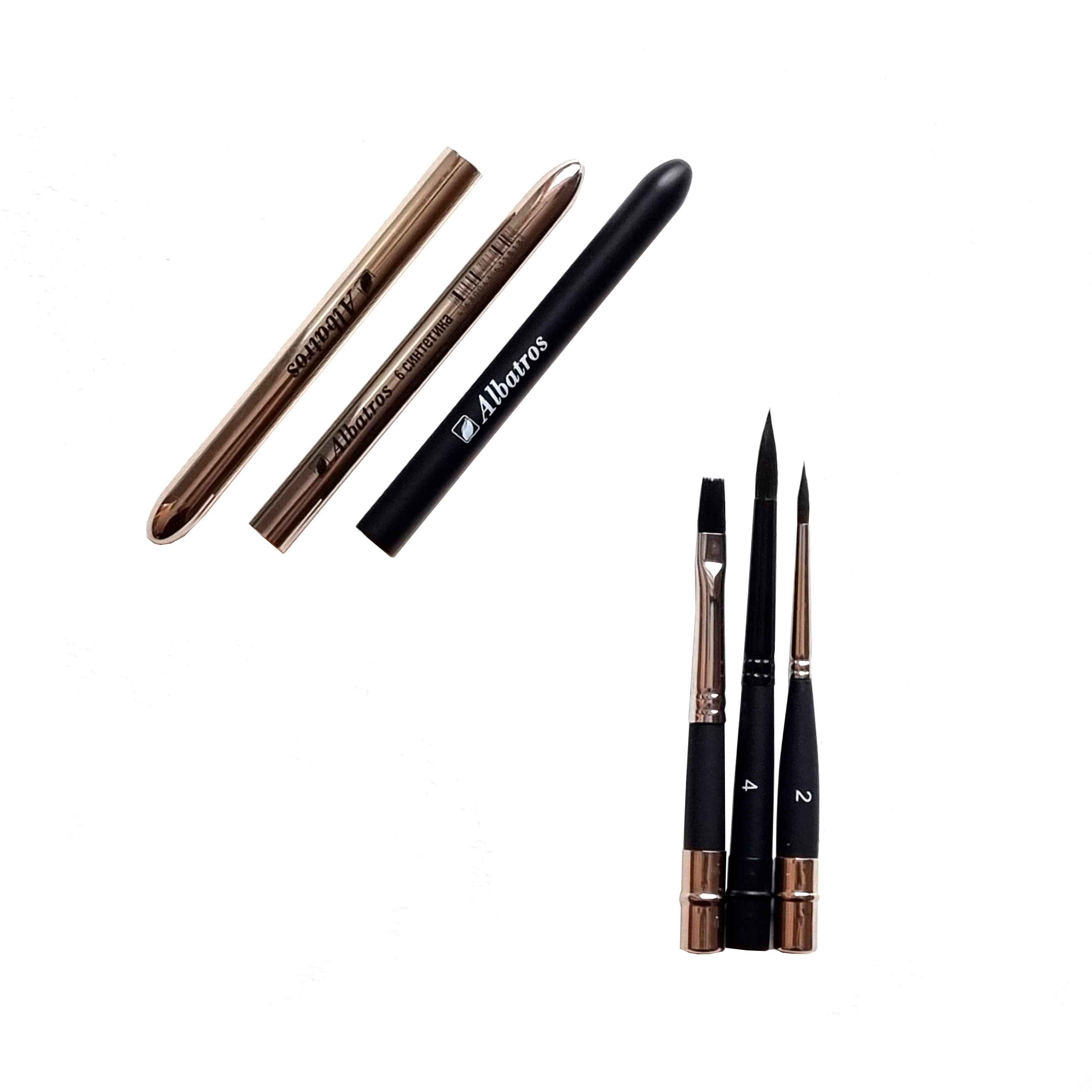 Комплект круглых и плоской синтетических художественных кистей из нейлона (имитация белки) от отечественного производителя АЛЬБАТРОС.