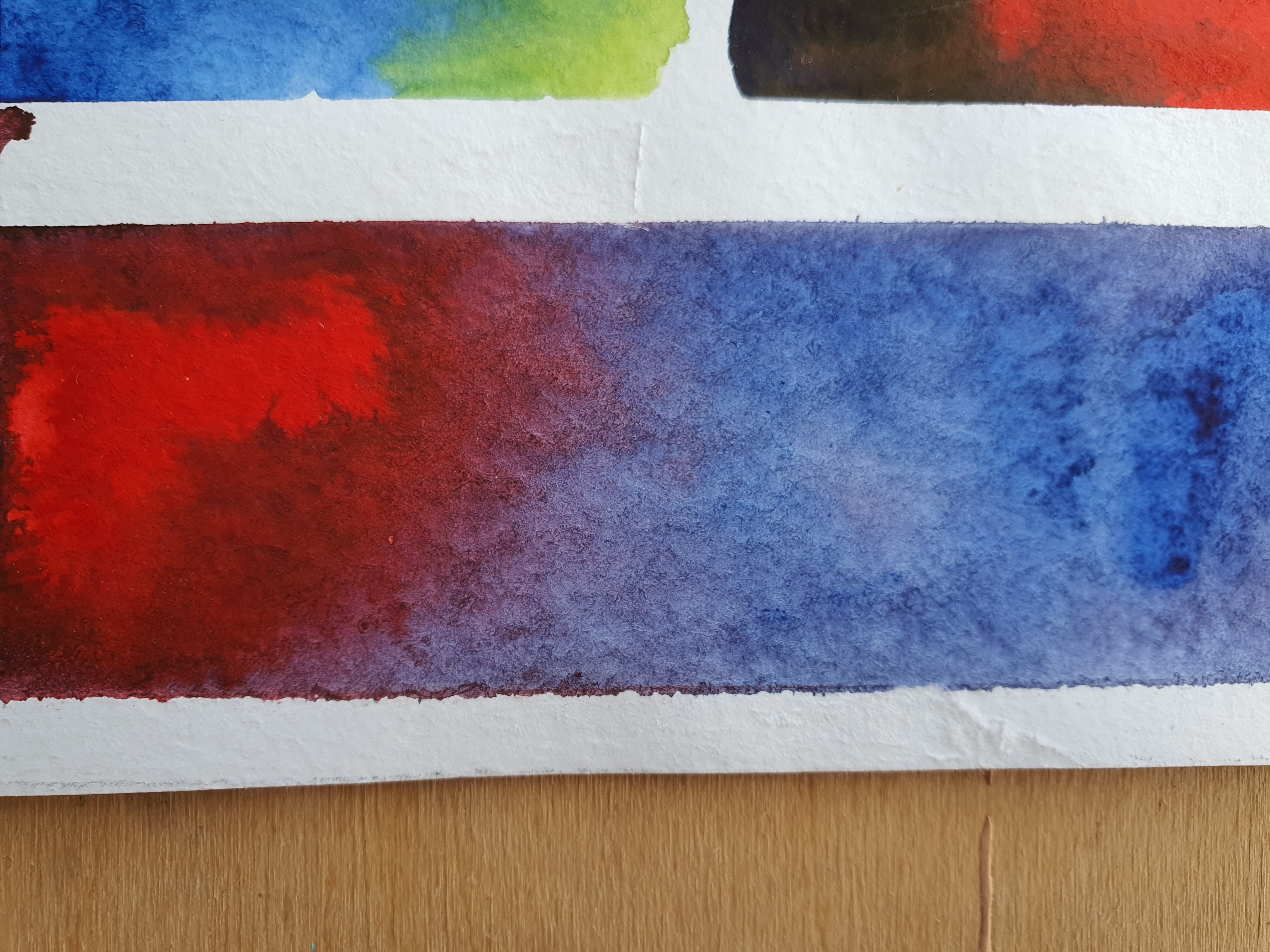 В ещё влажном виде результат казался катастрофой: затекание под скотч, вспухивание бумаги, образование луж, пигменты словно сражались друг с другом, краска, словно скатывалась с поверхности и её несло хаотично.