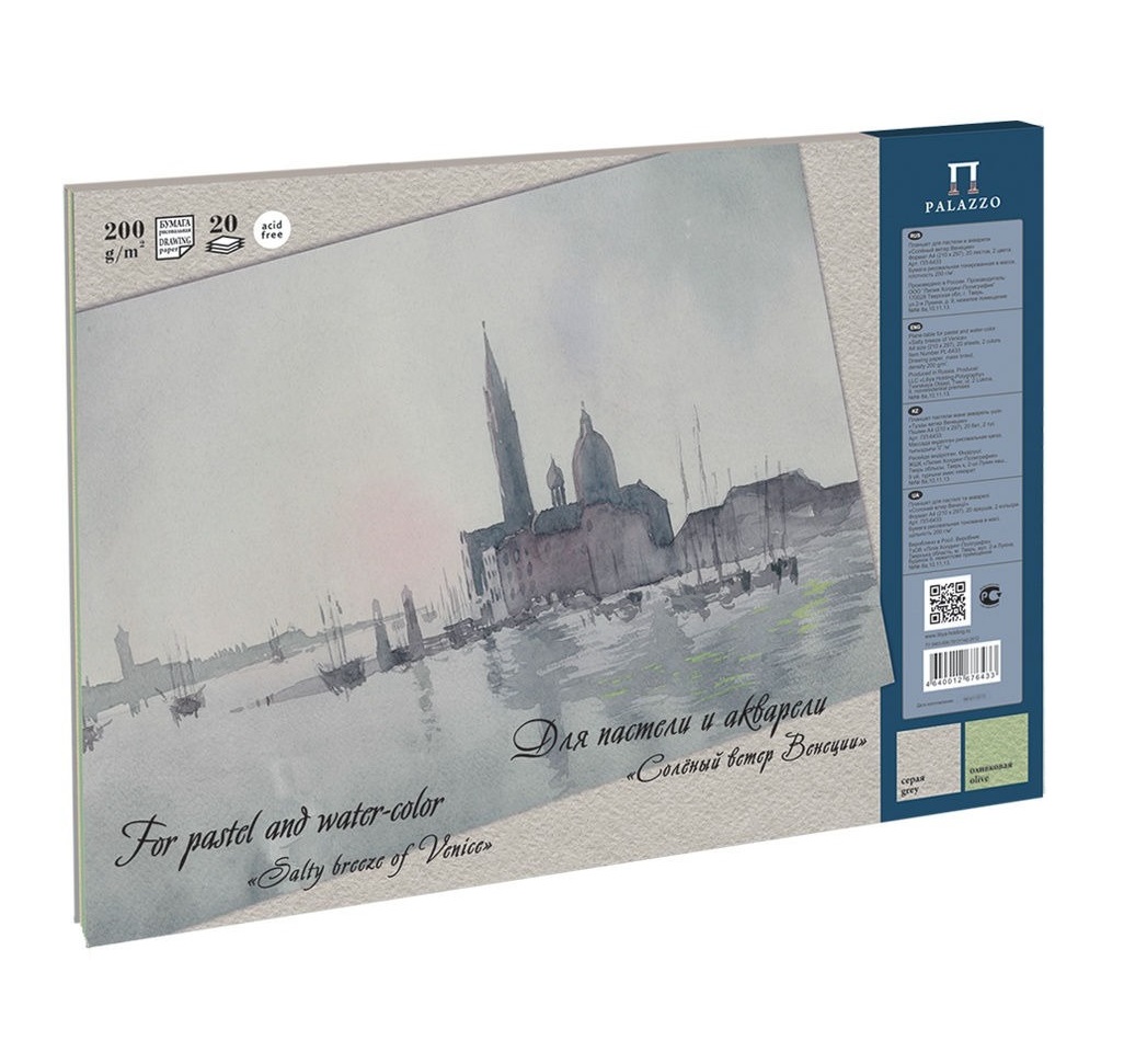 Планшет для акварели и пастели "Соленый ветер Венеции" , 200 г/м2, 210*297 мм. состоит из 20 листов листов рисовальной бумаги двух цветов (10 листов серого цвета и 10 листов оливкового цвета) плотностью 200 г/м2.