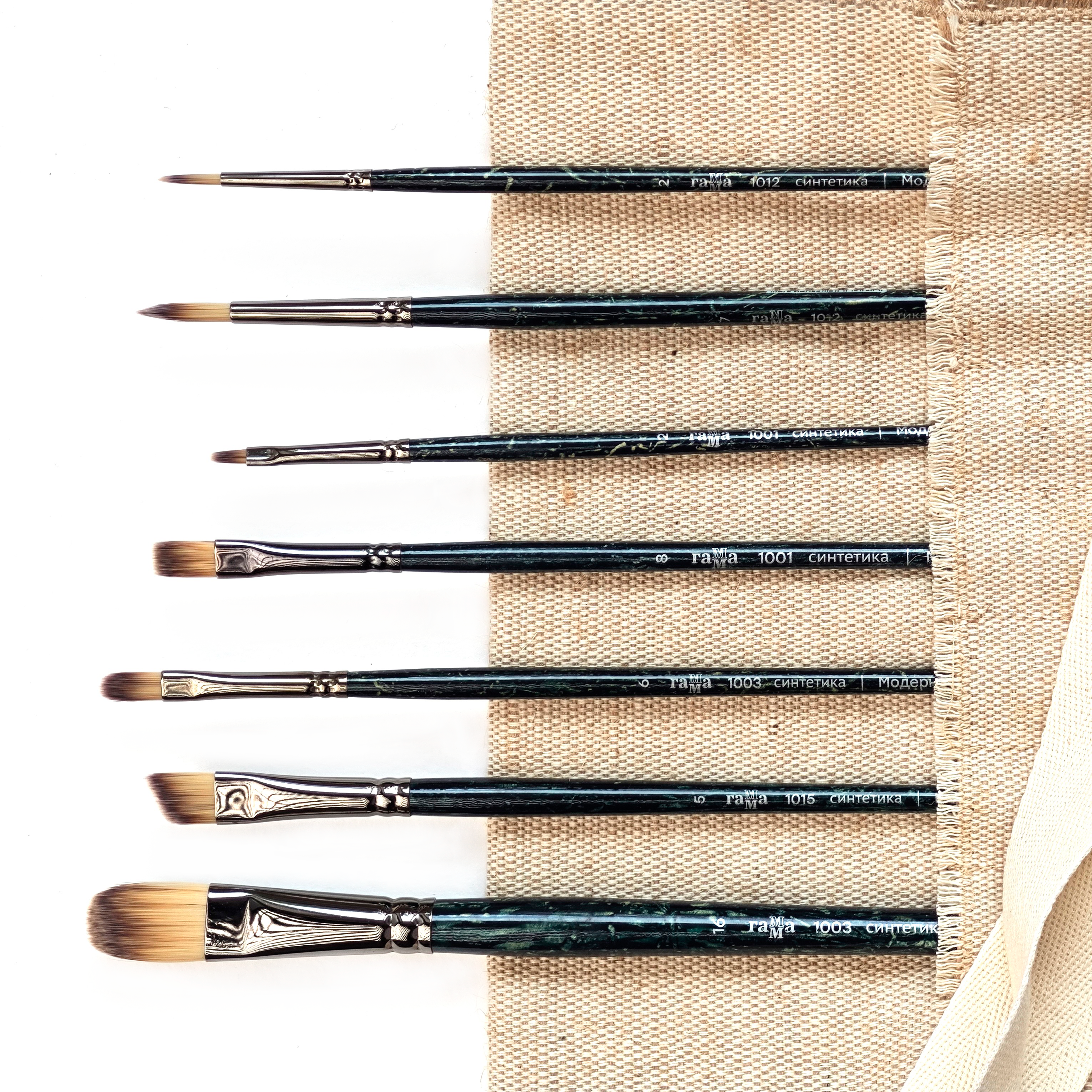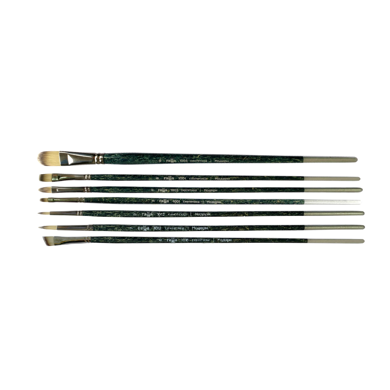Комплект из 7-ми кистей серии "Модерн" от российского производителя Гамма представлен художественными кистями с разной формой мазка на длинной ручке.