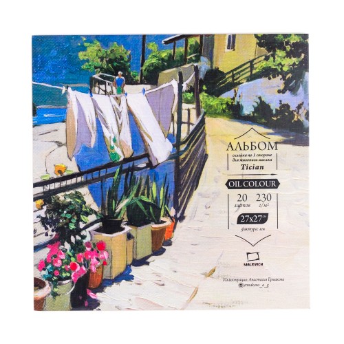 Альбом-склейка по короткой стороне, блок выполнен из специальной бумаги для масляных красок с тиснением лён плотностью 230 г/м. Бумага натурального белого цвета с специальной пропиткой, благодаря которой масло и разбавитель не впитываются в бумагу и она не промокает. Бумага гораздо экономичнее холстов, поэтому её очень удобно использовать для ученических работ. После высыхания лист можно легко отделить от склейки.