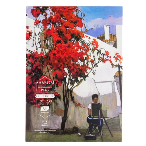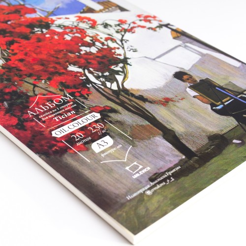 Альбом-склейка по короткой стороне, блок выполнен из специальной бумаги для масляных красок с тиснением лён плотностью 230 г/м. Бумага натурального белого цвета с специальной пропиткой, благодаря которой масло и разбавитель не впитываются в бумагу и она не промокает. Бумага гораздо экономичнее холстов, поэтому её очень удобно использовать для ученических работ. После высыхания лист можно легко отделить от склейки.