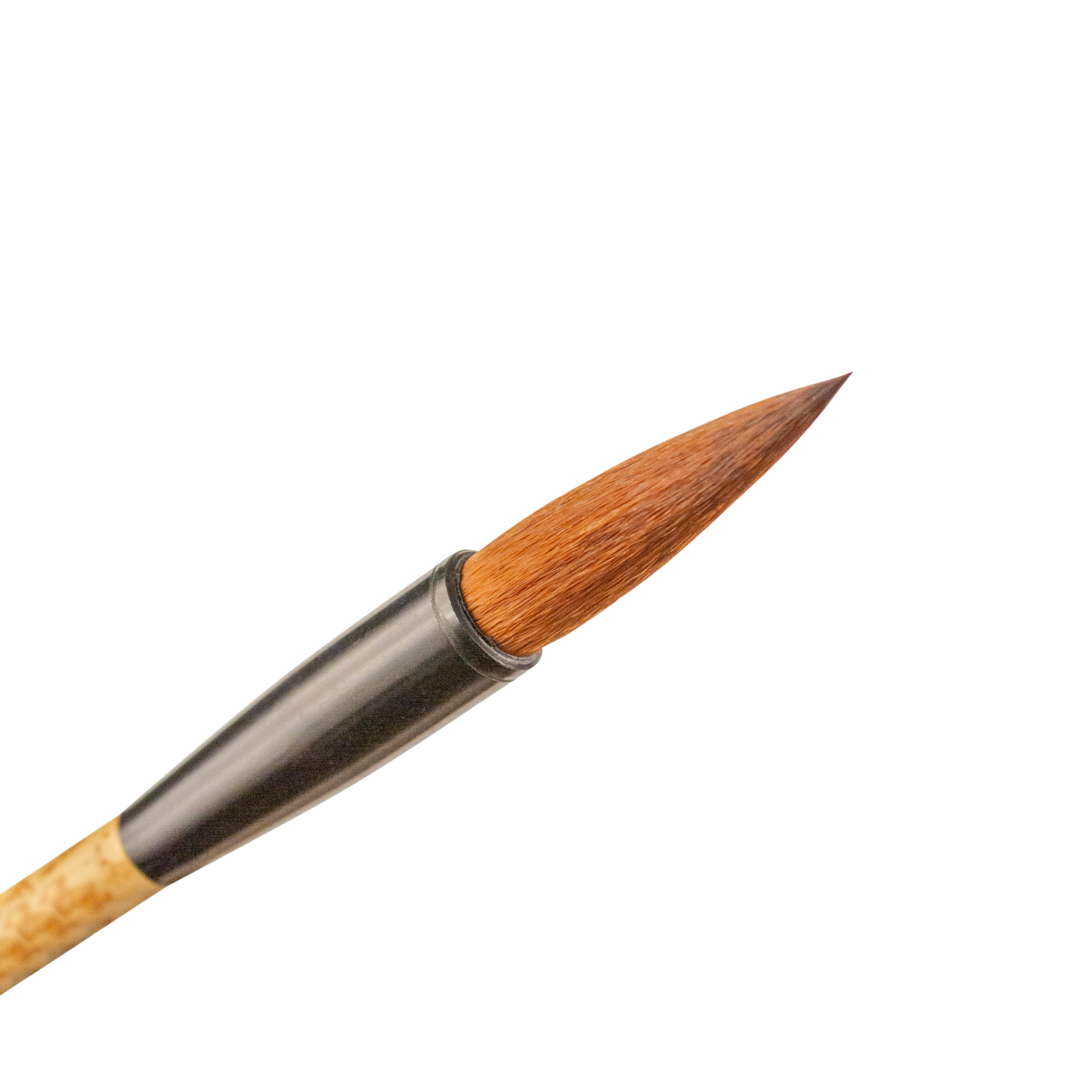 Круглая синтетическая кисть для каллиграфии. Синтетический ворс упругий, универсальный и устойчивый. Кисть хорошо набирает и отдает тушь, можно использовать для работы с водными красками. Качественная сборка позволяет кисти держать острую вершинку для создания самых тонких элементов.