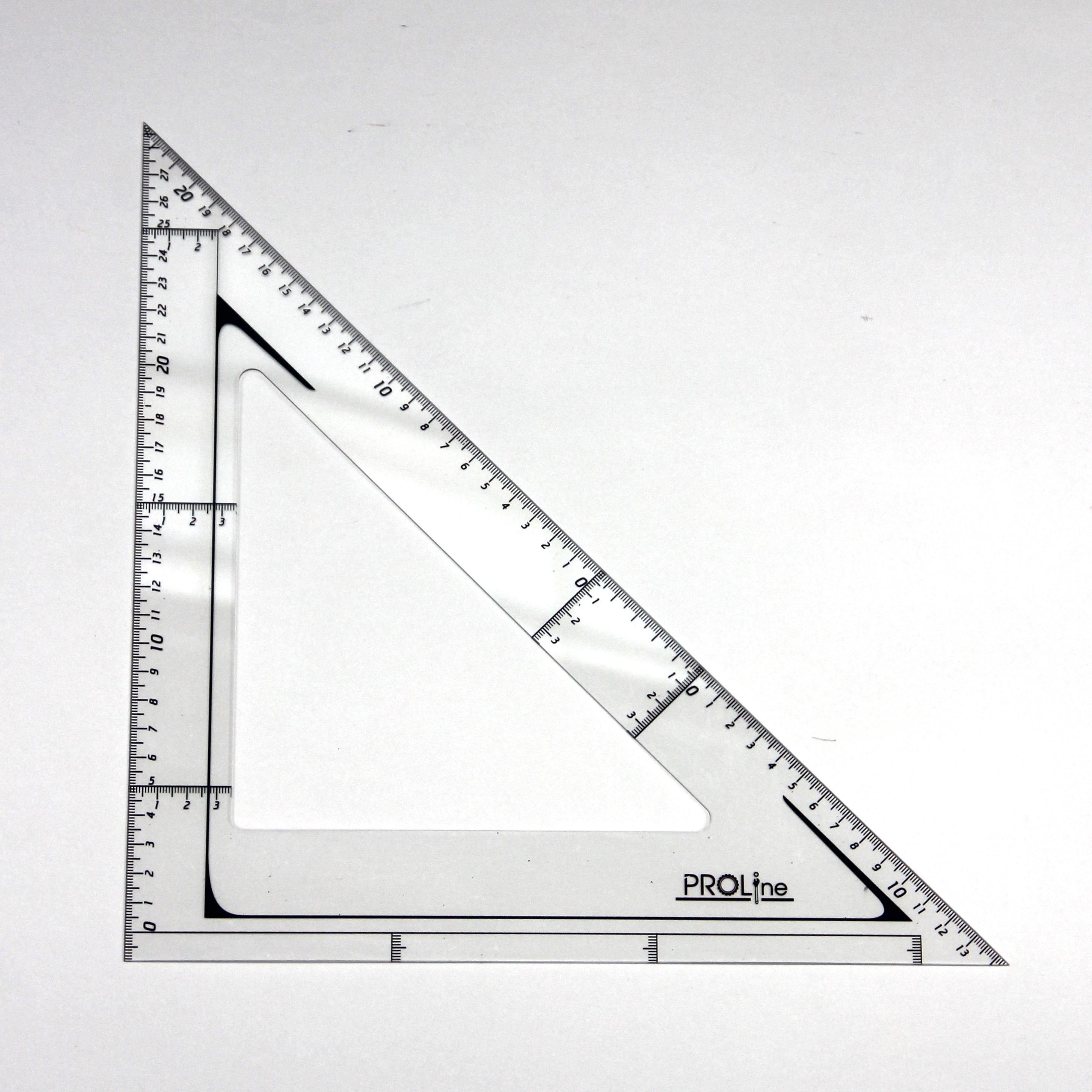 Угольник имеет фаски с нижней стороны по всему периметру, что позволяет чертить изографом или рапидографом, не переворачивая инструмент и не боясь что тушь затечёт под угольник.