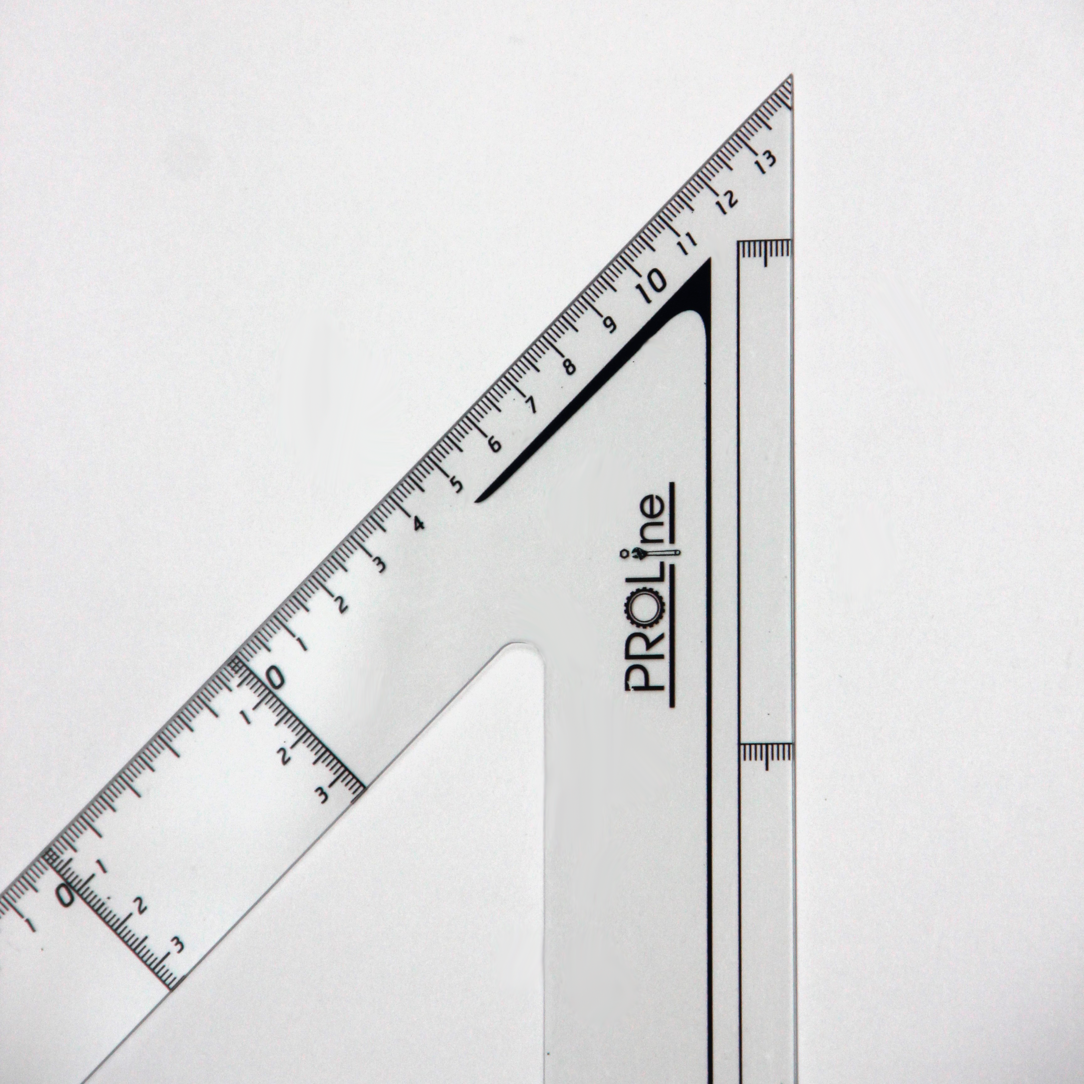 Присутствует отступ от края величиной 1 см с разметкой, что позволяет измерять как от нуля так и от края угольника. Нулевая риска продлена вдоль всего угольника, для гораздо более удобного черчения и измерения перпендикулярных линий.
