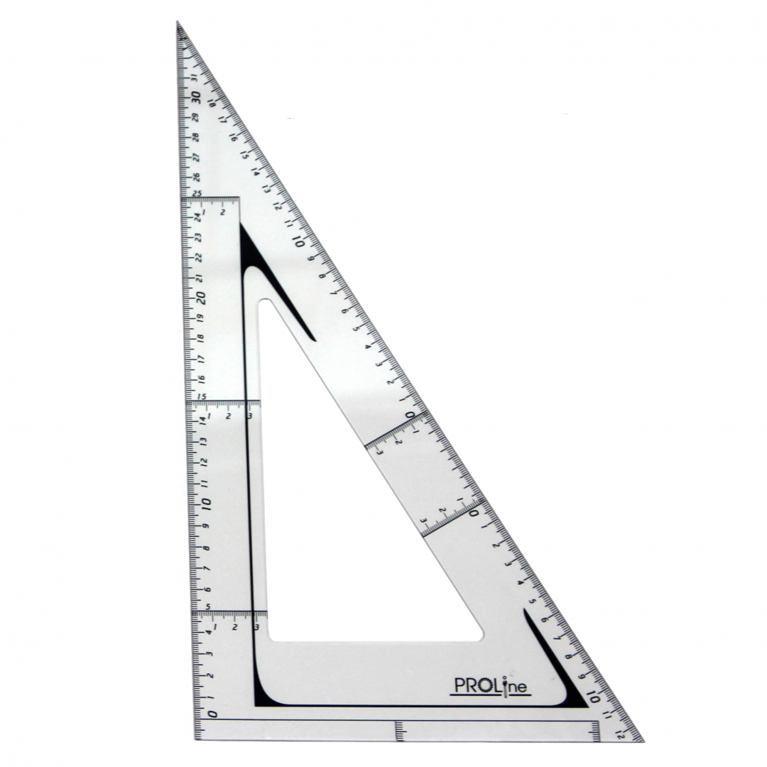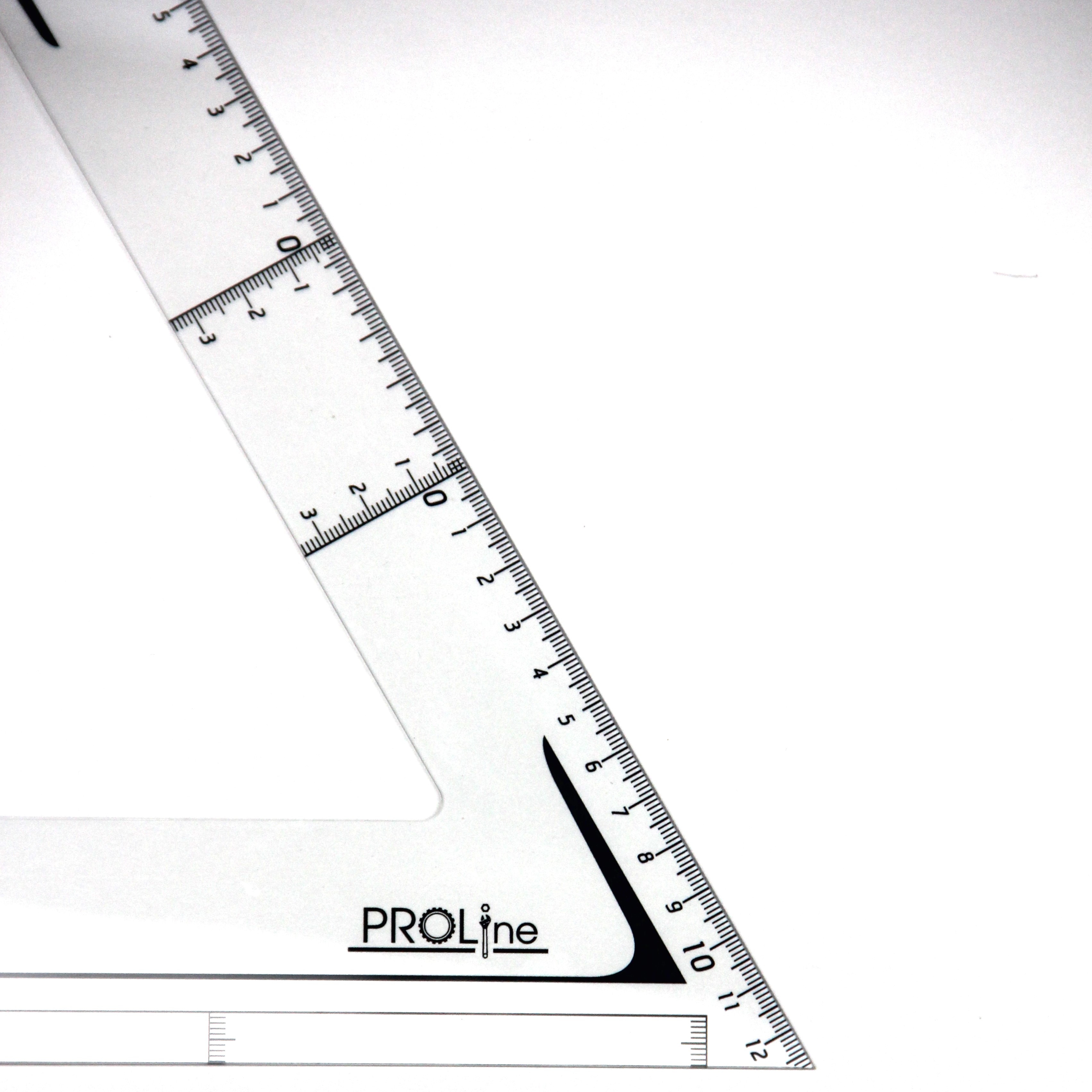 Присутствует отступ от края величиной 1 см с разметкой, что позволяет измерять как от нуля так и от края угольника. Нулевая риска продлена вдоль всего угольника, для гораздо более удобного черчения и измерения перпендикулярных линий.