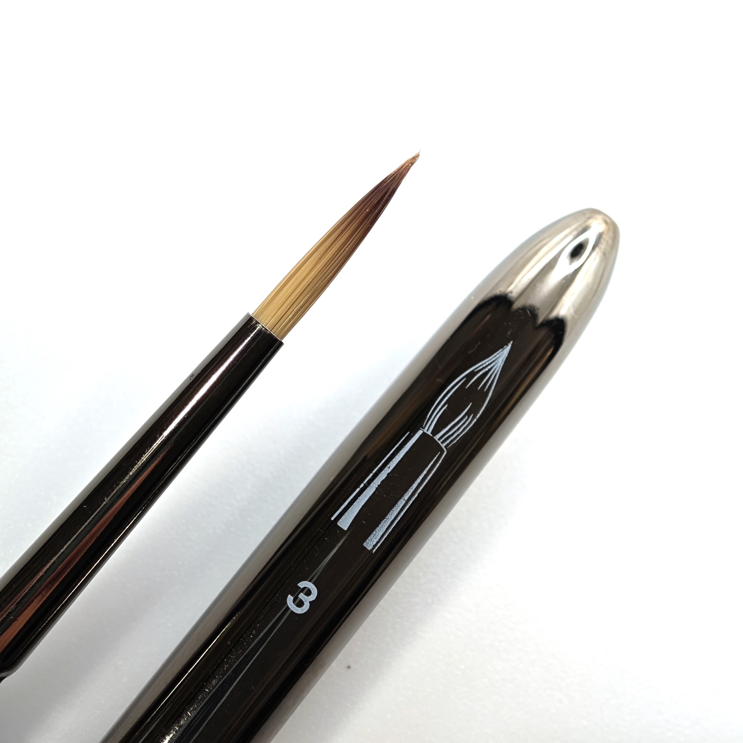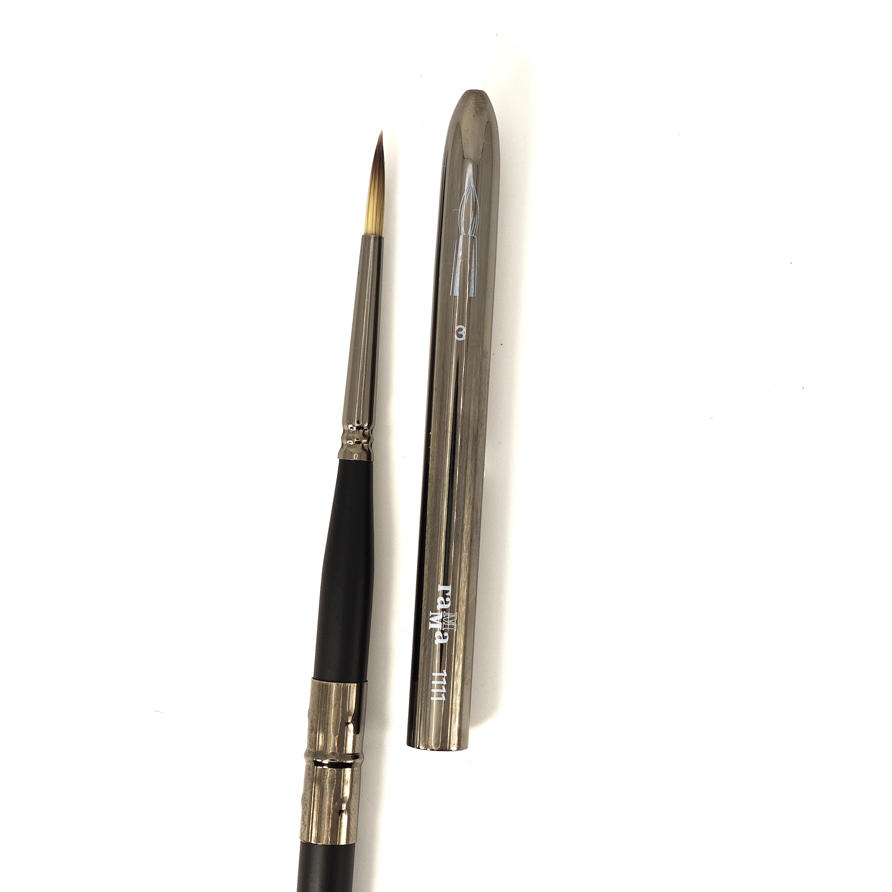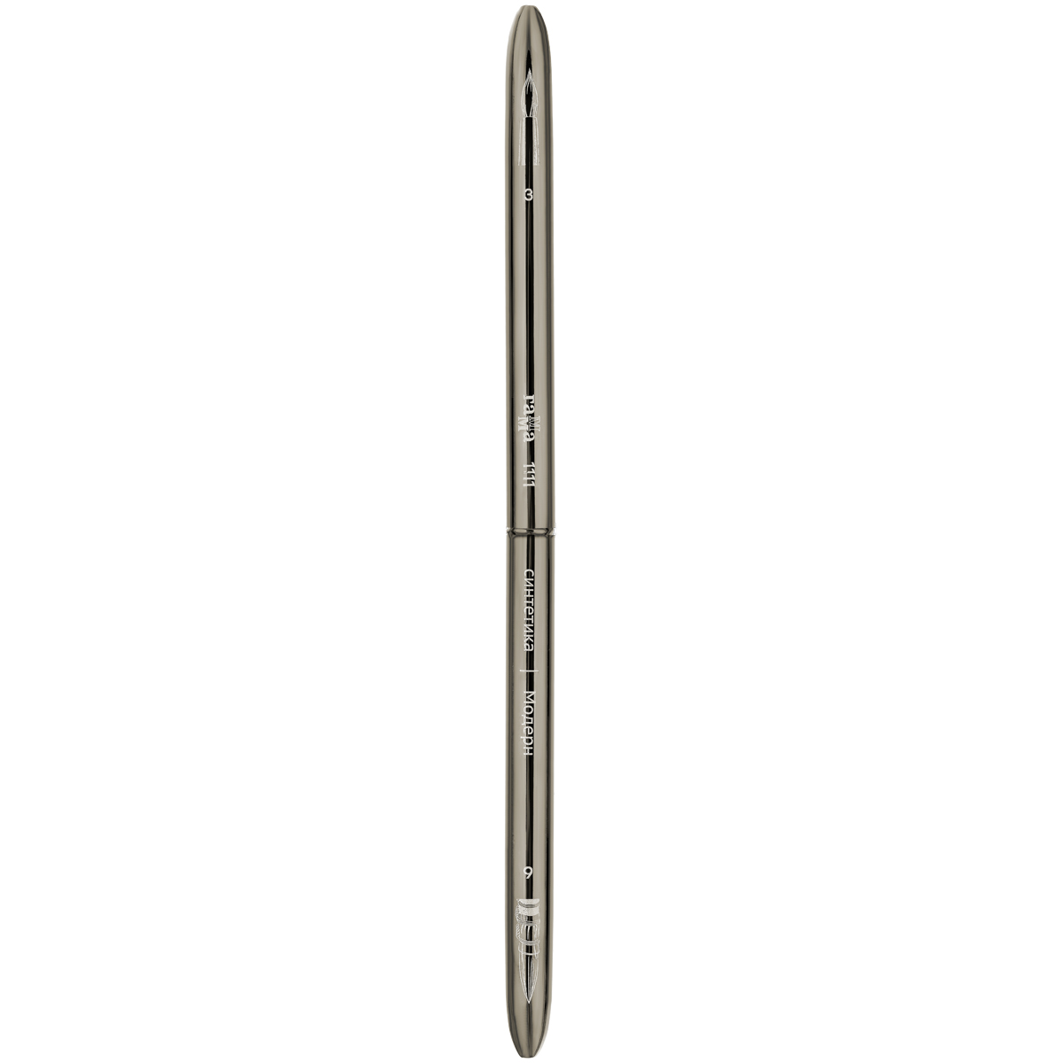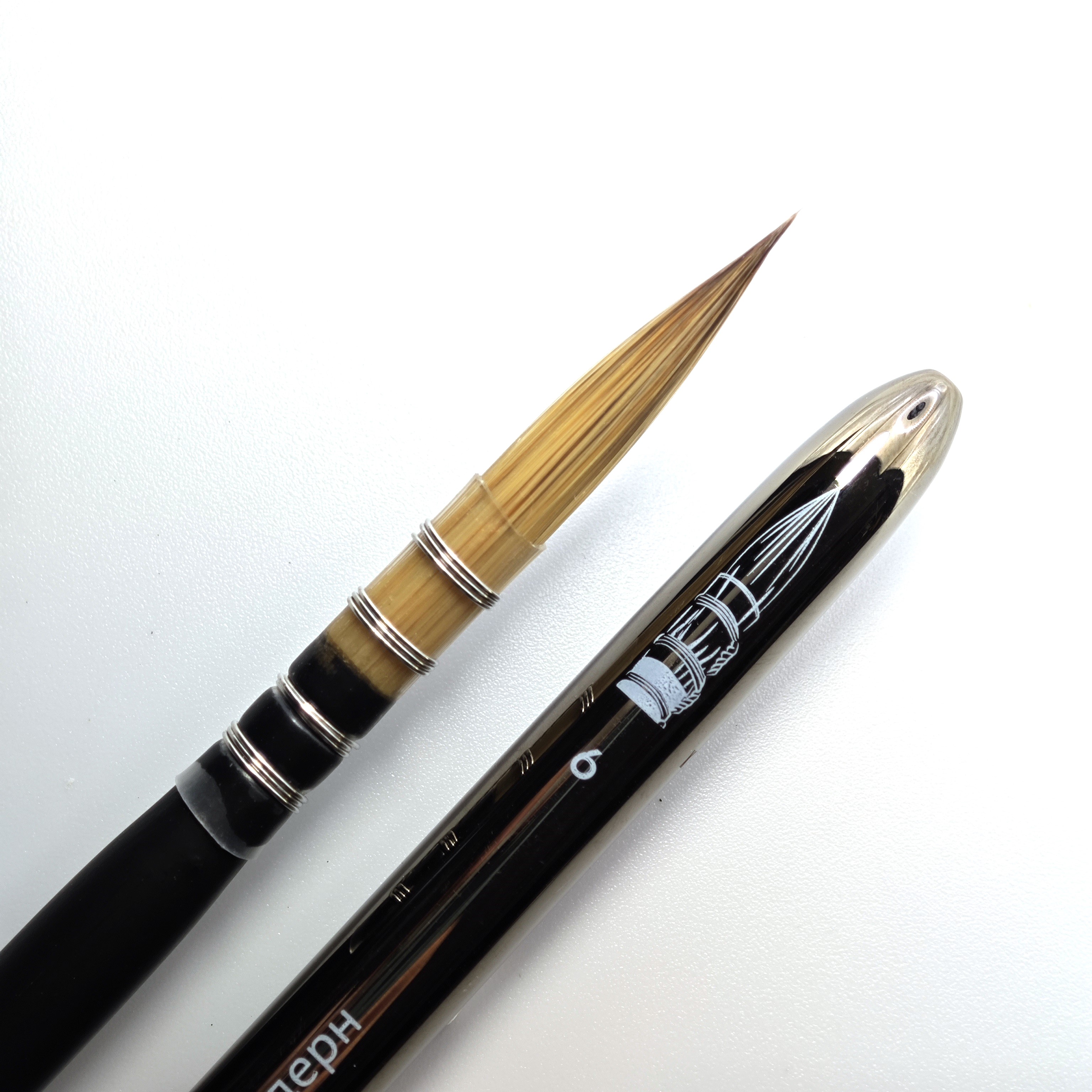 Корпус и обойма выполнены из никелированной латуни темного цвета с жемчужным эффектом, ручка кисти из березы, покрытая матовым лаком. Кисть в индивидуальном пакете.