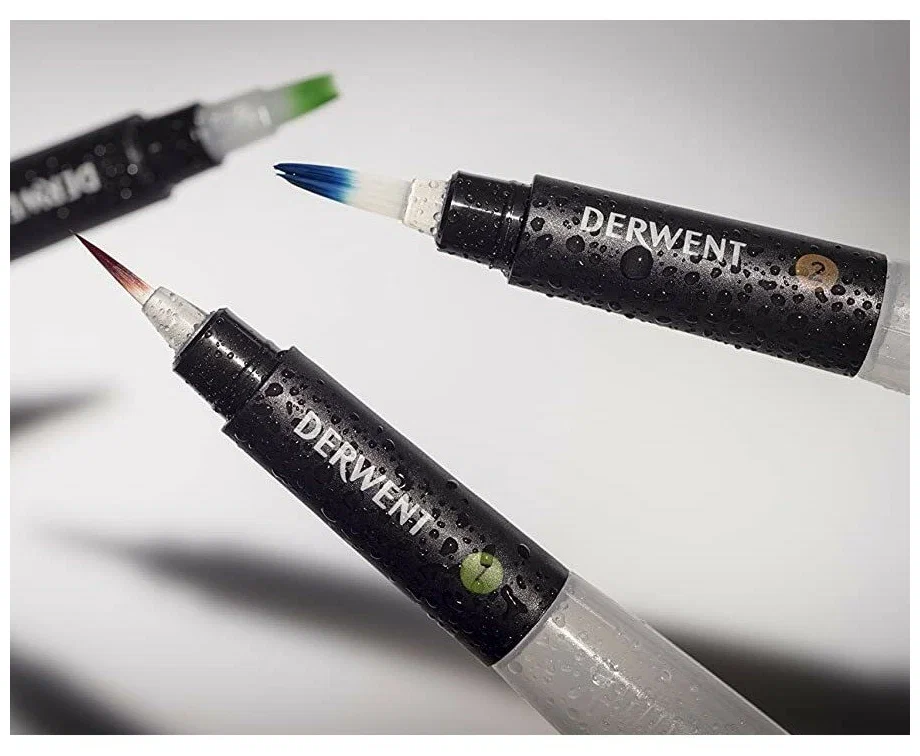 Кисти с резервуаром для воды Derwent "Waterbrushes" разработаны специально для работы на пленэре. Кисти отличаются компактностью, герметичностью и легко промываются водой. Благодаря прочному клапану вы без труда сможете дозировать нужное количество воды. Для удобства использования все кисти пронумерованы в зависимости от размера и формы наконечника.