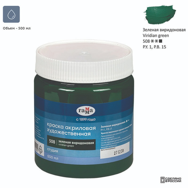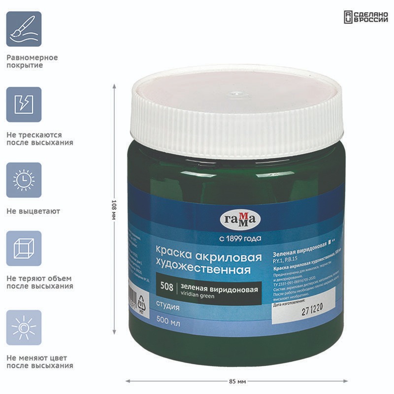 Новые акриловые краски "Студия" предназначены для художественно-живописных и декоративно-прикладных работ. Их отличают насыщенные цвета, высокая адгезия, отличная прочность. После высыхания становятся глянцевыми, практически не темнеют, специальные добавки позволяют максимально раскрыть красоту цвета. Акриловые краски "Студия" обладают густой консистенций, высокой разносимостью, позволяя писать в различных техниках живописи. Время высыхания от 10 минут до 1 часа в зависимости от толщины слоя краски. Подходят для бумаги, картона, грунтованного холста, дерева, стекла, кожи, ткани. Большая банка - больше возможностей для творчества.