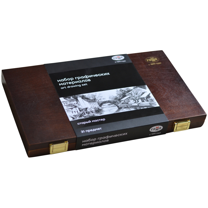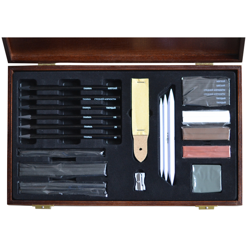 В подарочном наборе собран широкий ассортимент материалов для выполнения работ в различных техниках графики: