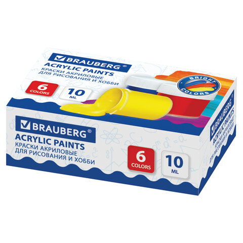 Акриловые краски BRAUBERG отлично подойдут для рисования и оформительских работ. Яркие, насыщенные цвета отлично смешиваются, не тускнеют после высыхания и не выгорают при воздействии солнечных лучей. Легко наносятся практически на любую поверхность.