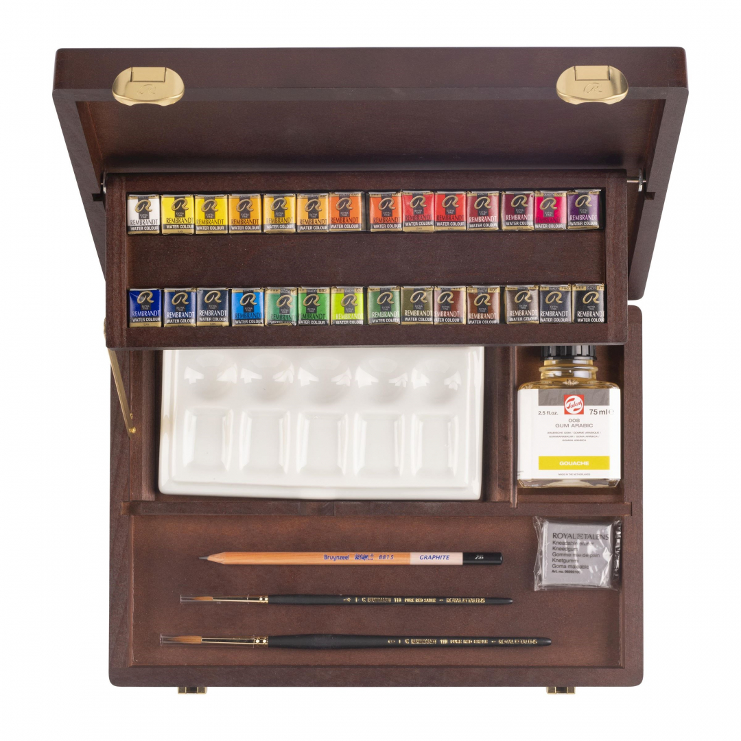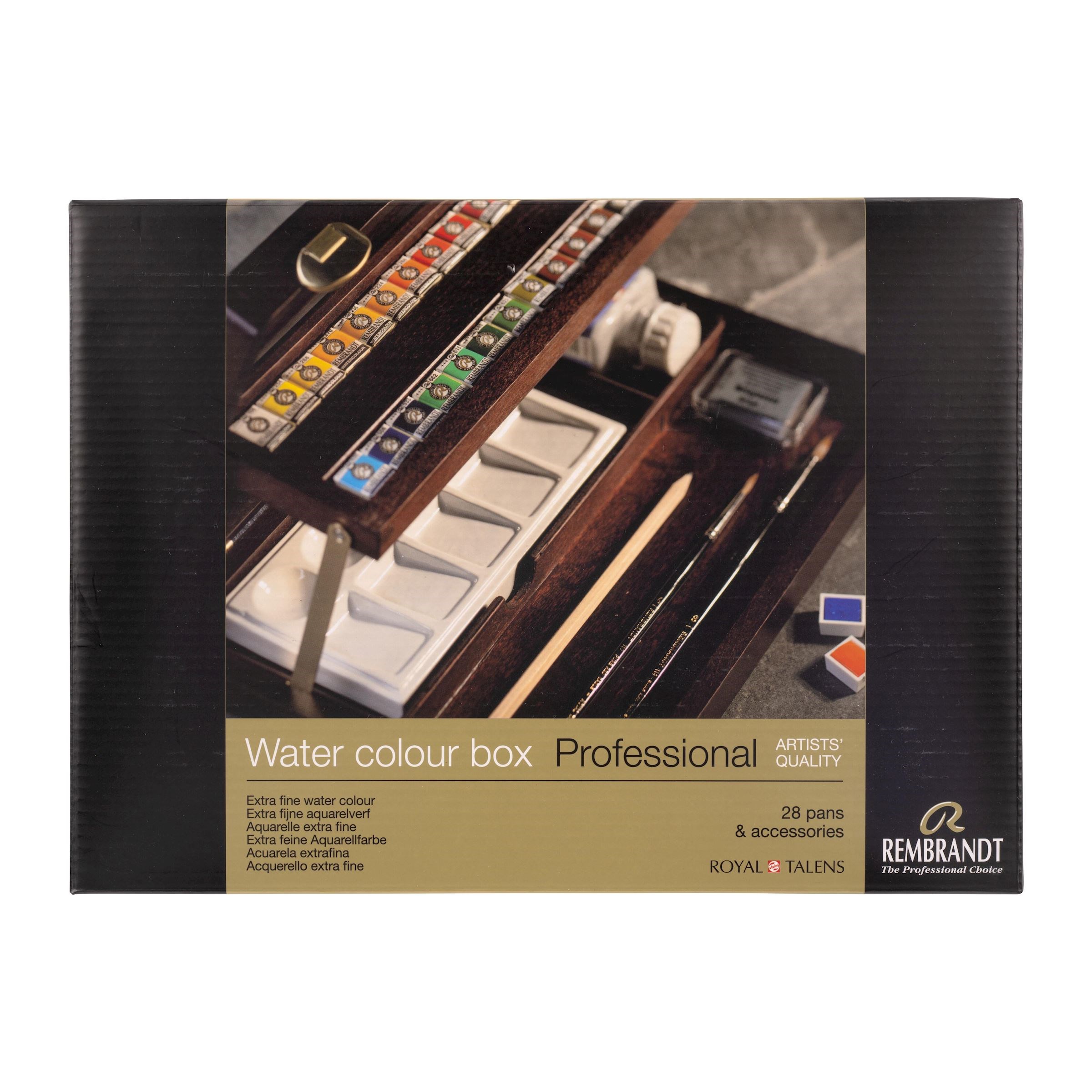 Акварель Royal Talens Rembrandt произведена из гуммиарабика и пигментов без наполнителей. Технология производства неизменна с 1899 года. Благодаря высокой насыщенности пигментами и превосходной светостойкости, акварели Rembrandt отдают предпочтение многие художники-акварелисты во всём мире. Светостойкость большинства цветов более 100 лет (при музейных условиях хранения). В наборе 28 кювет объёмом 1.3мл. Акварель для кювет Royal Talens предварительно запекается в специальных печах и нарезается вручную, после чего вставляется в кюветы. В процессе запекания из акварели выгоняются пузырьки воздуха, благодаря чему в объём 1,3мл умещается краски не меньше, чем в кюветы 2,5мл, в которые акварель налита в жидком виде и высушена естественным образом.