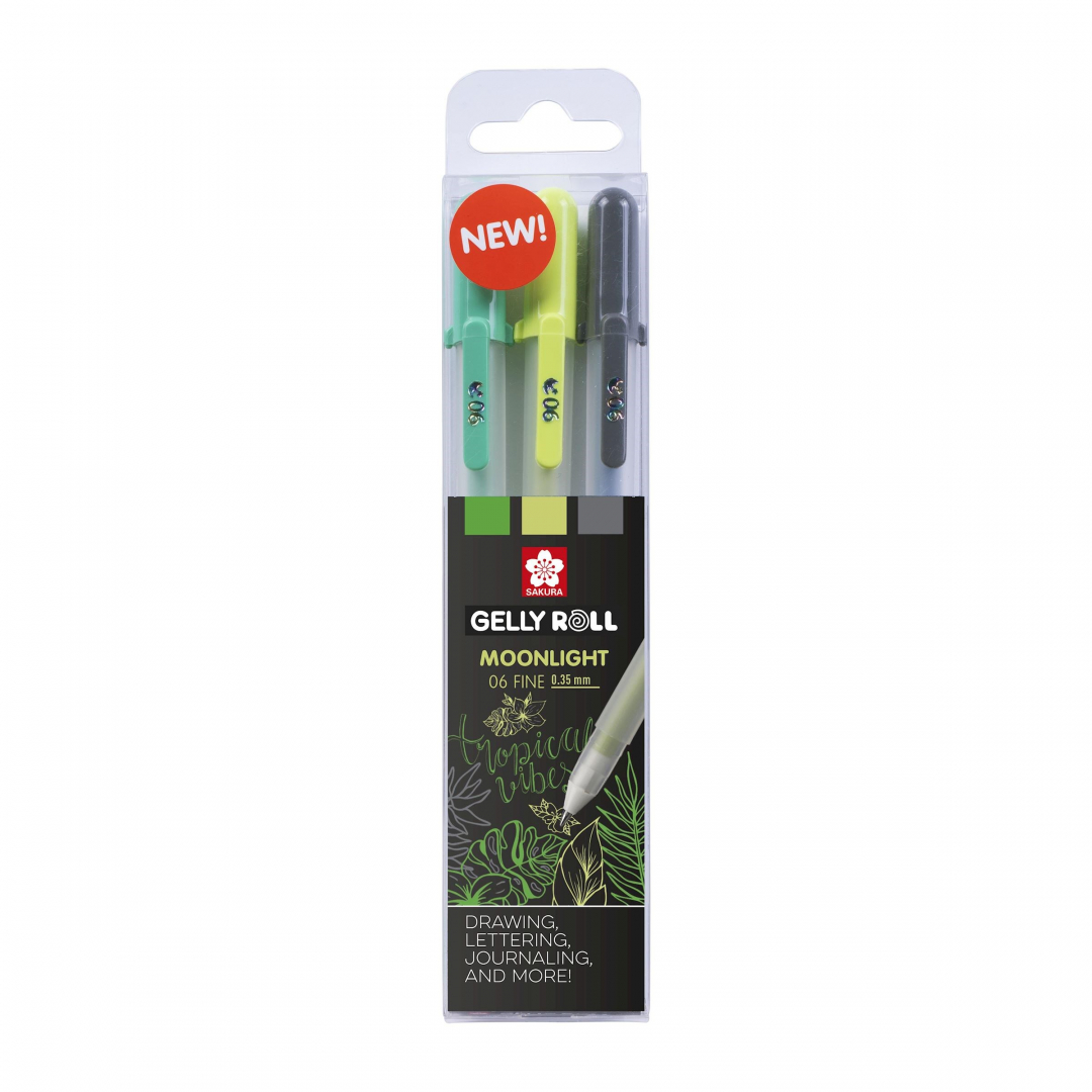 Гелевые ручки от японского производителя Sakura серии "Gelly Roll Moonlight" имеют самые яркие и ядерные цвета семейства "Gelly Roll". Мощные, гладкие, непрозрачные чернила идеально подходят для рисования скетчинга и надписей. Все цвета яркие на белой бумаге и производят выдающиеся эффекты на черной бумаге, а флуоресцентными лампами можно подсветить чернила "Gelly Roll Moonlight".